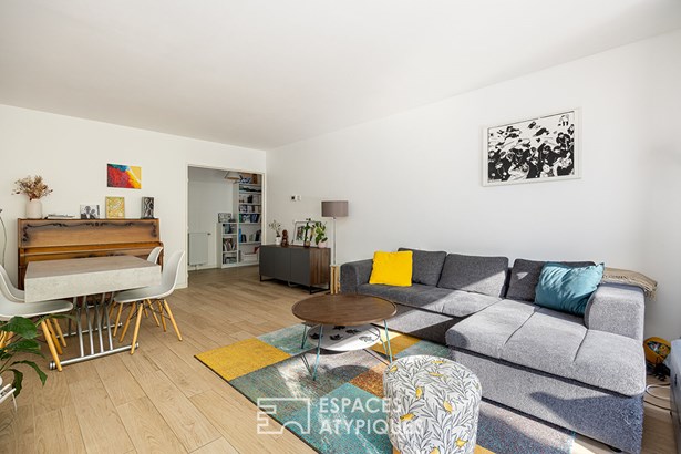 The distinct sleeping area houses two bedrooms with built-in walk-in closets, both with direct access to the terrace. A contemporary bathroom and separate toilet complete this modern and optimized apartment. The materials, the chosen colors, and the successive renovations reflect a particular attention paid to the quality of daily life.