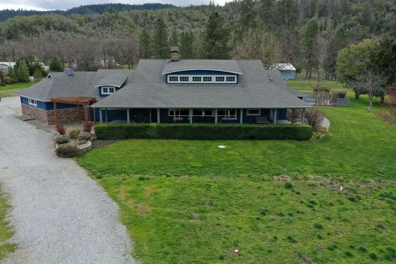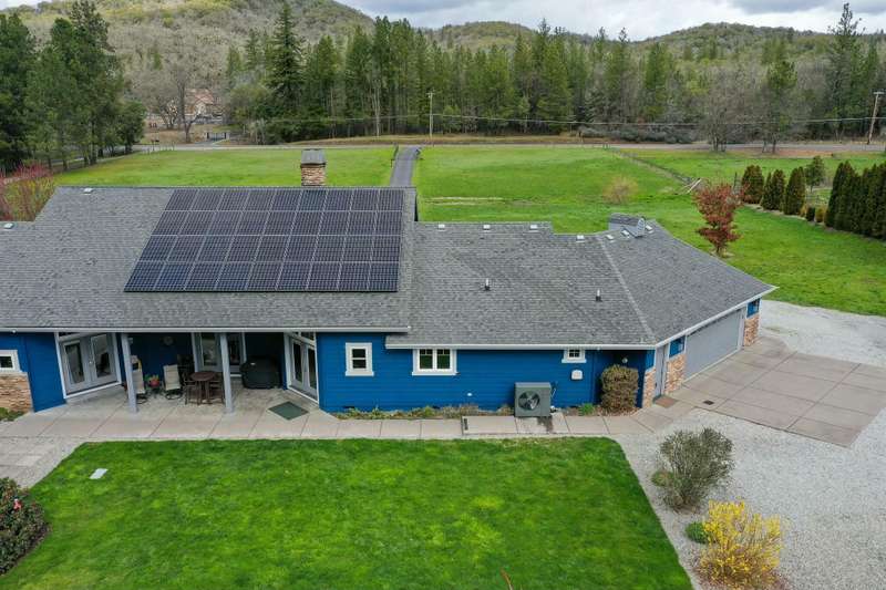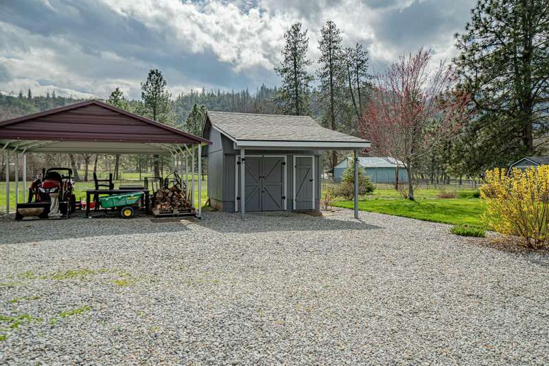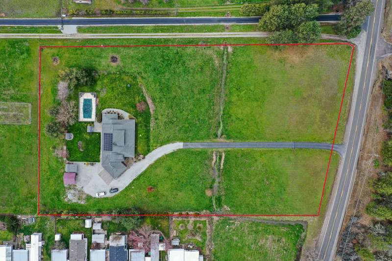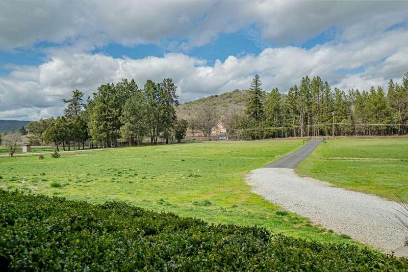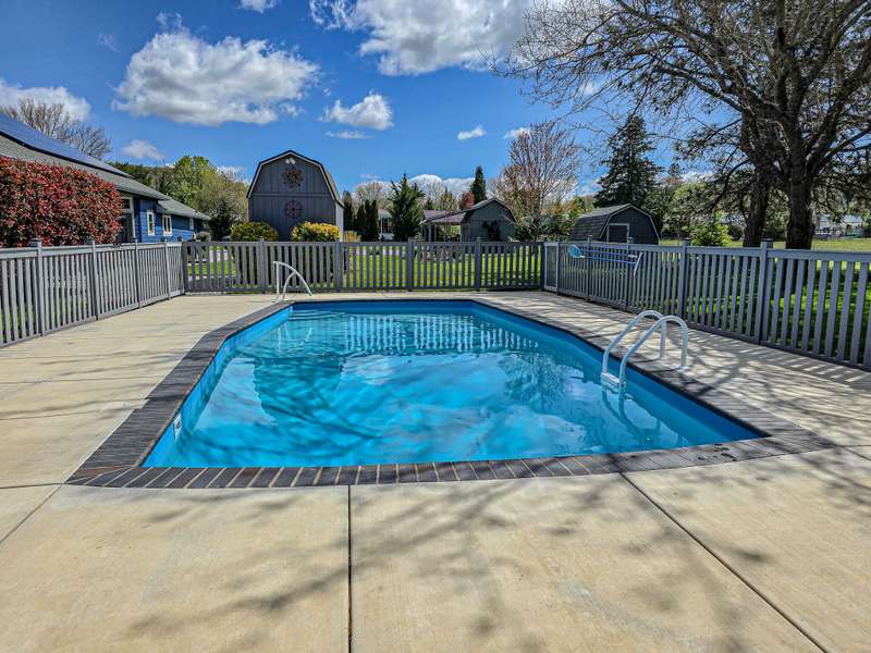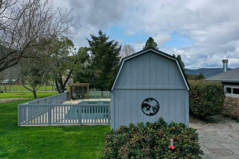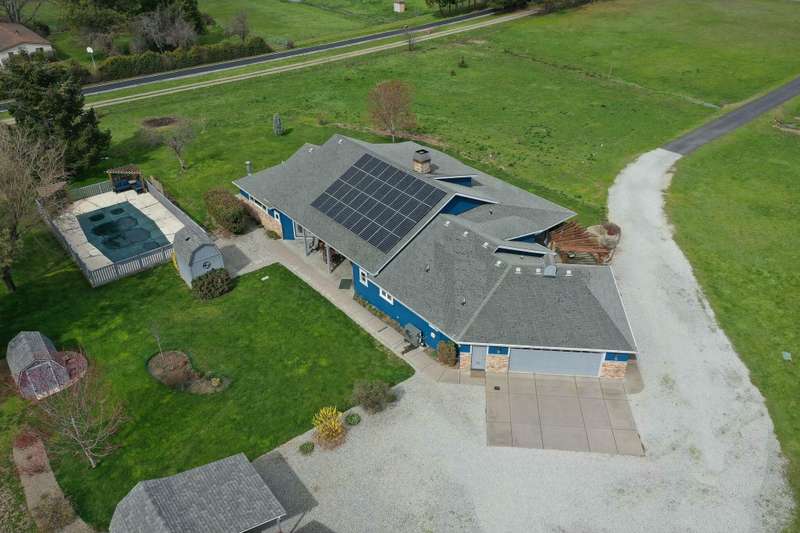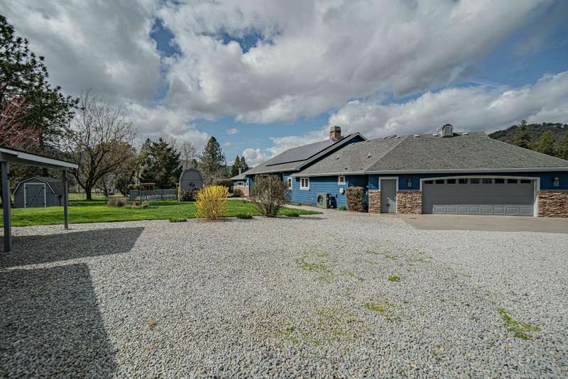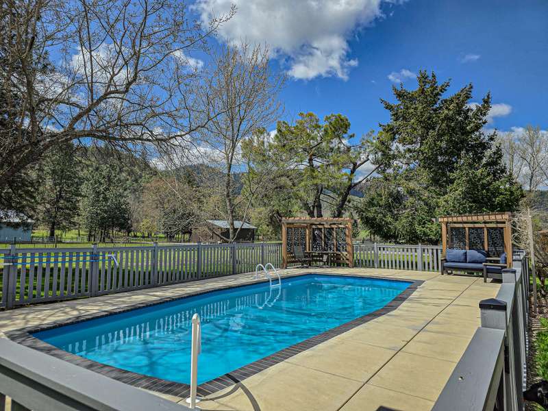 Stunning single-level home, built by Chamberlain Homes in 2007 located on Old Stage Road. Property boasts a custom design w/an additional private living space, w/separate entrance, bedroom & mini kitchen. Enjoy the in-ground swimming pool with a Safe-T-Cover. Inside, you'll find upgrades, including vaulted ceilings, living room w/wood-burning stove, & modern kitchen complete w/island, granite countertops, custom cabinetry, stainless steel appliances, & real hardwood flooring. The home also offers a 2 car garage, RV parking, shed and a small barn. The master suite has its own wood-burning fireplace, walk-in closet, walk-in shower w/dual shower heads & jetted tub. The fully fenced acreage provides plenty of space & the powered security entry gate adds privacy. Outside, you'll enjoy approx 1,100sqft of covered Trex decking in front, w/stampled concrete in the front & back sides of the home. The property is beautifully landscaped w/timed sprinklers, solar panels & a cool north-facing deck