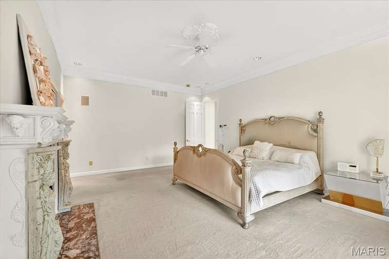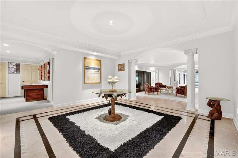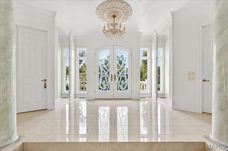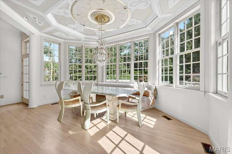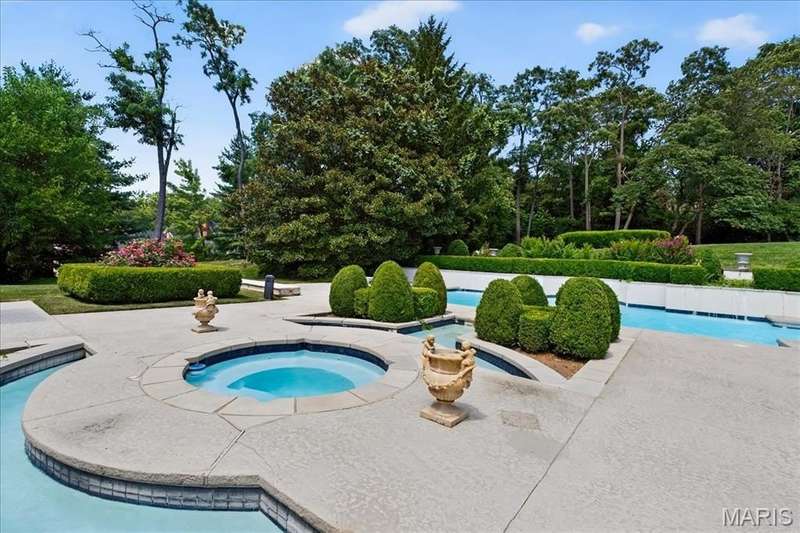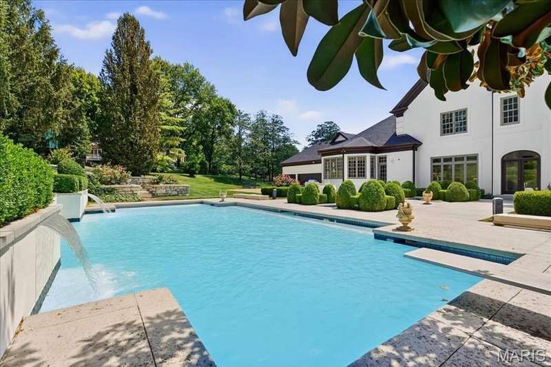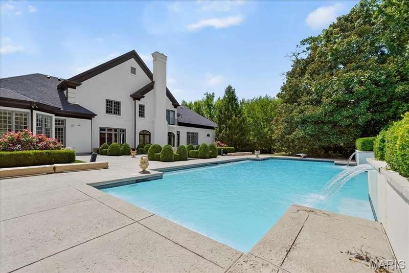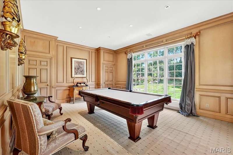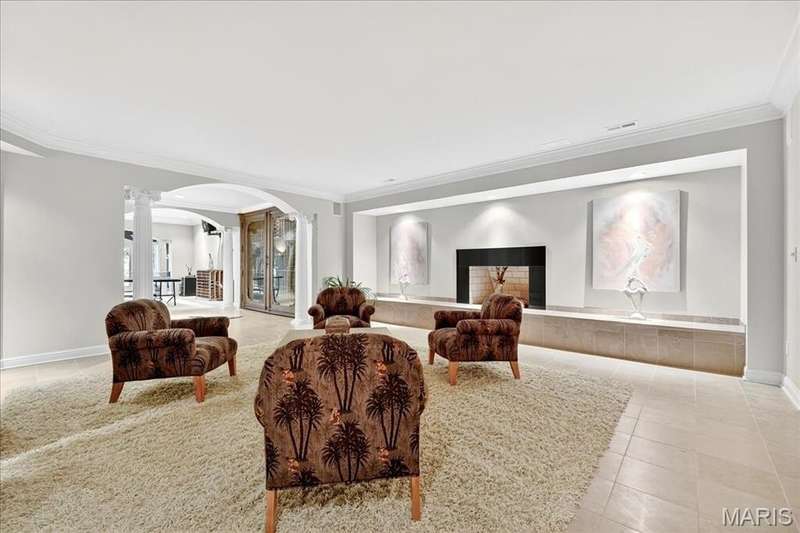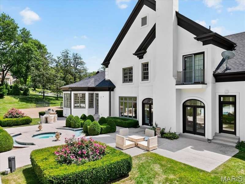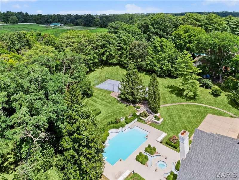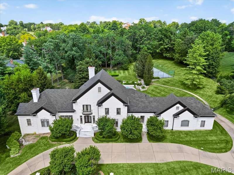 Poised for transformation, this Town & Country estate rests on nearly 2 beautifully landscaped acres in an exclusive gated enclave. Surrounded by trees, the lot provides unparalleled privacy, while the home’s generous square footage, resort-style amenities, and thoughtfully designed layout, provides a perfect personalization opportunity. Designed for entertaining, the gracious foyer invites you into the expansive living room and dining room with floor-to-ceiling windows overlooking the stunning backyard—complete with a pool with waterfalls, tennis court, and lush landscaping for your personal oasis. The spacious eat-in kitchen offers abundant cabinetry, counter space, and a breakfast room with a built-in banquette. A cozy den is ideal for movie nights, while the billiards room provides a versatile space for games, an office, or library. The main-floor primary suite, with a gas fireplace offers dual walk-in closets, soaking tub, separate shower, and dual vanities. Upstairs are two bedrooms with a shared bath, one en-suite, and a flexible fourth bedroom or creative studio. The walk-out lower level checks all the boxes with a wine cellar, theater room, guest bedroom, full bath and kitchen. Additional highlights include a spacious first-floor laundry and mudroom, a secondary service entrance, and an oversized four-car garage. With its timeless setting and impressive grounds, this property provides the canvas for a new homeowner to create their own custom masterpiece.