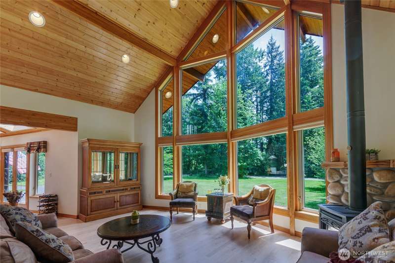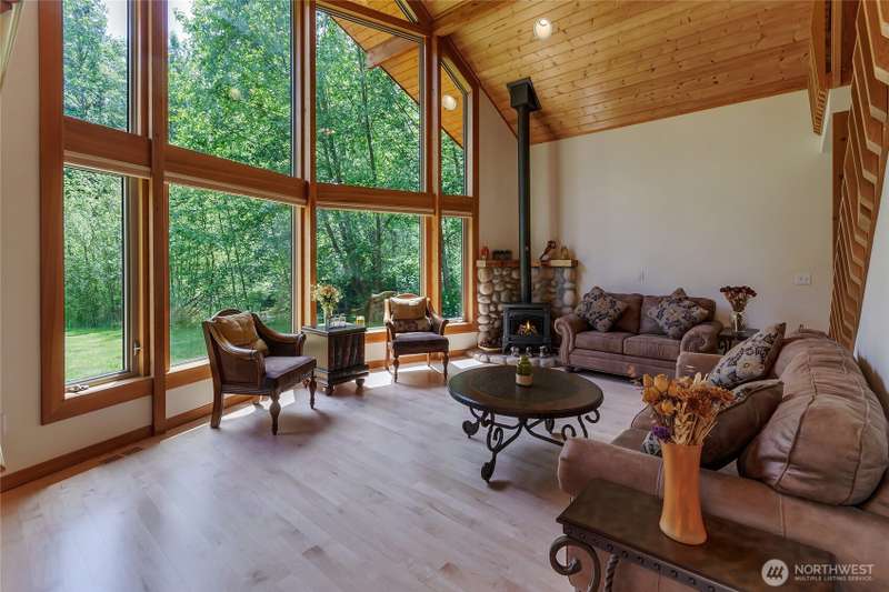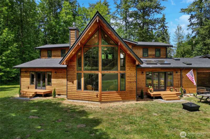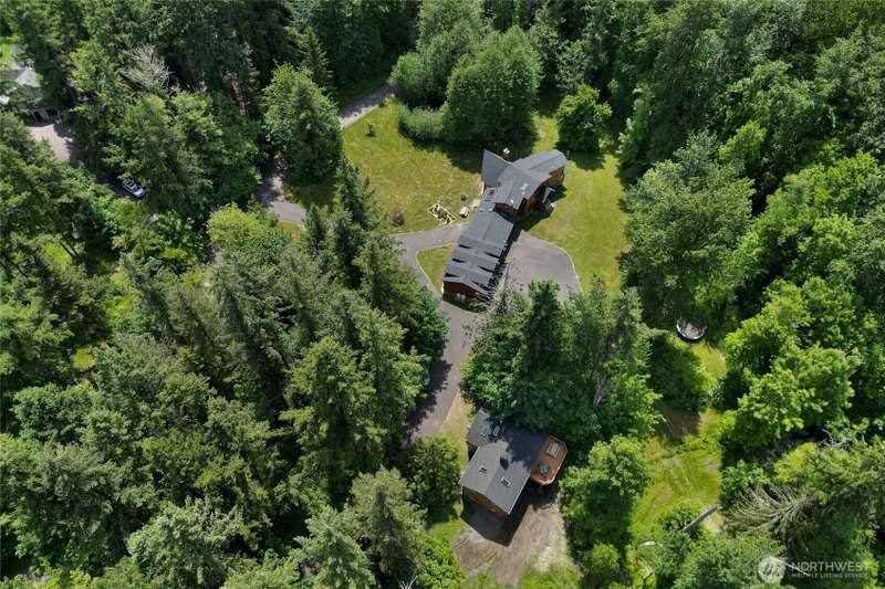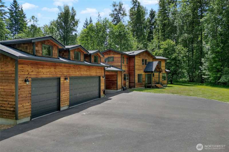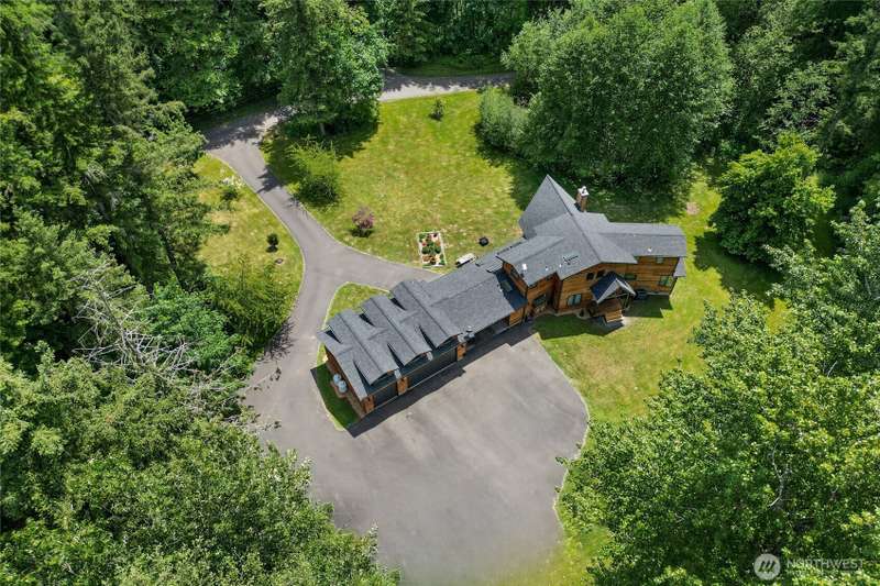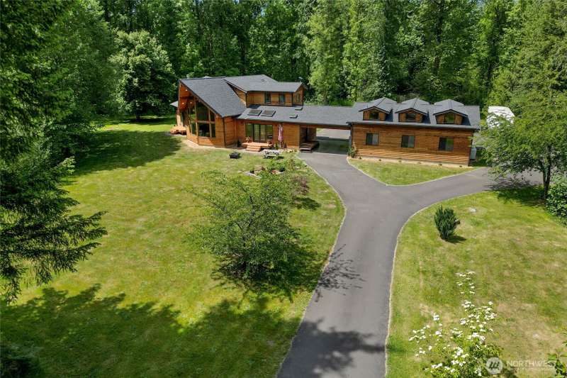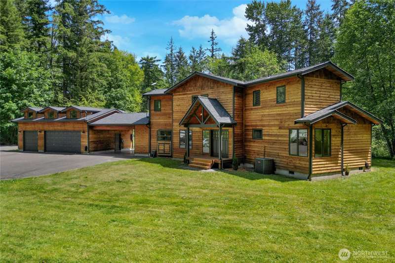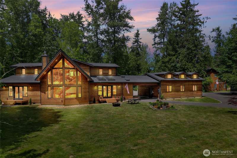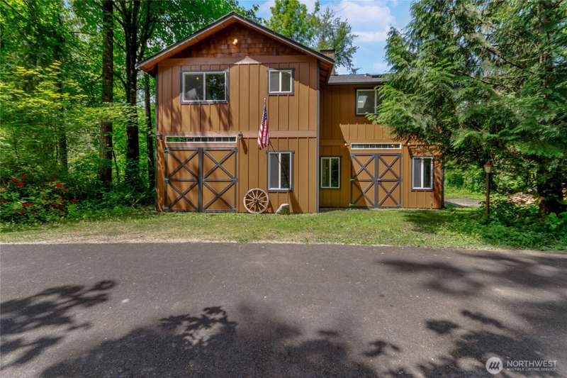 Step into your own PNW retreat w/this original-owner Lindal Cedar Home, exuding rustic charm & modern comfort*Nestled on a park-like 5-acre parcel with two access points*Main residence (2386 SF) boasts vaulted T&G ceilings that enhance the spacious, cabin-like ambiance*Expansive windows provide natural light, highlighting the finishes & create an inviting atmosphere*Features include a master on main level w/attached bath, NEW roof, NEW carpet, fresh exterior stain, heat pump, & 3-car garage*Detached barn (ADU) includes 3 stalls, versatile shop area, & 1,100 sq ft of living space on 2nd floor, complete w/full kitchen + bath*Perfect for a guest suite or MIL*Situated on a dead-end paved cul-de-sac*Ideal setting for privacy & country living