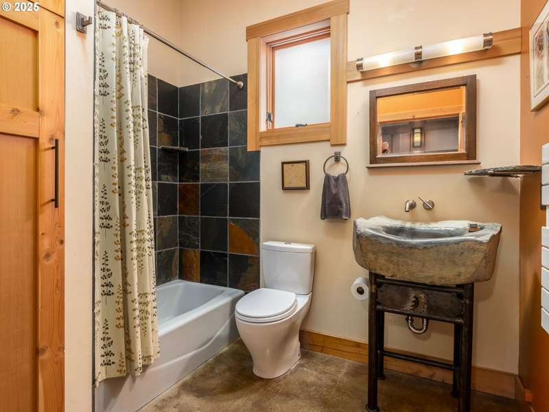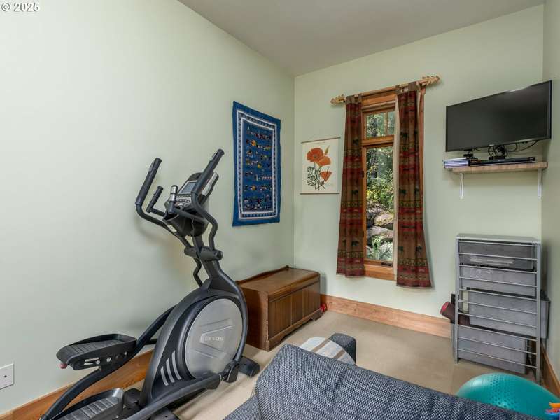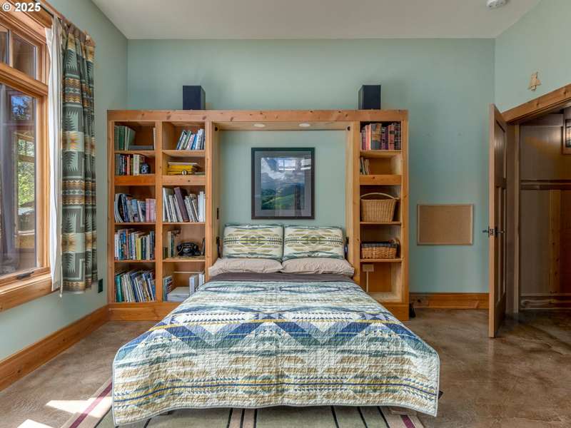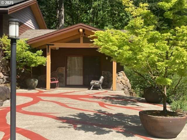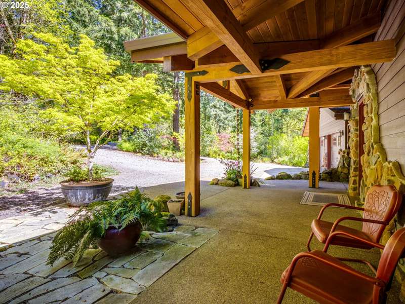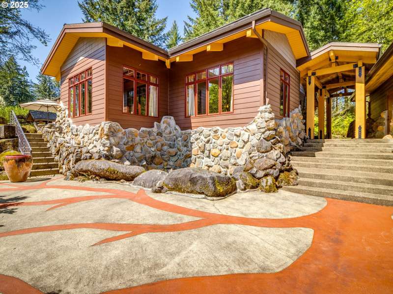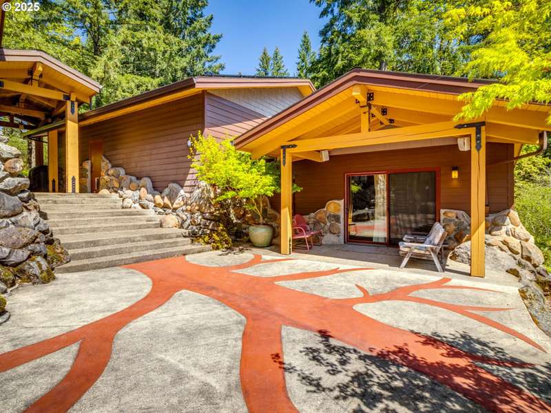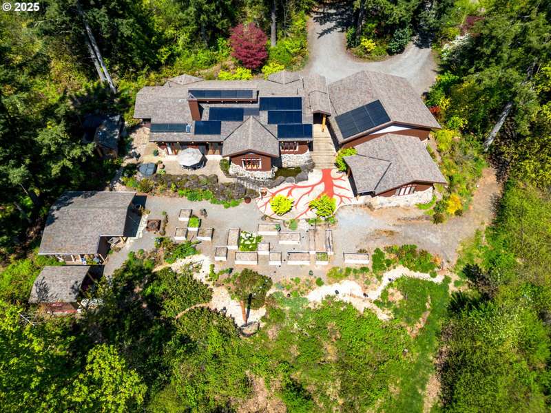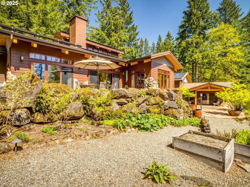 Once in a blue moon there's a home designed to be in creative harmony with its natural forest surroundings. This fabulous artistic original is one. The lodge-like Great Room, with high open beams and rock accents, faces south to capture sun's warmth, resulting in net-zero energy use and a PGE bill of $15/month! Live trees in the entry, a real Madrone tree embedded in a secret door, a natural edged basalt sink, a craftsman's front door are all welcoming, functional and create a strong connection to the outdoors. Every room integrates natural materials in thoughtful design. The Primary Suite expands into a Bonus Room, currently used for exercise. Second Bedroom also functions as the Study with bark-edged built-in book shelves, an inlaid Murphy Bed, no closet. Third Bedroom has been used as a detached music studio. It's a 360 sqft space with a closet and covered front entry. It stands clustered around the terraced back patio and raised garden beds along with the open party Clubhouse, a stone pizza oven (photo 38), a hot-tub, and a jetted swim spa/lap pool. There's also a matching storage shed. In the deep 3 car garage there's a handy workbench and a half bath. Colorful original artworks embellish the natural setting--a red tree design in the concrete patio, a tall metal Ben Dye animal totem in the garden, earth-toned ceramic potted plants, a cascading rock water feature, and more. This 5 acre property has an approved ground lease on a 22 acre property that's in a conservation easement intended to preserve the land for sustainable, organic practices. It sits way back off the road in a popular Oregon City country community. It's one-of-a-kind and very special. NO DRIVE-BYs PLEASE. By Appointment only!