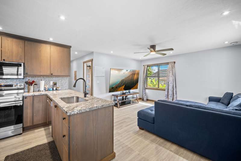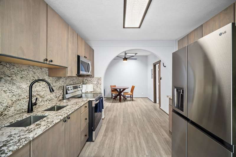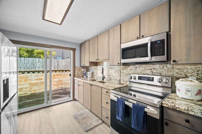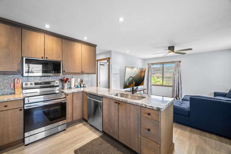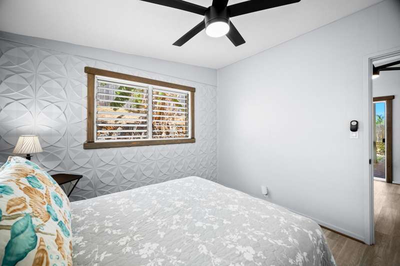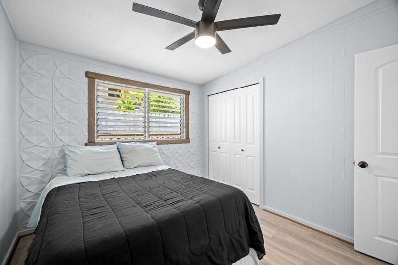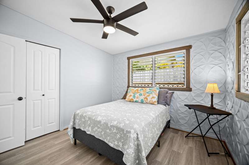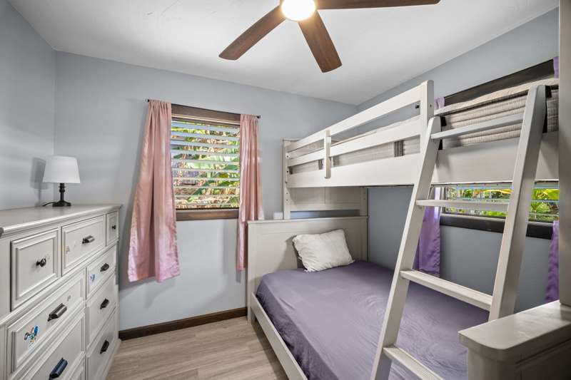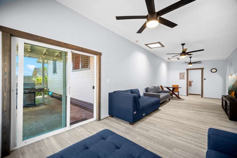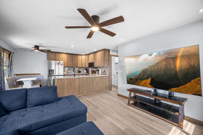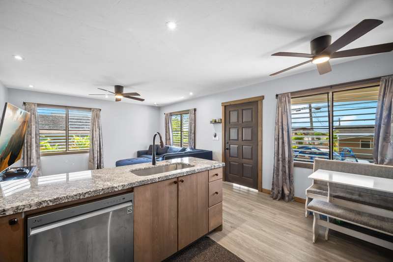 The second home has 2 bedrooms, 1 bathroom and includes a full kitchen, living room & dining area. Sliding doors lead to the back lanai.