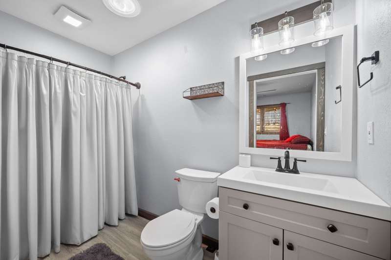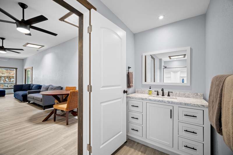 The main front house has 3 bedrooms and 2 bathrooms. Custom shelving can be found in the primary bedroom closet as well as an ensuite bathroom. Each bedroom features upscale sliding barn doors for the closets. Cedar wood trim and baseboards can be found throughout the homes.