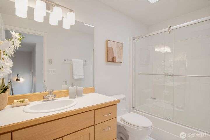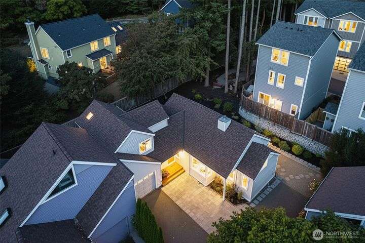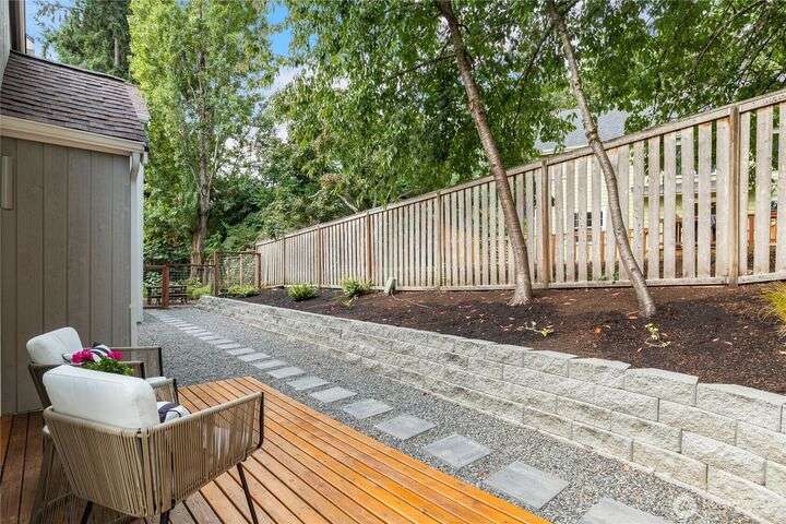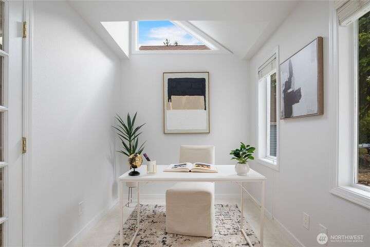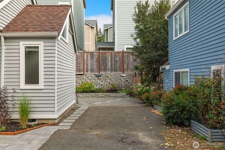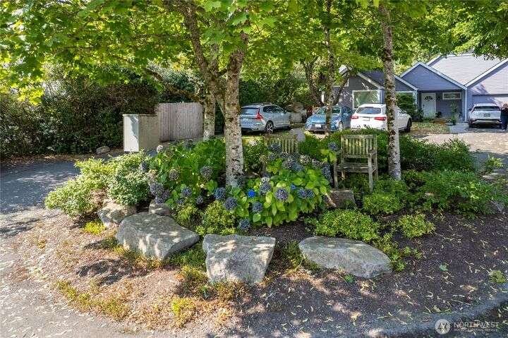 Rare Winslow Cottage close to shops, schools and ferry, yet tucked away in a quiet, private enclave of six zero-lot-line homes. Built by Fairbank Construction, this home has tall vaulted ceilings, skylight + clerestory windows to let in natural light. Desirable one-level living with a primary bedroom and bathroom on the main level. Another bedroom and full bathroom plus loft are upstairs. Thoughtful floorplan with great flow and easy access to the outdoors from the living spaces. Two possible office spaces. Laundry room on main floor. Connected 1-car garage with storage space plus two parking spaces. Private and partially fenced backyard is perfect for pets and gardening. Low HOA dues. New roof just installed.