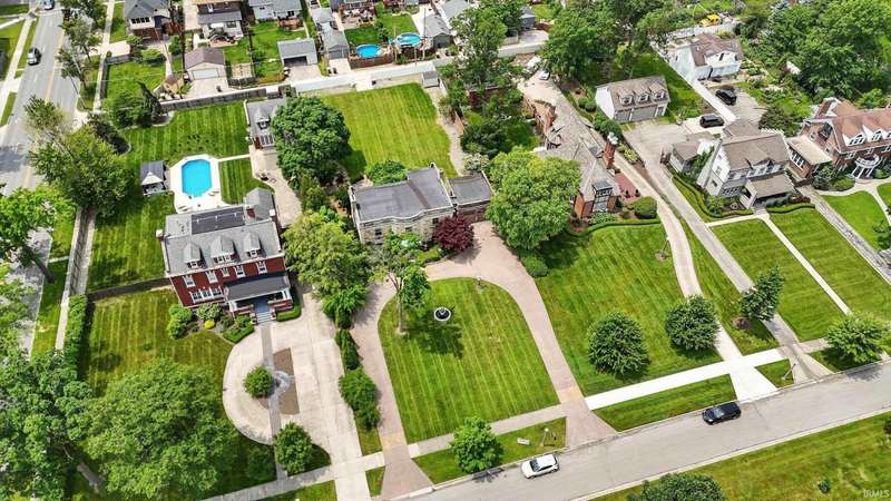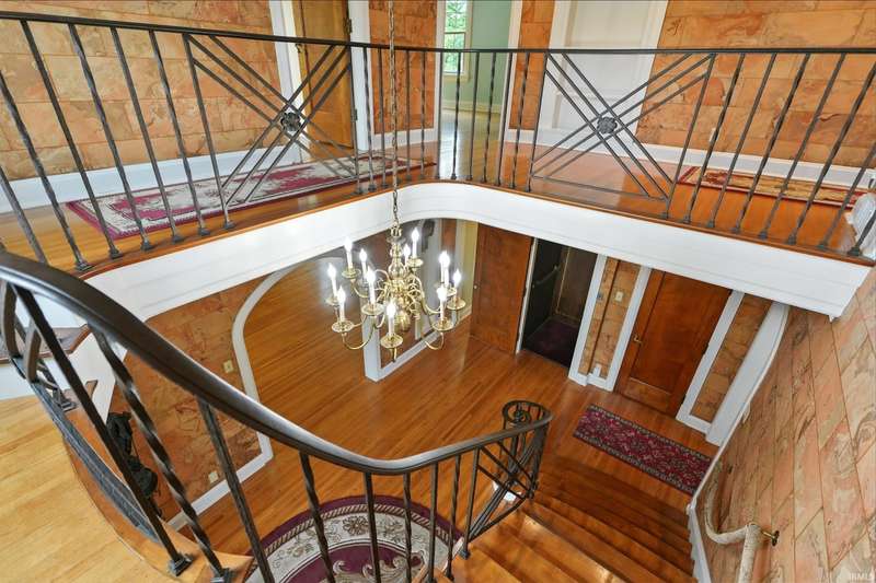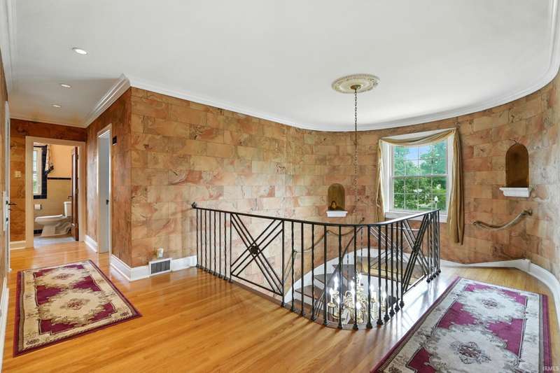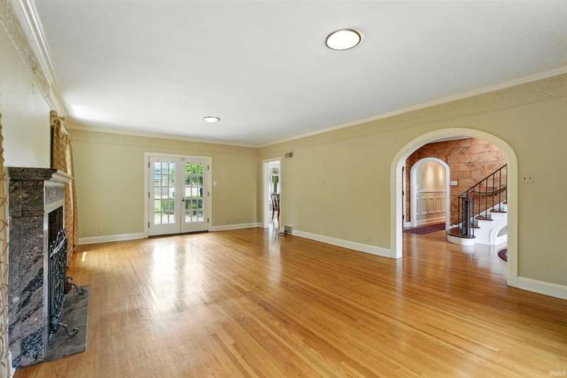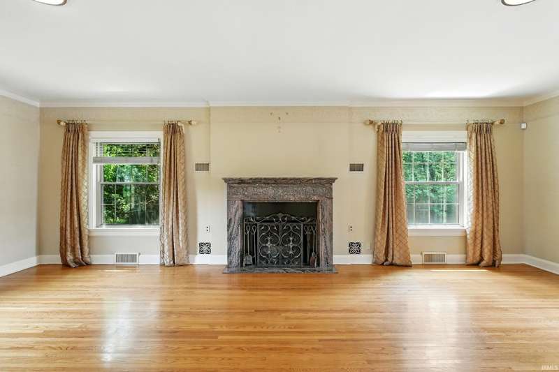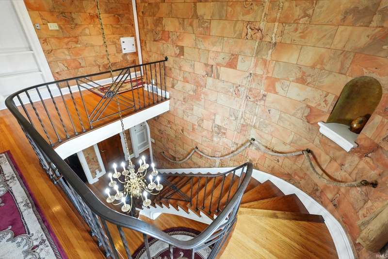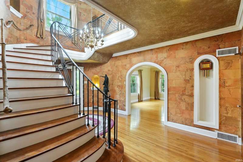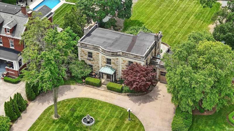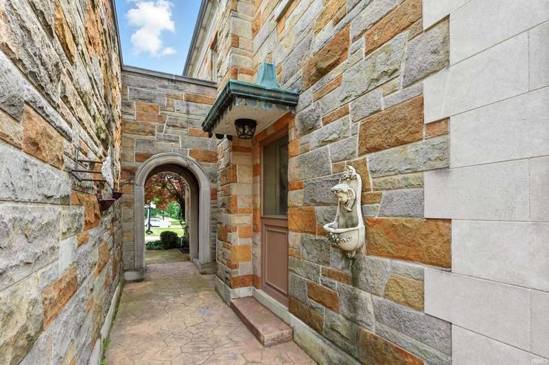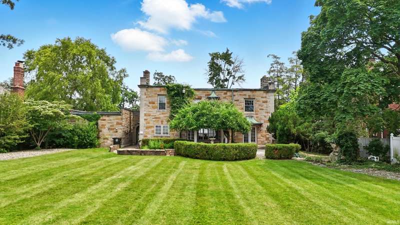 Welcome to the Alexander Birkmeier House on Forest Park Blvd — a 1937 Regency Colonial Revival masterpiece built entirely of stone. This elegant 4-bedroom, 3.5-bath home features a semi-attached two-car garage, grand staircase, and arched doorways. Inside, enjoy beautifully preserved hardwood floors throughout, a spacious formal living room with a fireplace, a large dining room perfect for entertaining, and a sunlit den or office. The kitchen blends historic charm with modern function and opens to a cozy breakfast nook. Upstairs, the bedrooms are generously sized, including a primary suite with an en-suite bath and several closets. Architectural details include eight-over-eight windows, a curved central entry with copper roof and iron supports, and a stone parapet crowning the flat roof. The master bedroom has a second story walkout balcony to view downton fireworks. Set among mature landscaping, this home offers timeless character in one of Fort Wayne’s most iconic neighborhoods. Please contact your agent for inspection report, recent repairs as well as updating quotes.