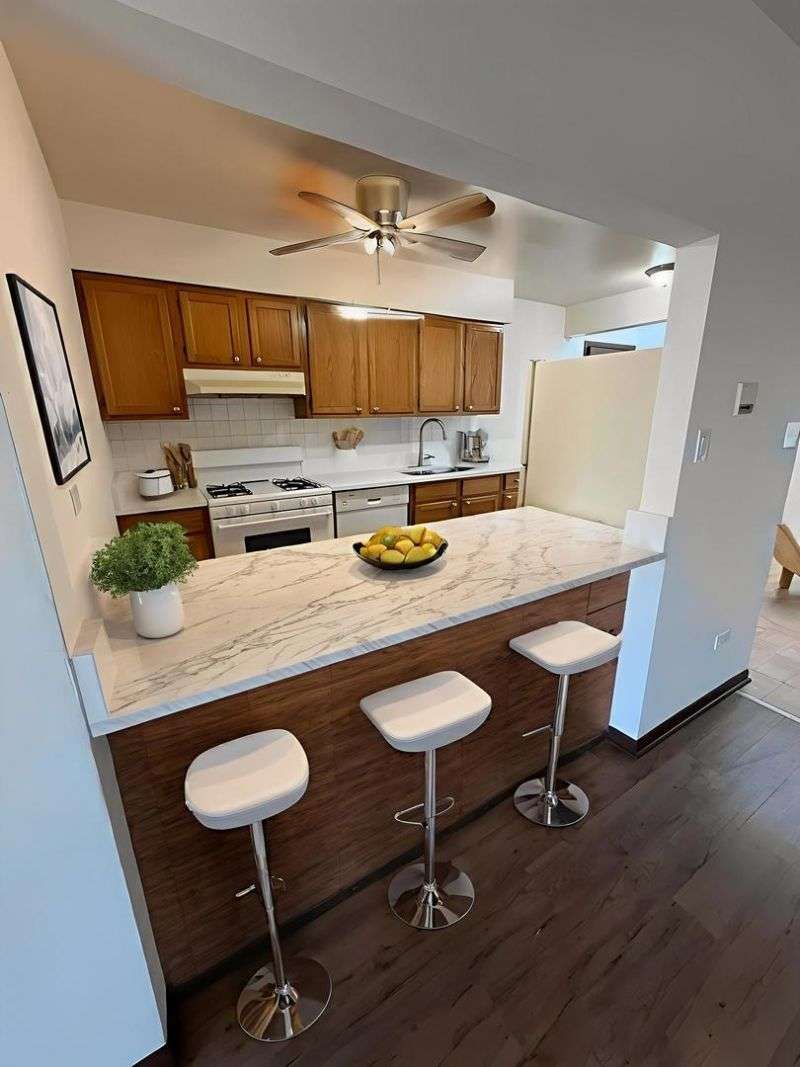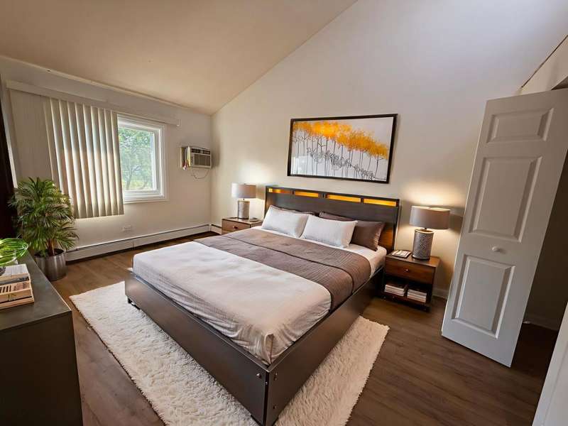 Bright and spacious 3rd-floor apartment in a prime Wheeling location, directly across from a scenic park with walking paths and open green space. This beautifully maintained, quiet, family-friendly building features hardwood/laminate floors, vaulted ceilings, and generous closet space, including a large walk-in closet. Enjoy natural light pouring through vertical blinds on all windows and a private balcony perfect for morning coffee or evening sunsets. The large eat-in kitchen is great for gatherings, and the 1st-floor laundry room and additional private storage add convenience. Two assigned parking spots, one in front and one across the building, and easy access to sidewalks, mature trees, and open space. Just 5 minutes to the Metra station and close to Downtown Wheeling's shops and restaurants. Utilities (water, gas, and heat) are included. Don't miss out on this rare opportunity to live in one of Wheeling's most desirable areas!