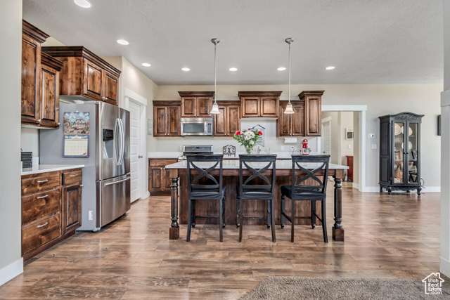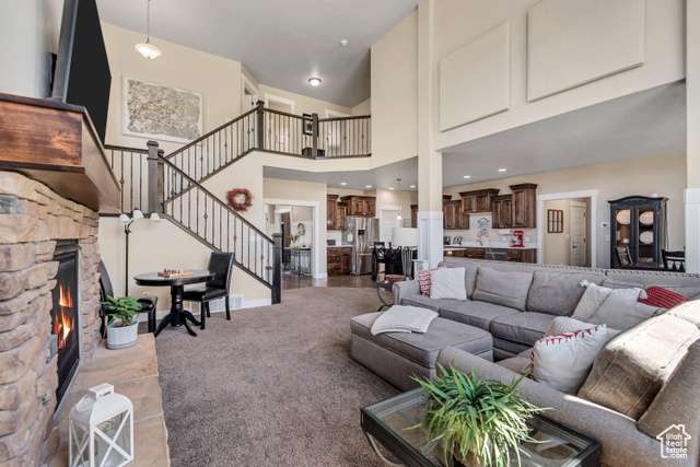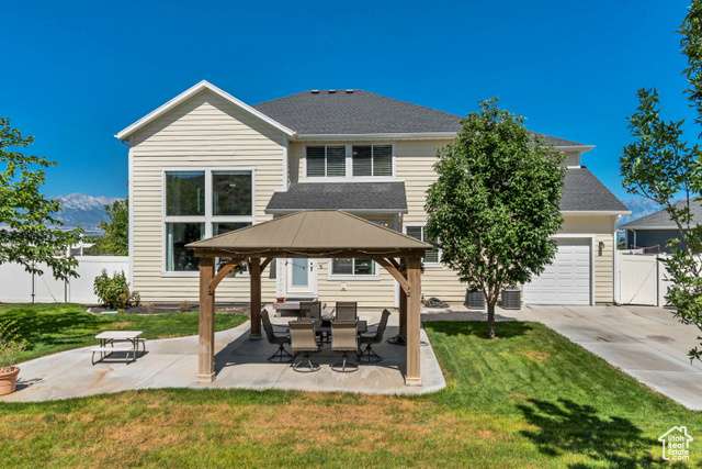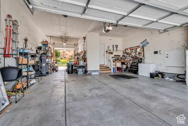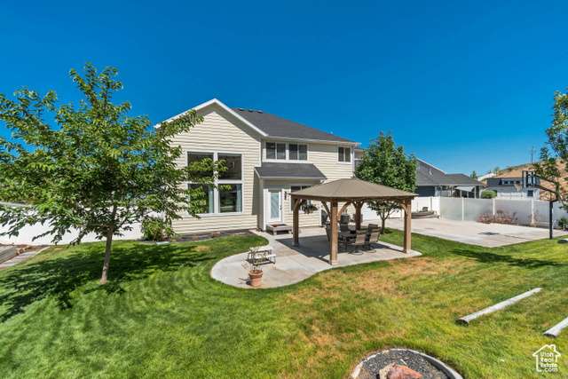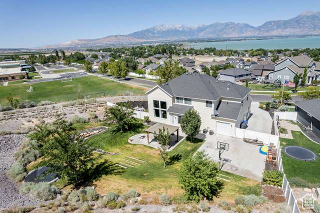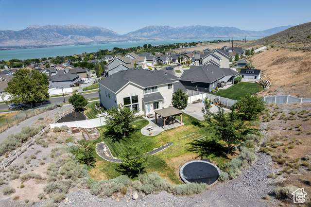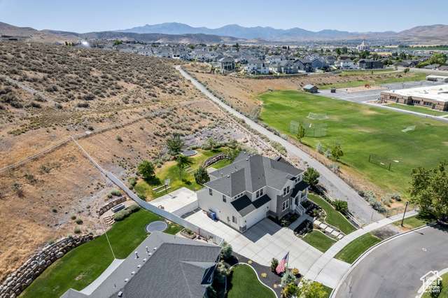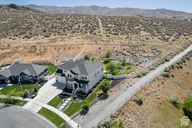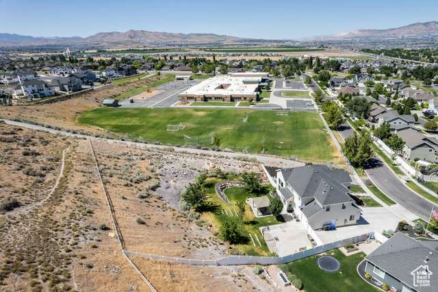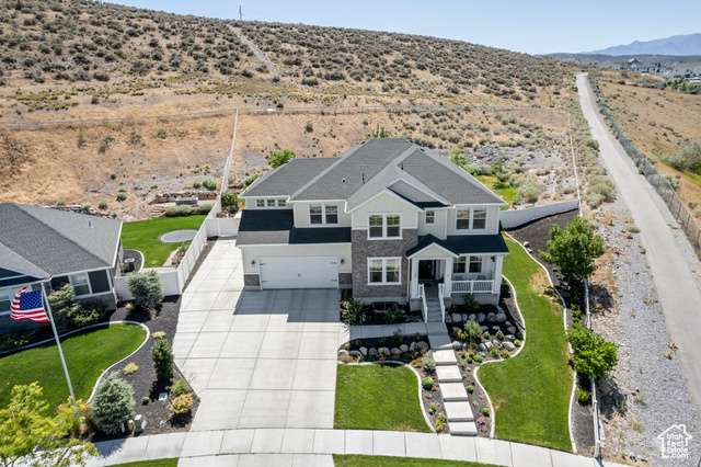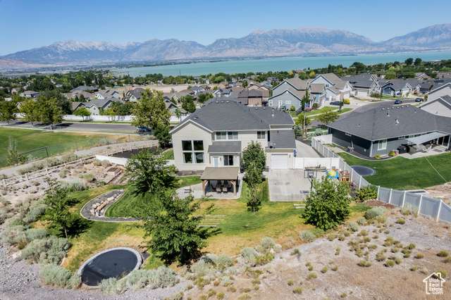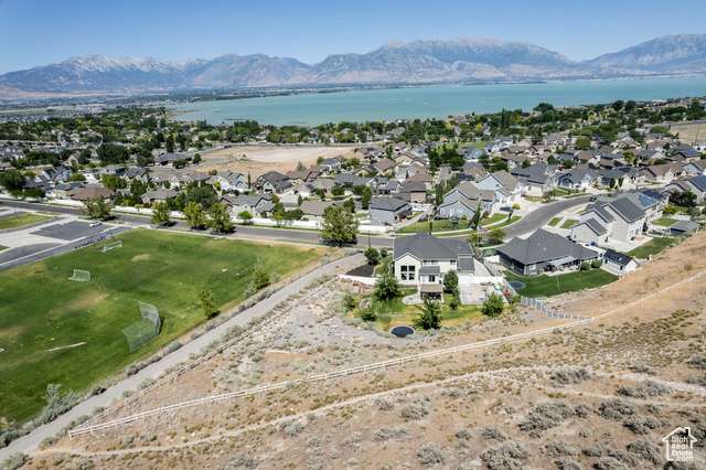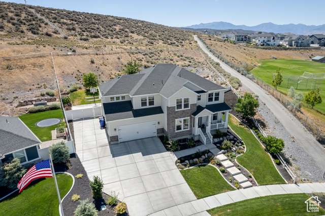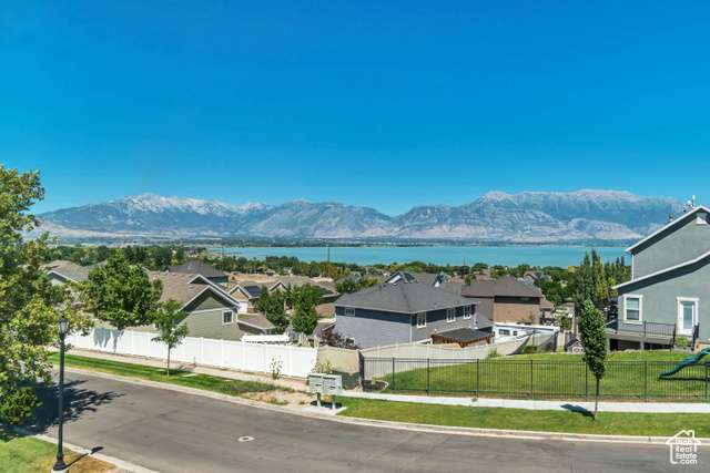Welcome to your dream home-perched on an elevated .69-acre lot with panoramic views of Utah Lake, the valley, and the majestic Wasatch Mountains. This stunning 6-bedroom, 3.75 bath home sits in one of the most desirable locations in the area. With no neighbors directly behind or to the north, this home lives like a corner lot, backing up to the natural beauty of the mountains and offering unmatched privacy. Inside, you're greeted by a spacious entry with a main-floor bedroom as well as a flex room that can be used as an office, formal living area, music room, playroom, etc. The heart of the home is an expansive open-concept kitchen, dining, and vaulted living room featuring a grand fireplace-perfect for gathering and entertaining. The oversized three-car garage includes a rear-facing garage door for easy access to the backyard, and there's additional RV parking on the side. The unfinished basement boasts 9-foot ceilings and provides ample room for storage or future living space. Step outside to an incredible backyard oasis with terraced landscaping, a large concrete patio, and a shaded pergola-ideal for outdoor dining or simply soaking in the peaceful surroundings. Homes like this rarely come to market-don't miss the chance to own one of the best lots in the neighborhood, with space, views, and potential to match.