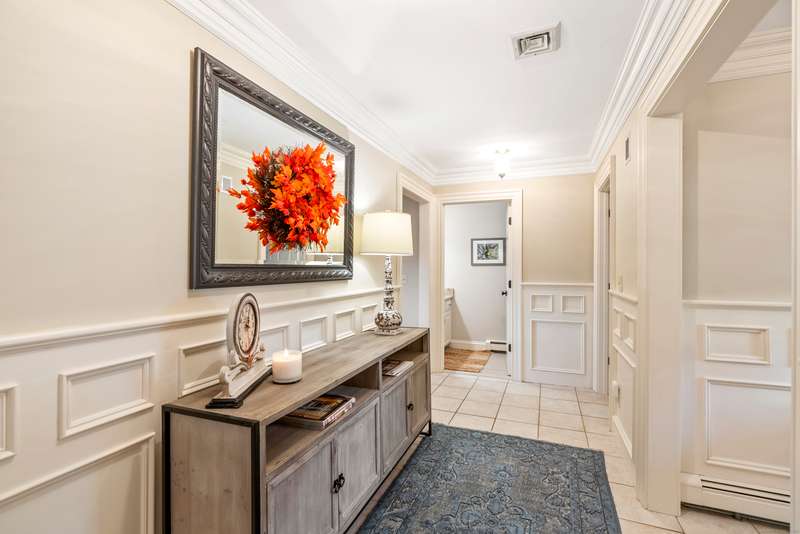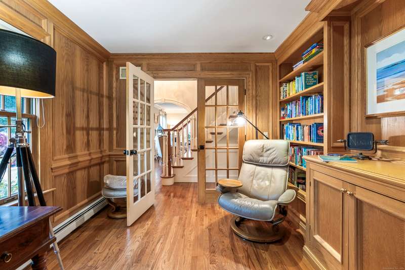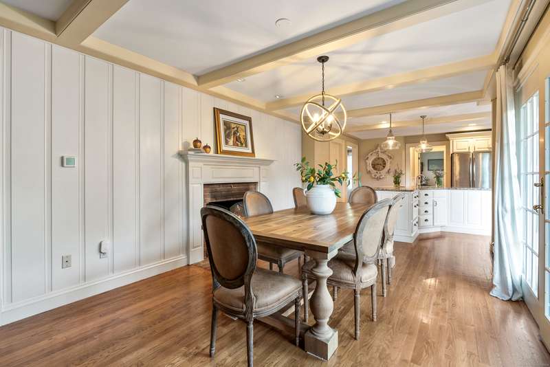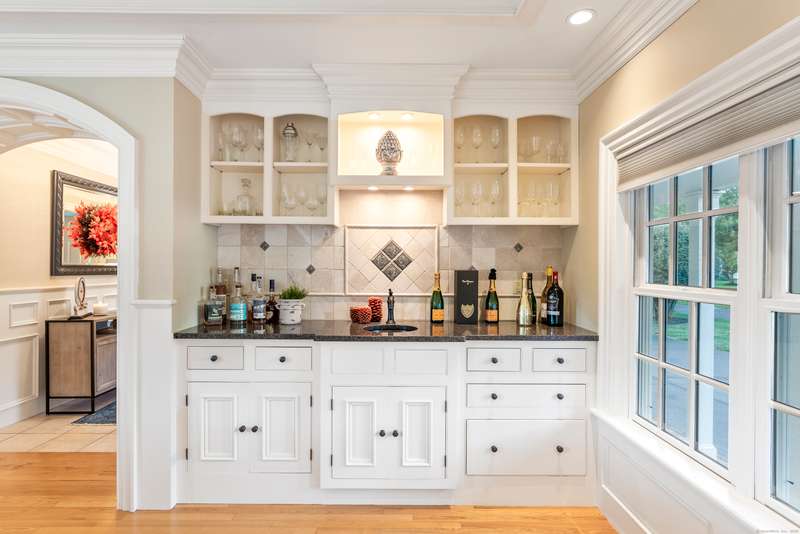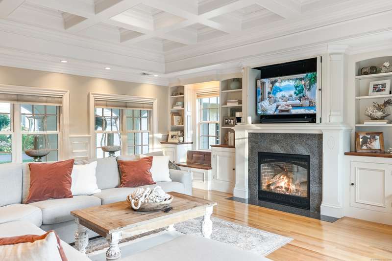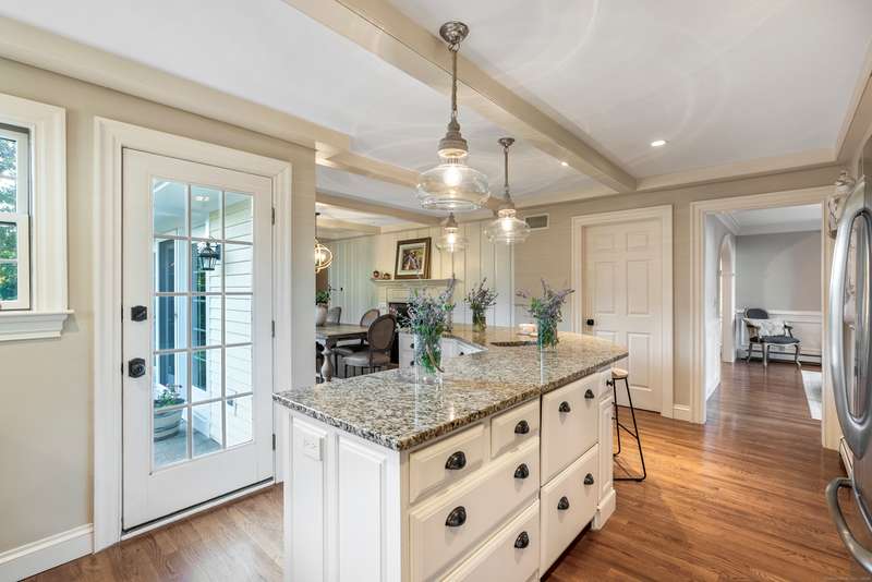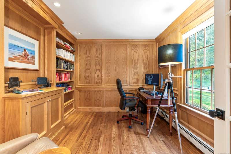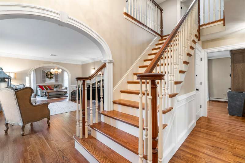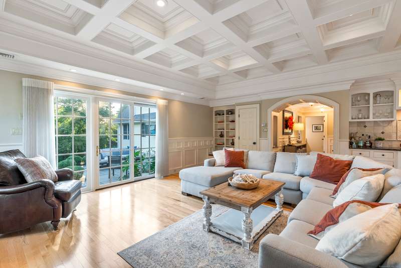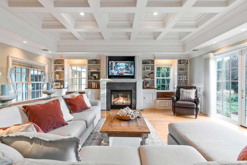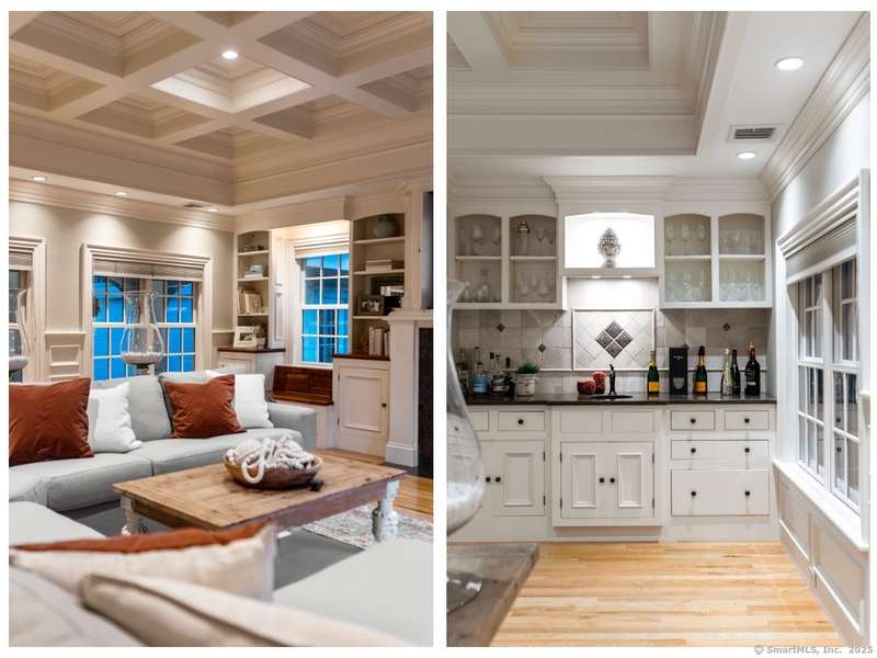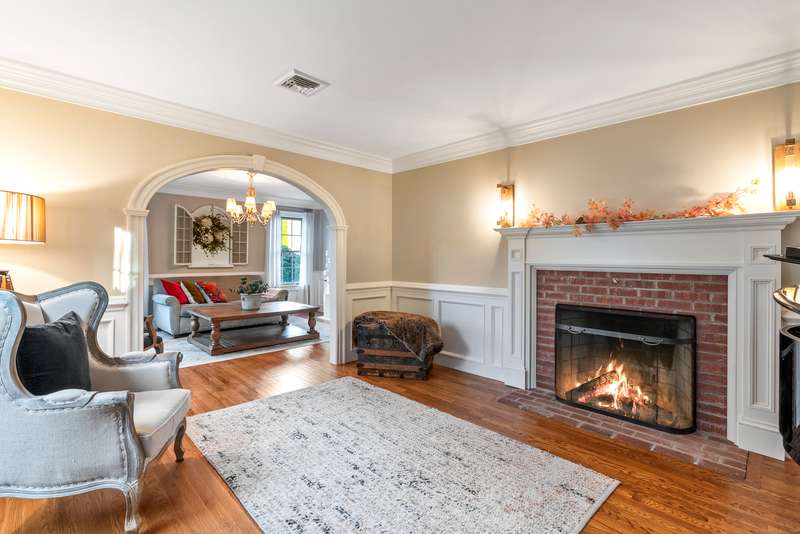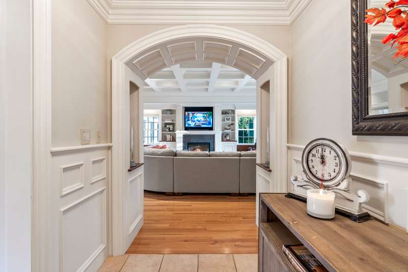 Extensive trim and molding throughout set this stunning custom home apart from any other. Every corner highlight extraordinary trim, detailed architecture, and unmatched craftsmanship. 25 meticulously crafted coffered ceilings, elegant wainscoting, multi-tiered crown molding, arched entryways, and custom inset cabinetry - a level of detail nothing short of phenomenal. Located in the coveted Red Hill neighborhood, homes rarely come on the market. Buyers often reach out to owners to inquire about selling. The home's incredible curb appeal is matched by beautifully landscaped grounds featuring a bluestone patio, outdoor TV, stone walls, fire pit, fountain, vegetable garden, and landscape lighting. Inside, there are three fireplaces that anchor the home's inviting atmosphere, while the custom kitchen offers an oversized island with second sink, two refrigerator drawers, and spacious pantry. Flowing together, the formal living and dining rooms-with a charming wood-burning fireplace-create a