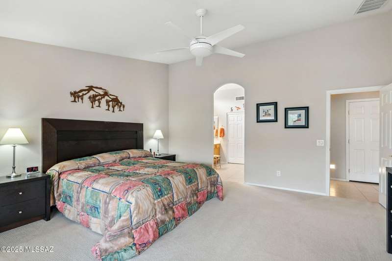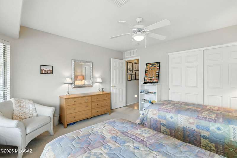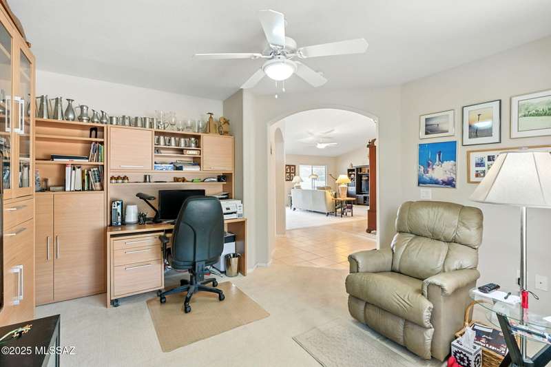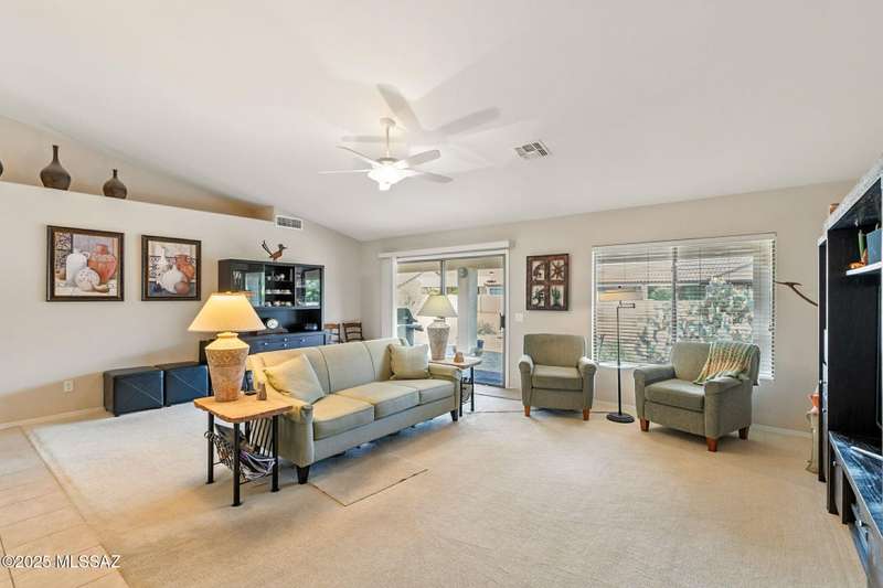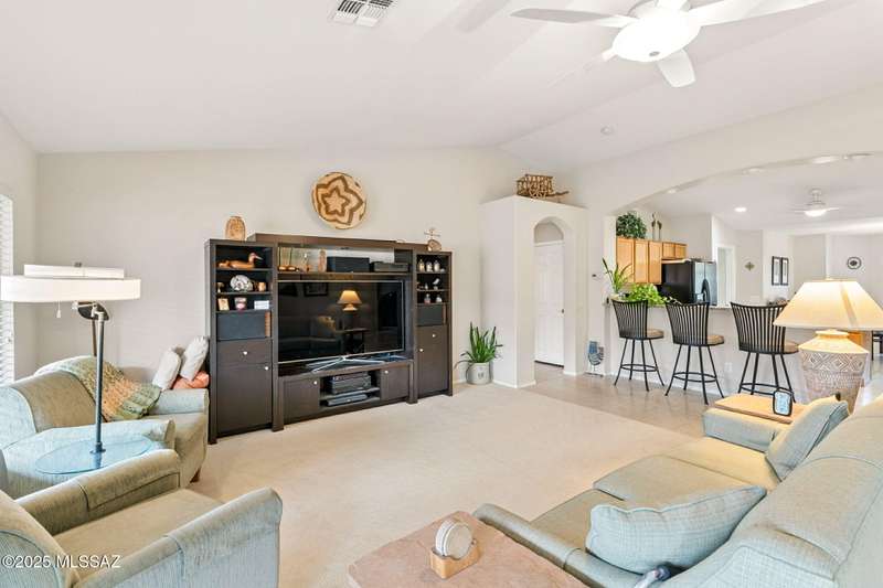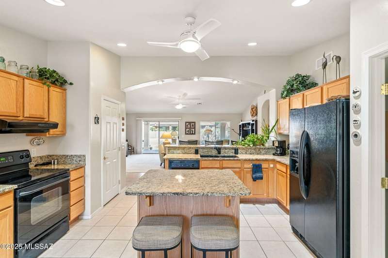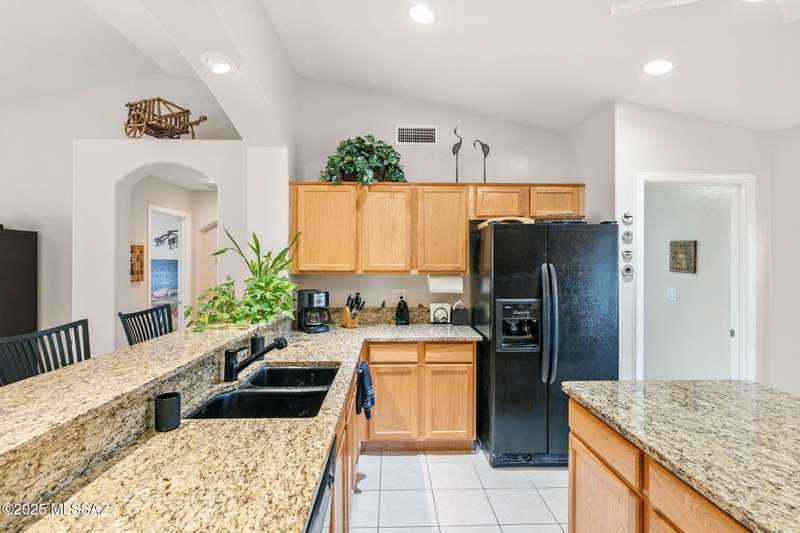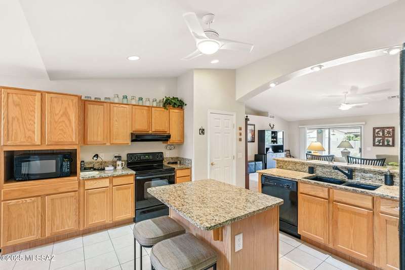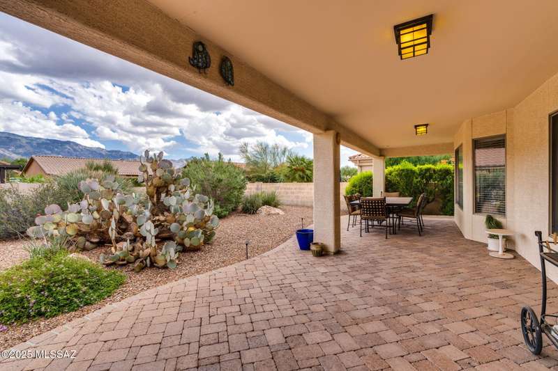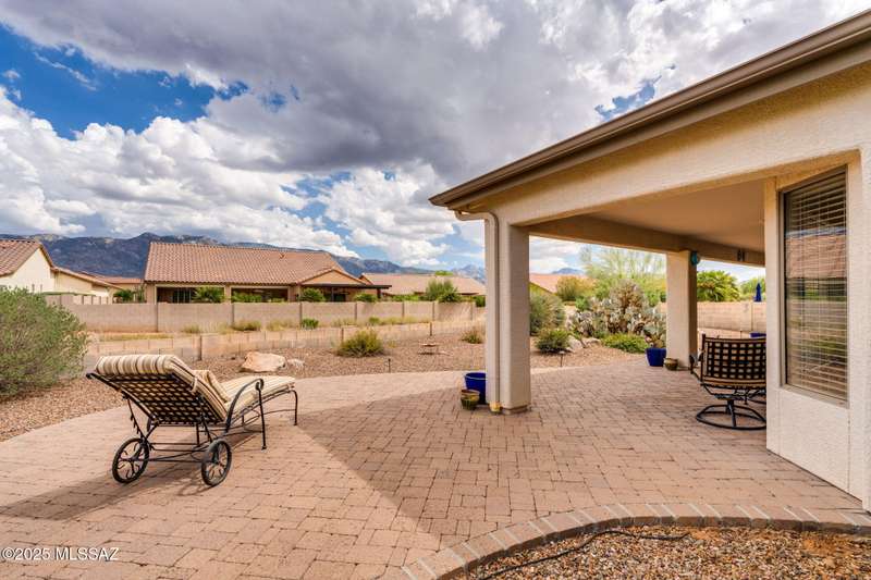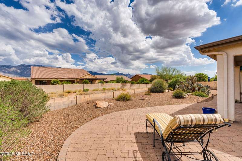 Charming 2BD/2BA (1,924 sq ft) Laredo floorplan welcomes you with soaring vaulted ceilings, dramatic archways, custom lighting, large bay window in both bedrooms, plus rear Catalina mountain views. Spacious Den off foyer flows to an inviting living room. Adjacent kitchen boasts outer breakfast bar, center island, dining area, plus rich hued cabinetry, granite counters and sleek black appliances. Pull-out shelves in kitchen and bath cabinets. Primary bedroom hosts ensuite bath with dual sink vanity plus walk-in shower & closet. Split guest room accesses hall bath. Spacious laundry with ample storage plus extended golf cart garage with storage cabinets & utility sink. NEWER ROOF! Retreat outdoors to a tranquil yard with extended covered patio and pavers. SaddleBrooke Active Adult Community.
