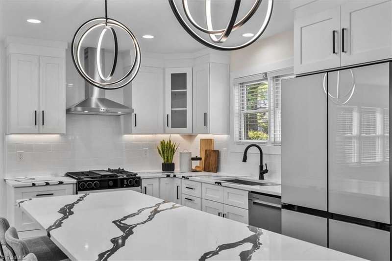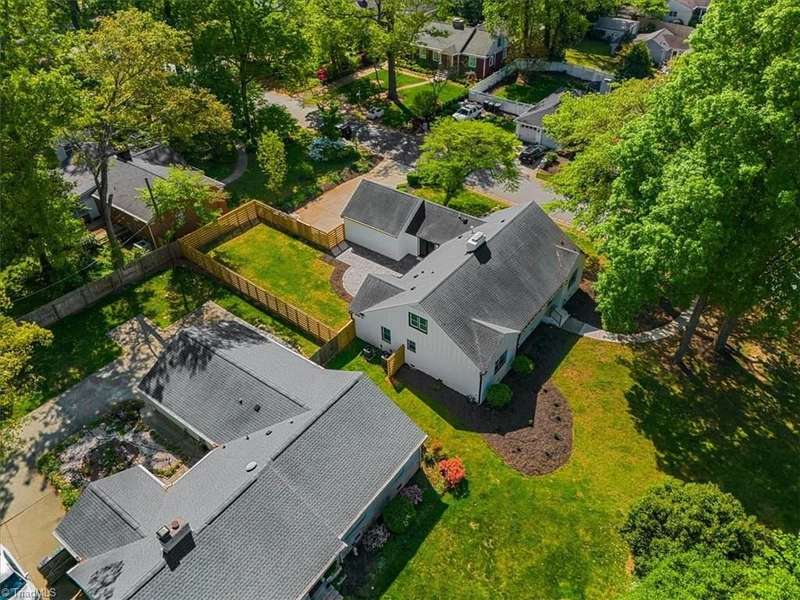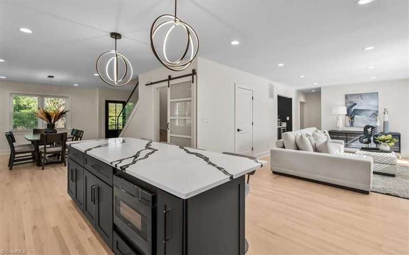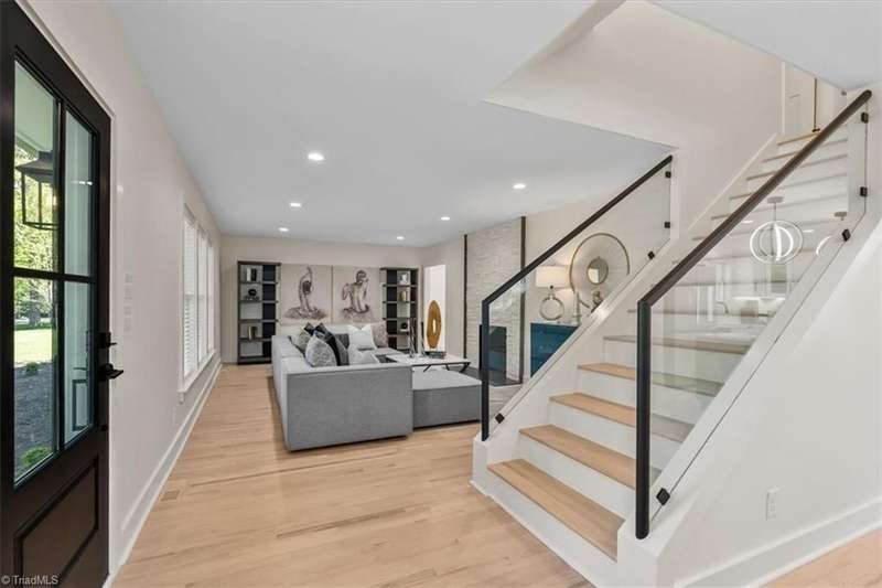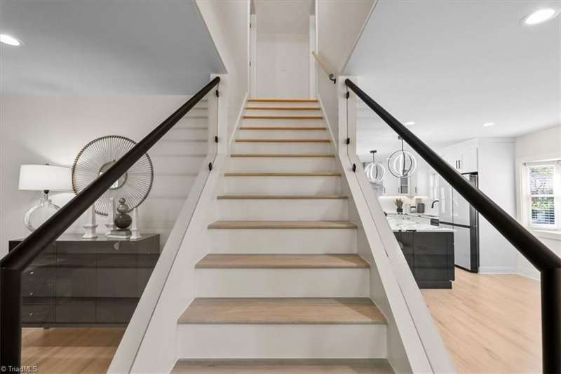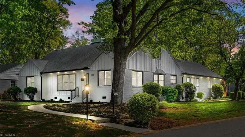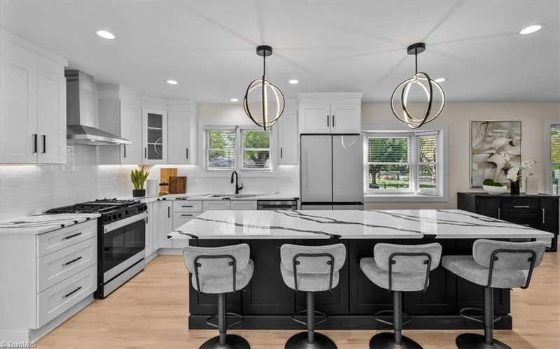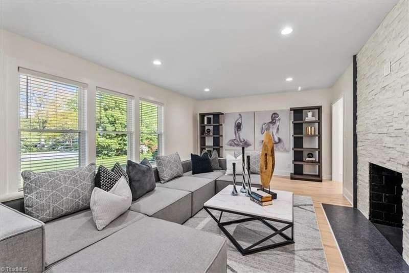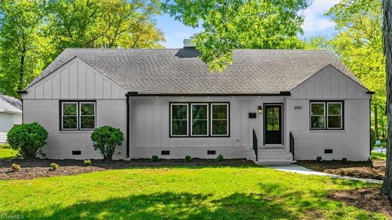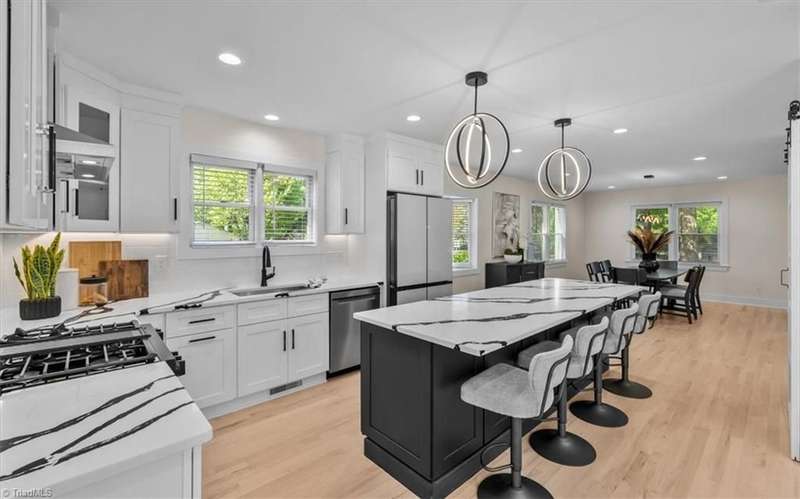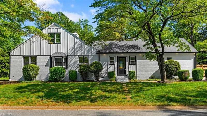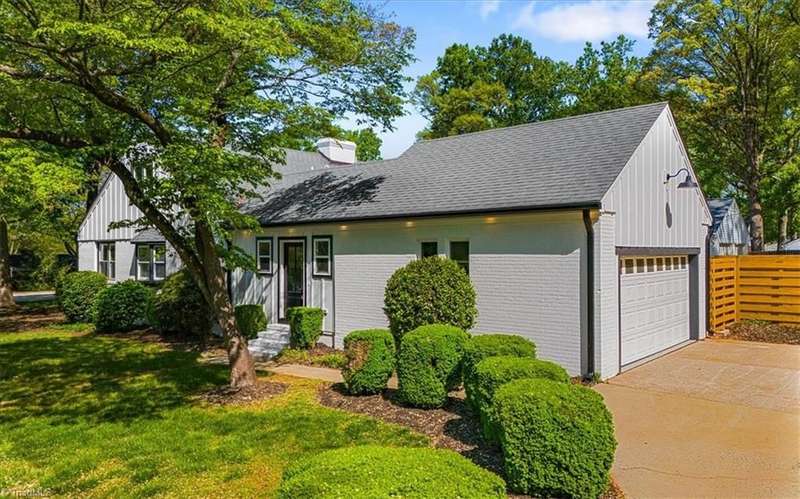 Freshly renovated by Grandeur Homes, this classic brick Cape Cod in Starmount Forest has been reimagined and redesigned into a transitional open-concept home with dramatic black-and-white accents. Overall, you'll enjoy comfortable one-level living with Primary suite and second bedroom (or office) and separate Laundry on Main. Living Room with white ledger stone fireplace surround. Kitchen with walk-in pantry, eat-up island for 4, and black accent island with striking "Panda" quartz counters that boldly contrast the crisp white cabinetry. Den with recessed Bar opens directly onto Patio inside fully-fenced backyard. Upstairs are Bedrooms 3 and 4, plus gorgeous full bath and bonus Loft space. Dual entries on both the front and ?Kirby? side of this corner-lot home. Attached 2-car garage with epoxy floor is safely tucked on rear with direct access to Kirby Drive. Conveniently located 1/2 from Starmount Forest Country Club and 1 mile from Friendly Shopping Center. Agents, see Remarks.