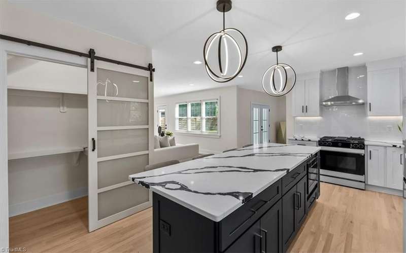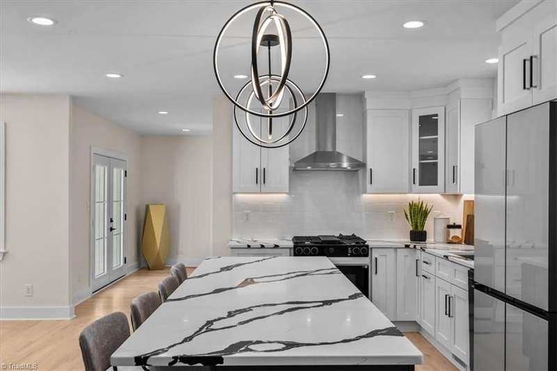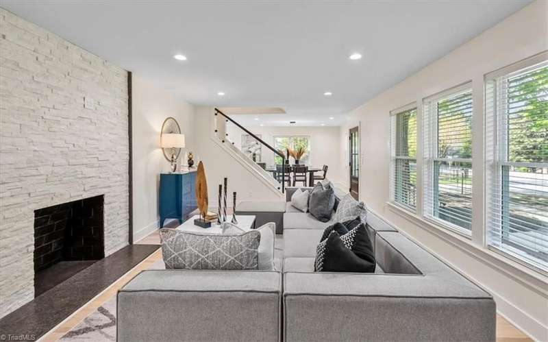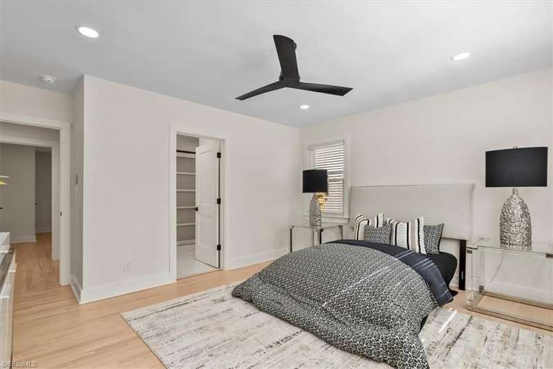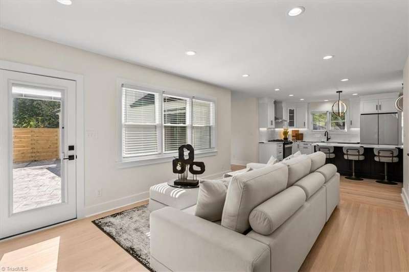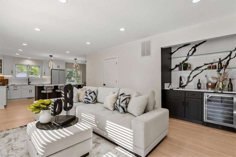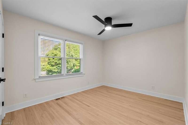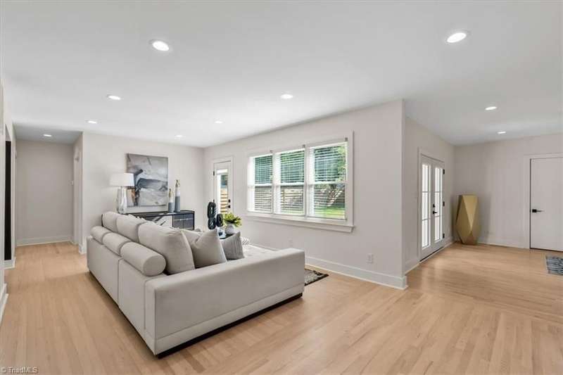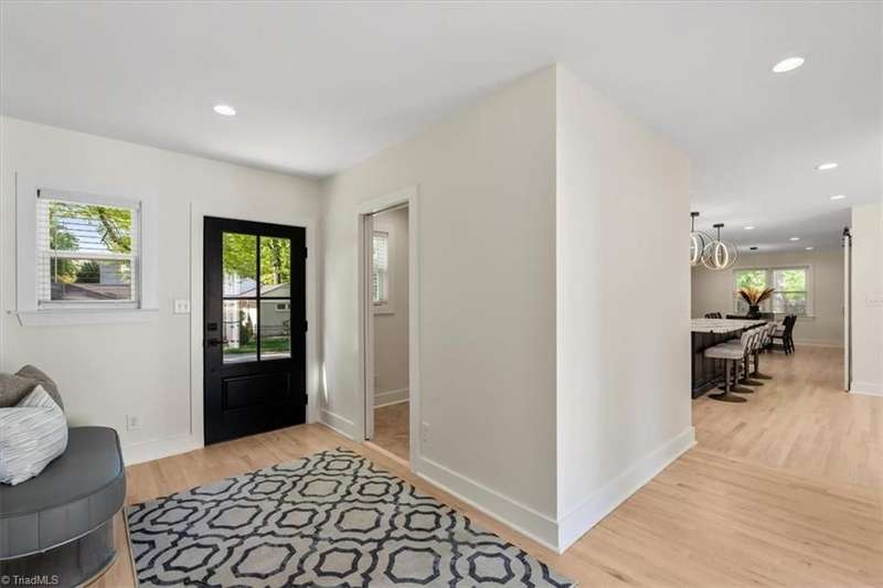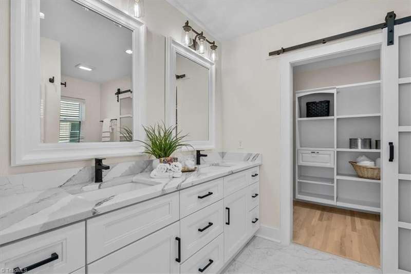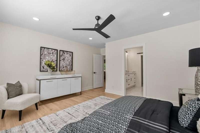 Freshly renovated by Grandeur Homes, this classic brick Cape Cod in Starmount Forest has been reimagined and redesigned into a transitional open-concept home with dramatic black-and-white accents. Overall, you'll enjoy comfortable one-level living with Primary suite and second bedroom (or office) and separate Laundry on Main. Living Room with white ledger stone fireplace surround. Kitchen with walk-in pantry, eat-up island for 4, and black accent island with striking "Panda" quartz counters that boldly contrast the crisp white cabinetry. Den with recessed Bar opens directly onto Patio inside fully-fenced backyard. Upstairs are Bedrooms 3 and 4, plus gorgeous full bath and bonus Loft space. Dual entries on both the front and ?Kirby? side of this corner-lot home. Attached 2-car garage with epoxy floor is safely tucked on rear with direct access to Kirby Drive. Conveniently located 1/2 from Starmount Forest Country Club and 1 mile from Friendly Shopping Center. Agents, see Remarks.