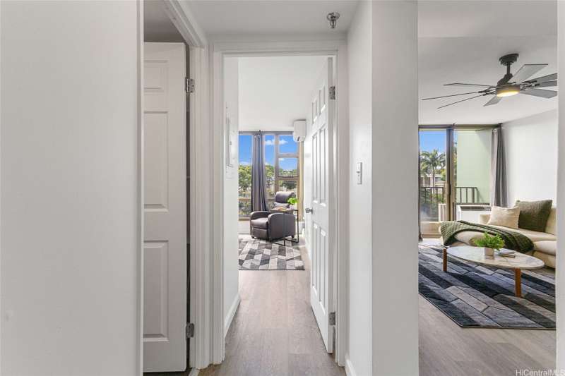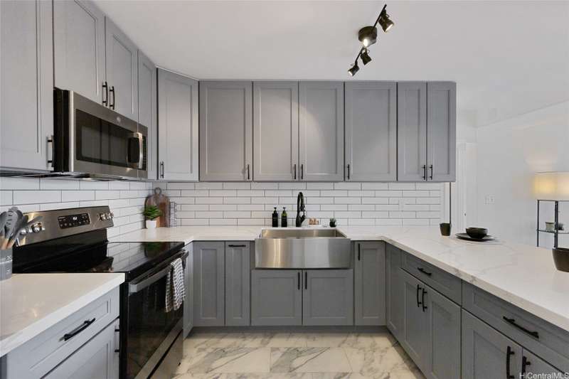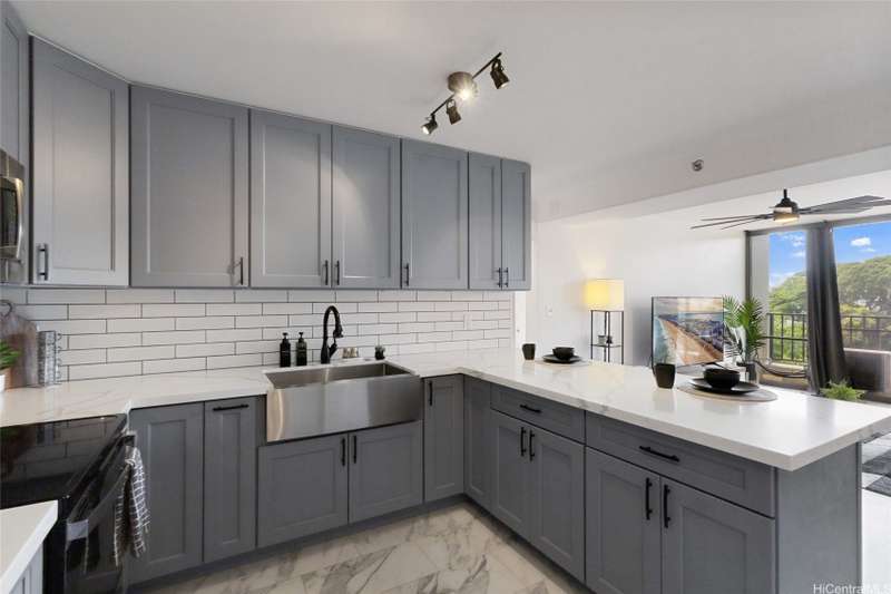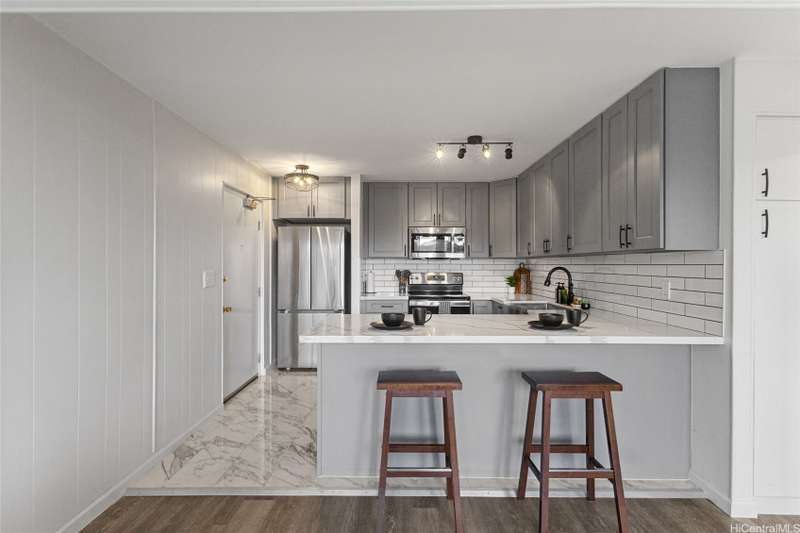 This completely renovated unit comes with 2 covered parking stalls in the highly desirable Koauka Loop area. Welcome to Pearl Regency unit 202. This corner end unit comes with the convenience of a low floor, but the views of a higher unit over the lower pool and landscaped area. Renovated in 2023, the new open floor plan comes with modern kitchen and bathroom finishes and new AC. Enjoy resort-style amenities including a pool, whirlpool, sauna, fitness room, tennis courts, BBQ area, recreation room, and ample guest parking. This secured, pet-friendly building is ideally located near the Pearlridge Center Mall, Pali Momi Medical Center, restaurant, schools, and so much more!