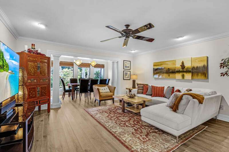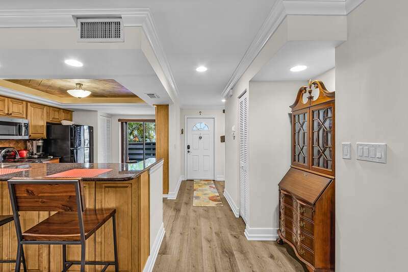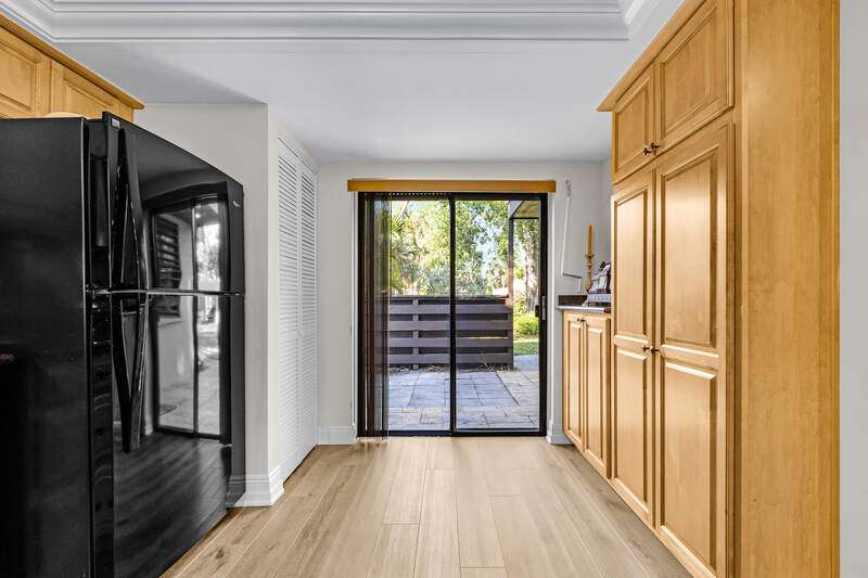 Prime Location in Pinebrook Lakes! This Ground floor unit has been recently remodeled with Granite in kitchen & bath, tile showers, stainless steel appliances in kitchen, flooring, newer electrical & plumbing, crown molding, ceiling fans, new A/C & more fixtures throughout. The Kitchen has a Large island peninsula with storage & a large newer sliding glass door w easy access to courtyard. The Primary bedroom is very spacious with double doors & ensuite bath with a large walk in closet & large tile shower. There is currently an Office area off the primary bedroom with beautiful views of backyard. This space could also be used as an optional third bedroom. The second bedroom is a great size with 2 windows for natural light and convenience to a full bath w soaker tub/shower combo. There is Hurricane glass and doors in back of home & hurricane shutters in front. The welcoming large front courtyard is perfect to enjoy the beautiful landscaping situated in the back of this community. This unit also includes 2 parking spaces (one is covered). The pool is a short walk to a secluded common area that is very private with lush landscaping. A New Roof on this building should be completed in by 7/2025. This community is walking distance to Bell Tower Shopping & Restaurants and Daniels Pkwy & just a short 20 minute drive to the beach.