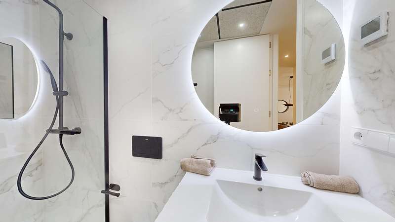 Inside the apartments, you will discover bedrooms with fitted wardrobes. The main bedroom boasts an en-suite bathroom equipped with a walk-in shower. Furthermore, the apartments feature an additional bathroom with a walk-in shower, a well-equipped open-plan kitchen, a dining area, and a generously sized living room adorned with large French-style windows that open up to the sun terrace.