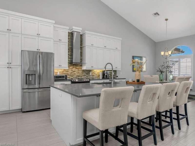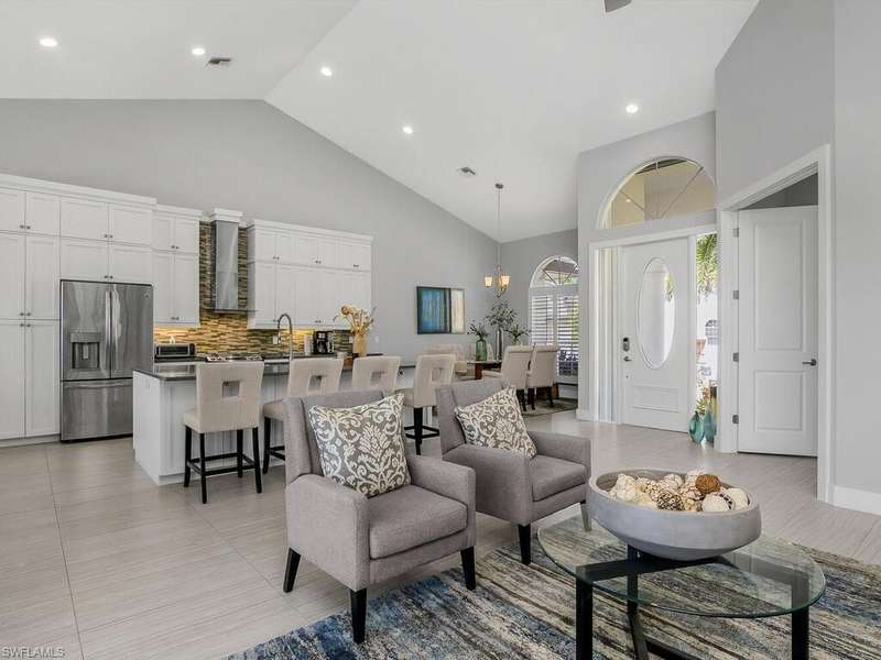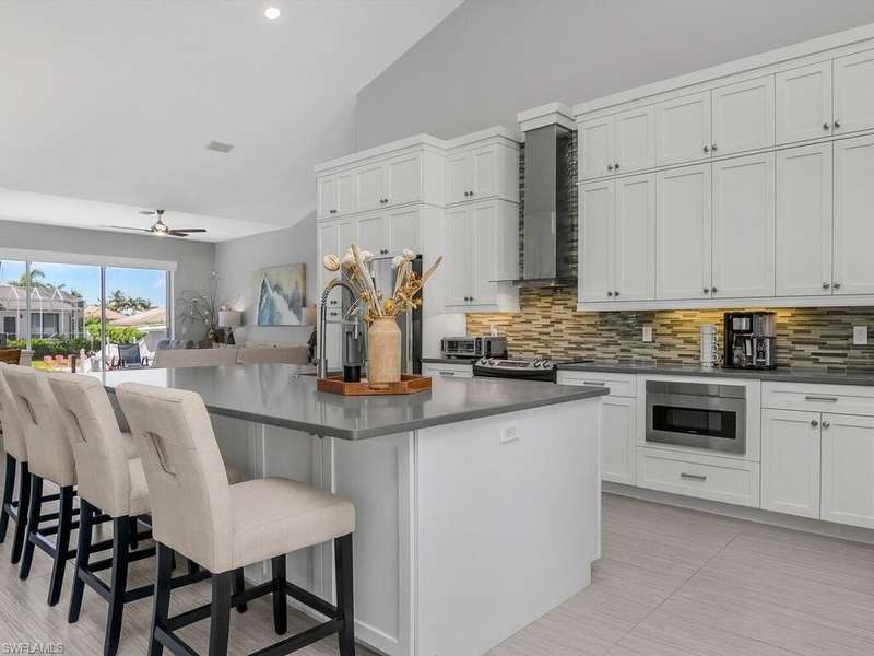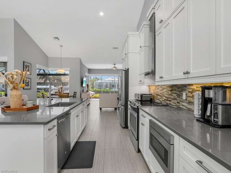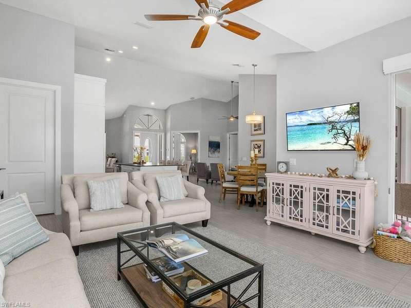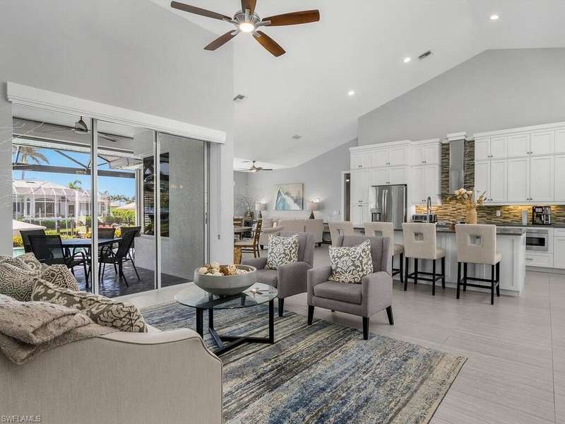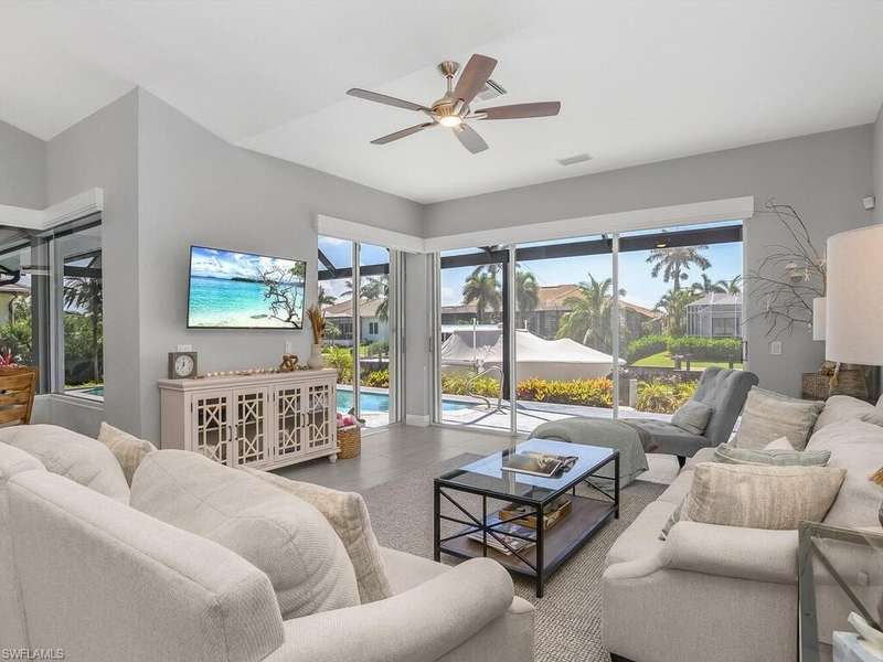 This is more than just a home, it's an invitation to experience the ultimate island lifestyle in a thriving, upscale neighborhood. This water front home located on an oversized lot in the Prestigious Tigertail neighborhood on Marco Island is deep water direct that allows for a larger vessel. Where you can walk, bike or boat to one of our fine shops and restaurants. This elegant home offers a neutral pallet with 3 bedroom 2 baths including an office. Enjoy spacious open split floor plan with high ceilings, large rooms including a family room, sitting room, dining room, breakfast nook, large stone island, fully equipped kitchen, and bahama shutters. The primary suite offers tray ceilings, large stone shower, two closets and two vanities. The back of the house is a wall of windows that overlook the salt water lap pool with panoramic screen. The spacious pool deck is ready for entertaining with a firepit table, sectional and dining table. You can lounge on the deck below alongside the dock with two boat slips. Very well maintained property. The flat tile roof and stylish pavers adorn the driveway that take you to the large garage with ample storage, high ceilings with3 bays and epoxy floor. Professionally decorated, lush landscape, hurricane roll downs, generator on a transfer switch, security system and offered turn key with two boats and two suv’s this is a fantastic opportunity! A ready made island lifestyle in a neighborhood with new elegant modern estate homes. Marco Island is an active lifestyle. Famous for our crescent beach with sugar white sand, easy boating, great golf, tennis, cuisine from around the world and the best sunsets on the planet.