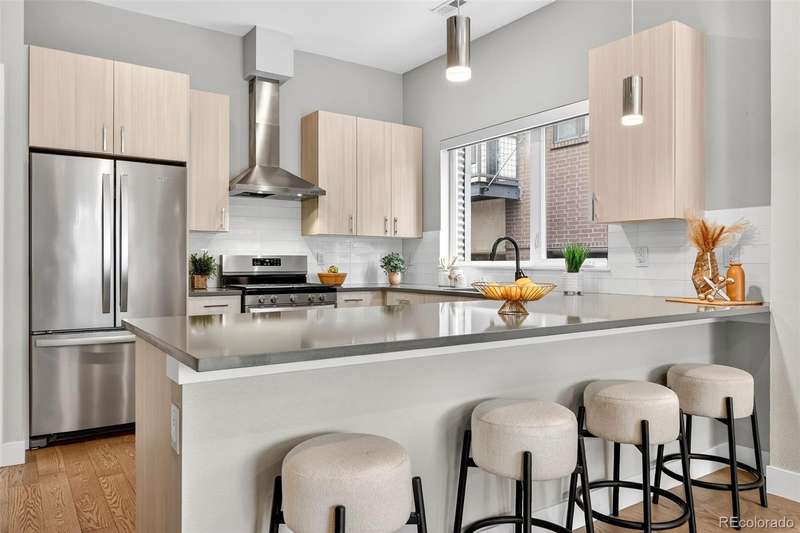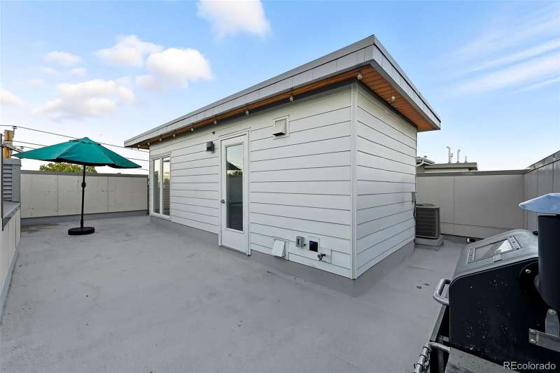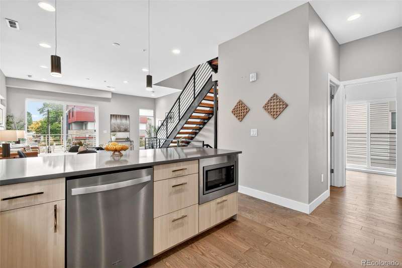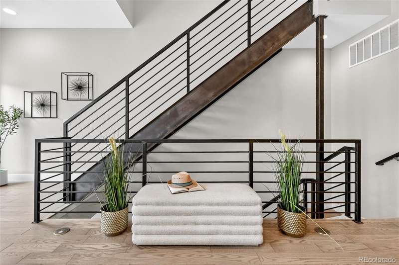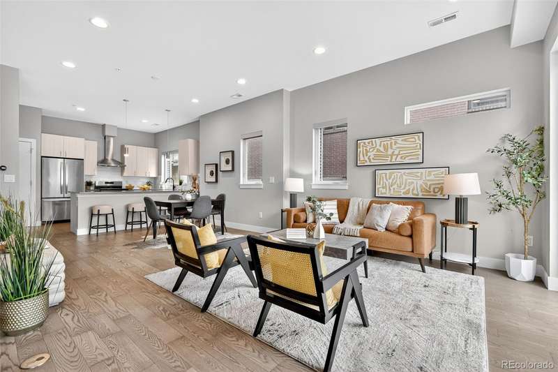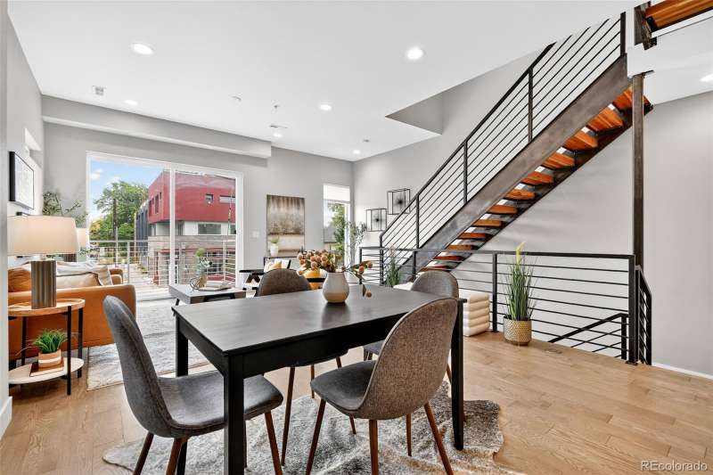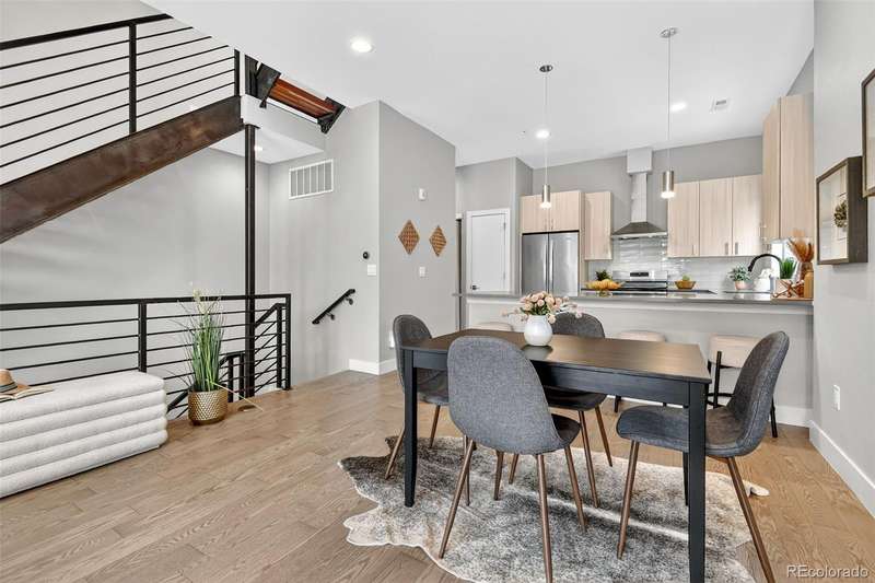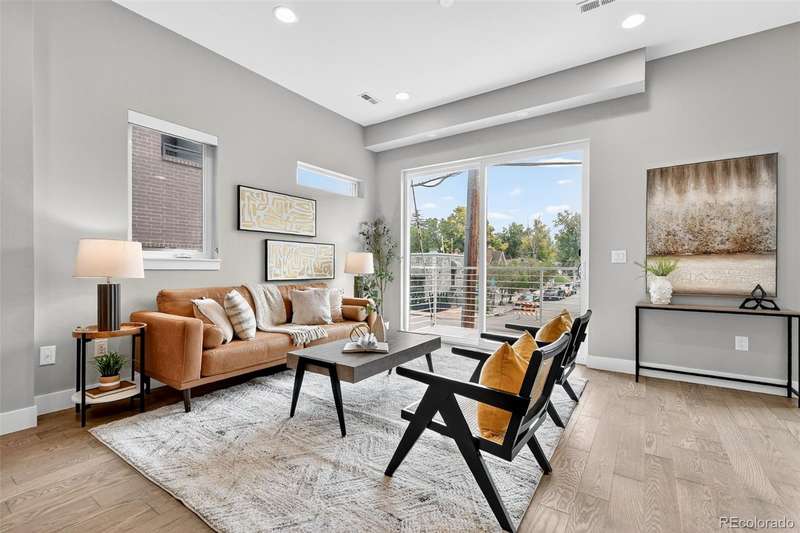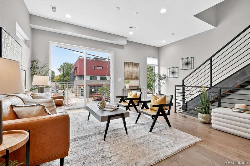 Located in the heart of Denver, this modern townhome offers effortless access to some of the city's most vibrant destinations; the Highlands, Tennyson Street, and downtown are all just minutes away. Inside, the open and light-filled layout connects the living, dining, and kitchen areas, creating an ideal space for both relaxing and entertaining. The kitchen features sleek cabinetry, quartz countertops, stainless steel appliances, and a generous counter that anchors the main level. Two outdoor spaces on the main level include a balcony off the living room and a Juliet balcony off the den or office area. Upstairs, the spacious primary suite includes a walk-in closet and a well-appointed bathroom with dual sinks and a large shower. An additional bedroom with its own ensuite bathroom provides privacy for kids or guests. A convenient powder bath is located on the main floor, and the laundry is thoughtfully positioned near the bedrooms. The entry level features a third bedroom and full bathroom, perfect for a private office or guest suite. The rooftop deck delivers city views and plenty of space to host friends and family. The oversized one-car garage is equipped with a lift system, allowing room for a second vehicle. With its clean modern design and low-maintenance exterior, this home offers the best of city living without the upkeep.