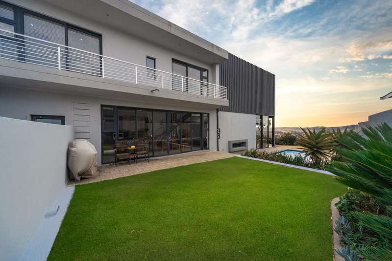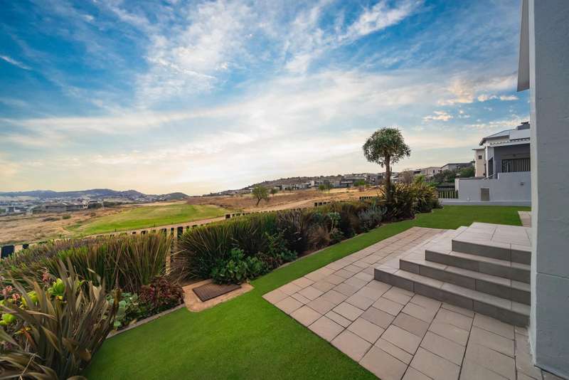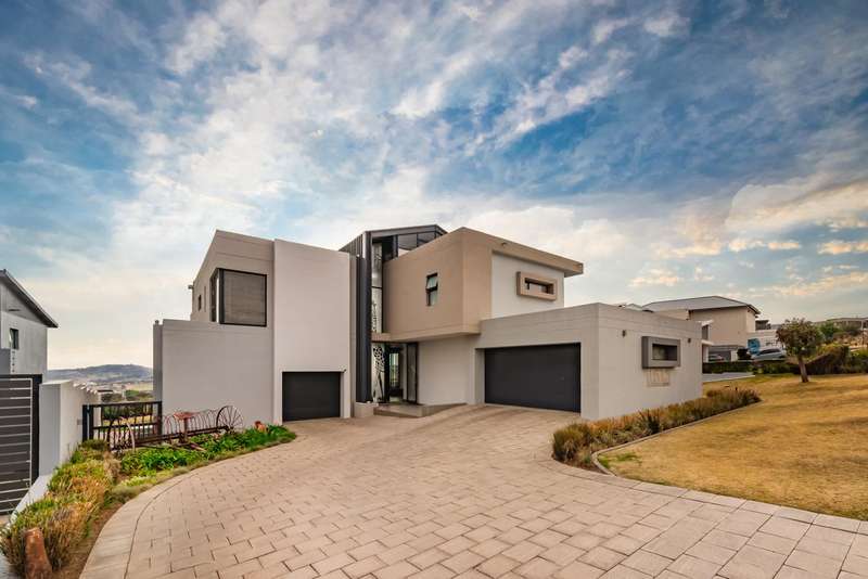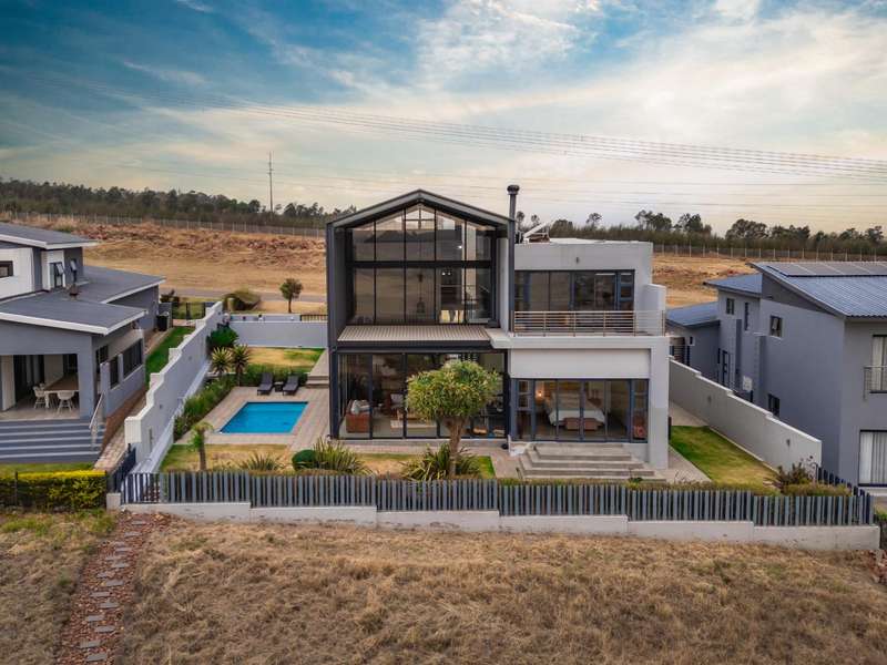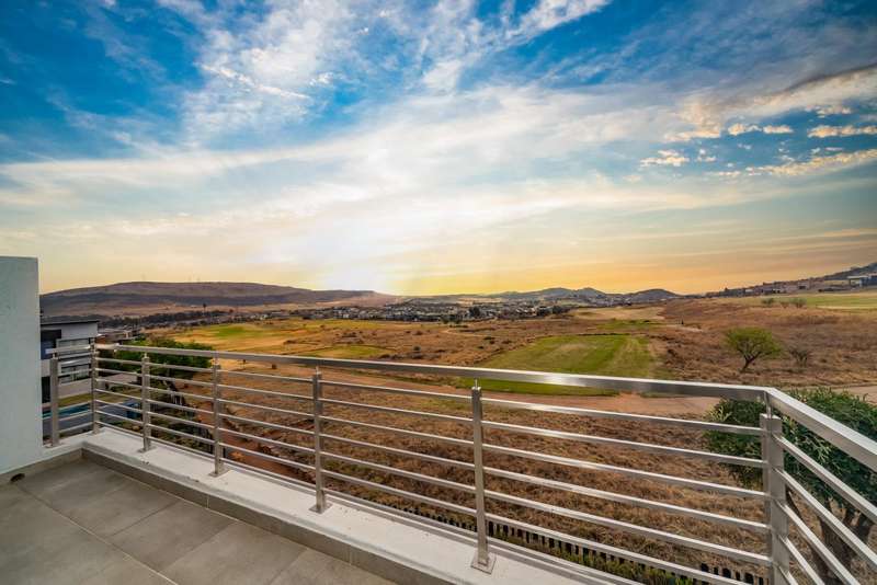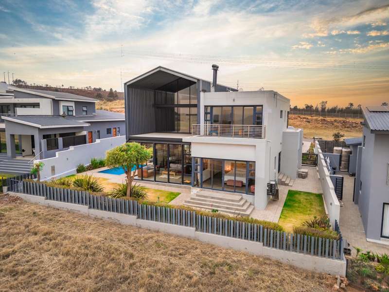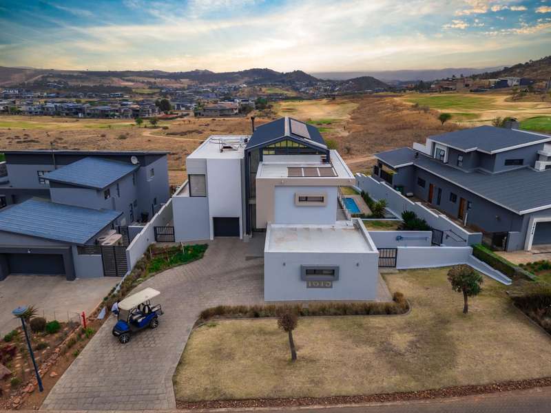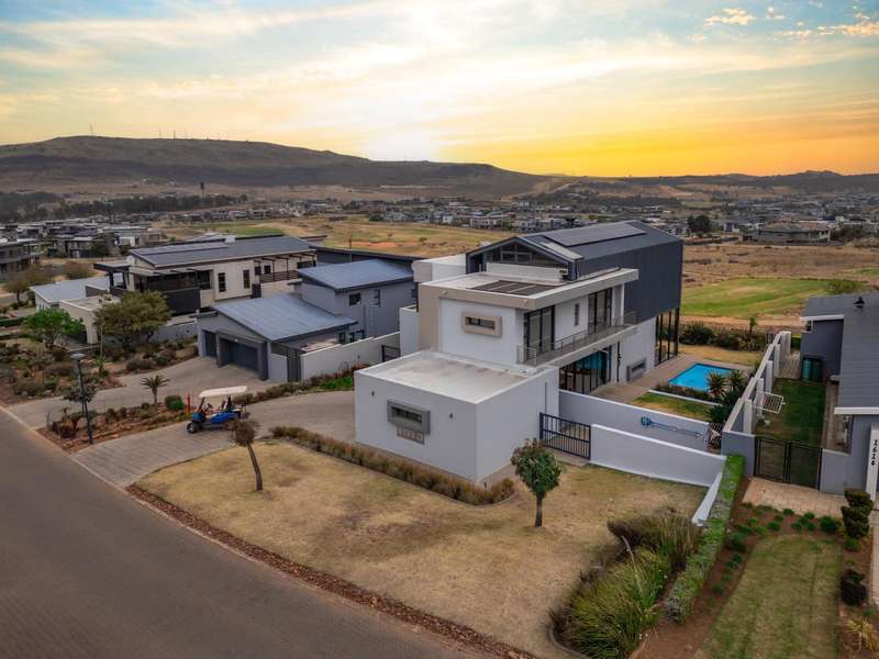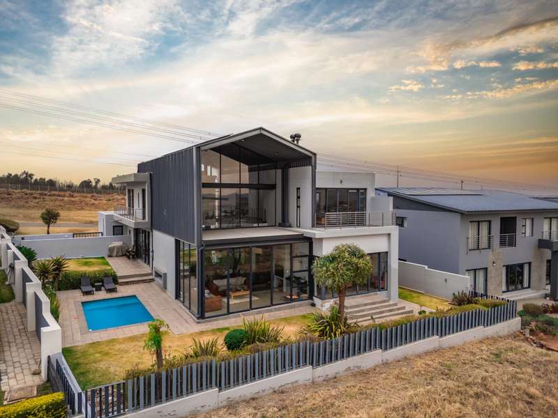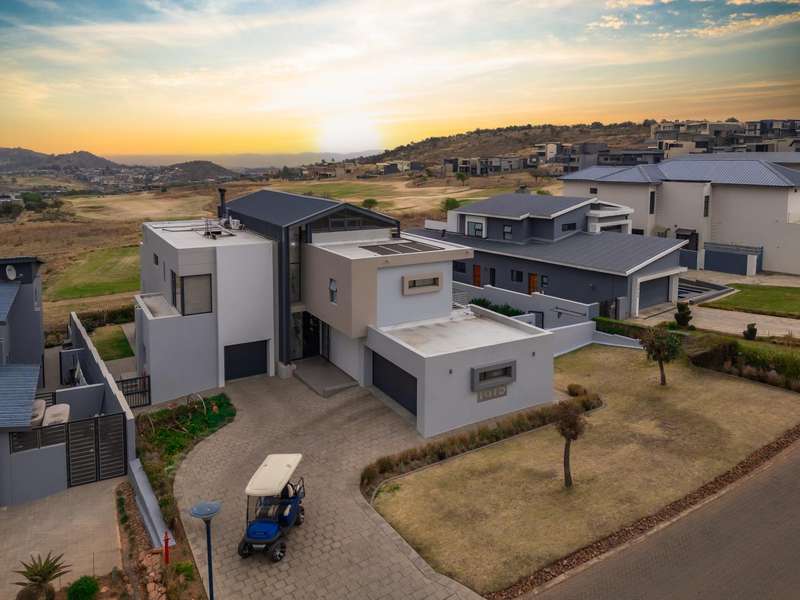Positioned on one of Eye of Africa?ÇÖs most sought-after roads, Panorama Drive, this Niki De Sousa masterpiece commands uninterrupted vistas that stretch across the estate and beyond - even to the ever iconic Soweto Towers on a clear day. A statement in bold, contemporary architecture softened by warm modern-country undertones, this 498sqm residence is defined by light, volume, and effortless flow. From the striking pivot door entry to the dramatic double-volume lounge with 8-metre ceilings, every space has been curated for impact. The gourmet kitchen anchors the home with bespoke cabinetry, a feature island, and premium appliances, seamlessly connecting to the dining and entertainment areas. Stacking sliders invite the outdoors in, leading to a manicured garden, heat-pump pool, and covered patio with built-in braai - the perfect stage for golden sunsets over the 8th and 11th fairways. Four bedrooms, four bathrooms, and a serene pajama lounge create private retreats, while triple garaging, solar power, and E-glass windows ensure modern comfort. Set on a 798sqm stand, this is more than a home - it is an entertainer?ÇÖs dream and a lifestyle investment in one of South Africa?ÇÖs most prestigious estates.