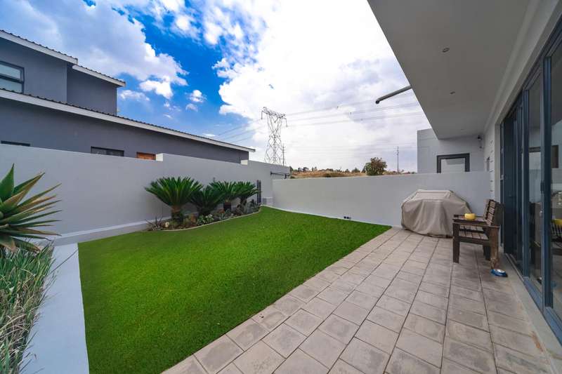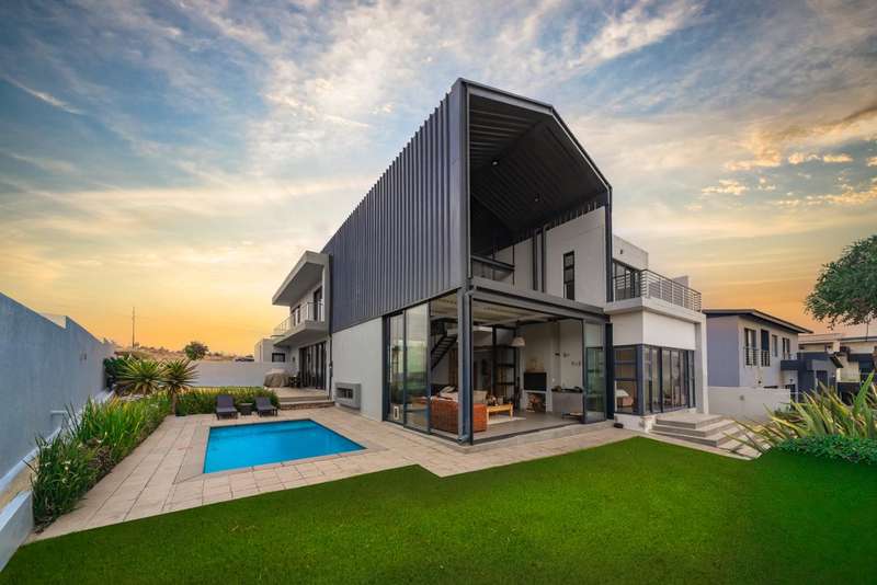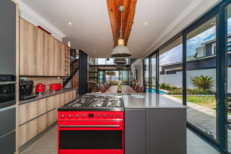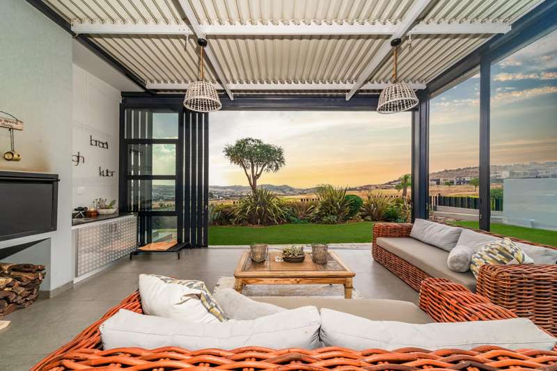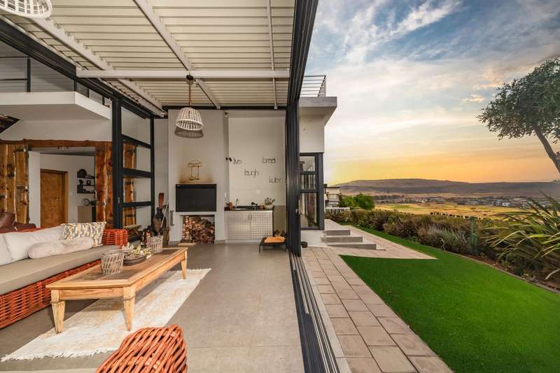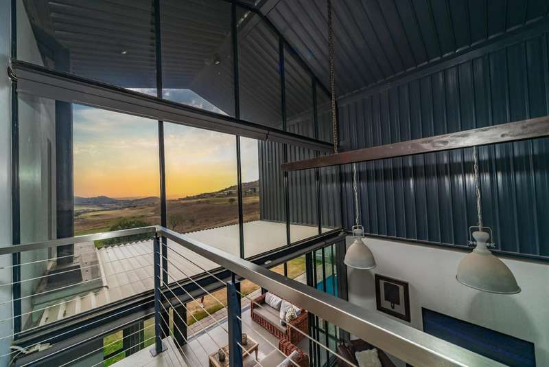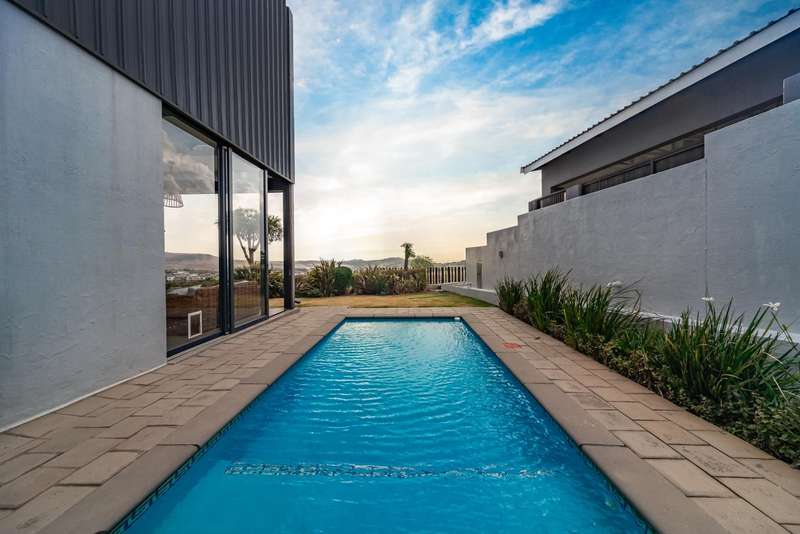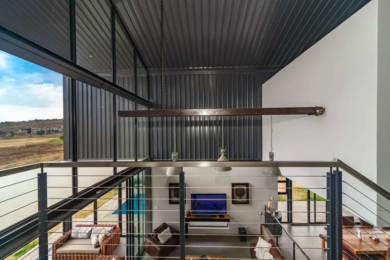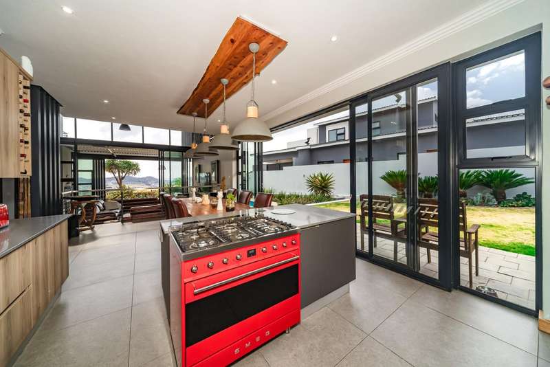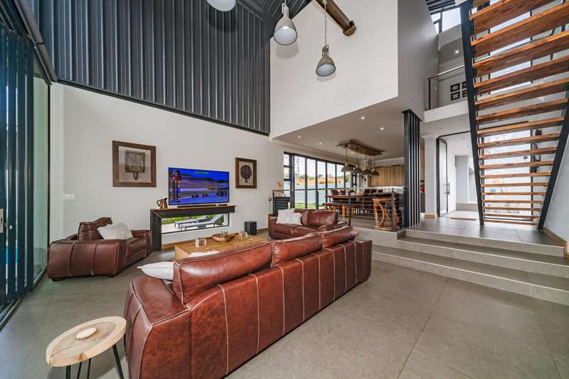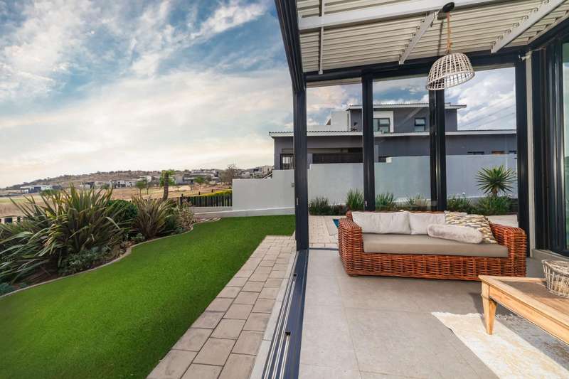 Positioned on one of Eye of Africa?ÇÖs most sought-after roads, Panorama Drive, this Niki De Sousa masterpiece commands uninterrupted vistas that stretch across the estate and beyond - even to the ever iconic Soweto Towers on a clear day. A statement in bold, contemporary architecture softened by warm modern-country undertones, this 498sqm residence is defined by light, volume, and effortless flow. From the striking pivot door entry to the dramatic double-volume lounge with 8-metre ceilings, every space has been curated for impact. The gourmet kitchen anchors the home with bespoke cabinetry, a feature island, and premium appliances, seamlessly connecting to the dining and entertainment areas. Stacking sliders invite the outdoors in, leading to a manicured garden, heat-pump pool, and covered patio with built-in braai - the perfect stage for golden sunsets over the 8th and 11th fairways. Four bedrooms, four bathrooms, and a serene pajama lounge create private retreats, while triple garaging, solar power, and E-glass windows ensure modern comfort. Set on a 798sqm stand, this is more than a home - it is an entertainer?ÇÖs dream and a lifestyle investment in one of South Africa?ÇÖs most prestigious estates.