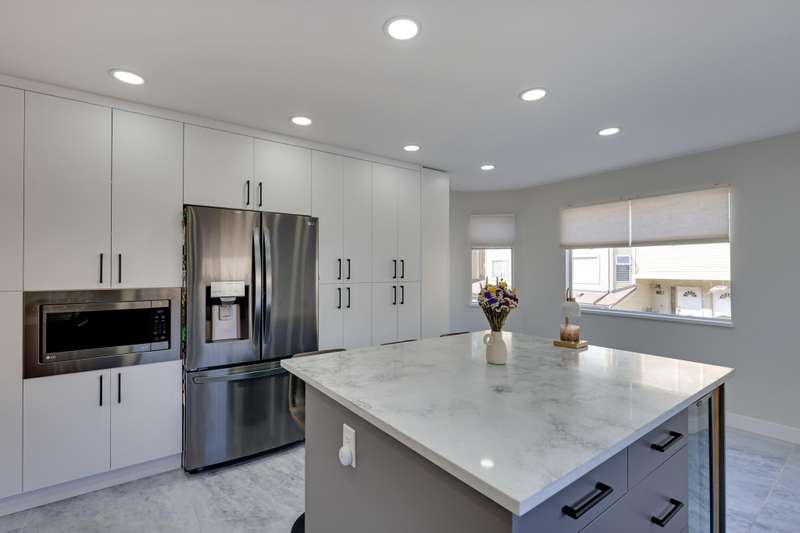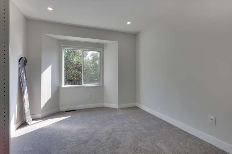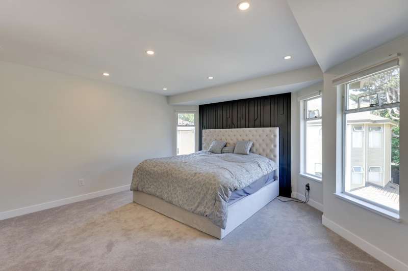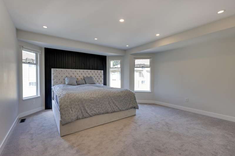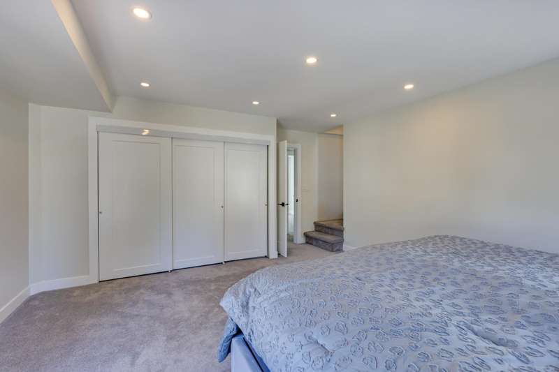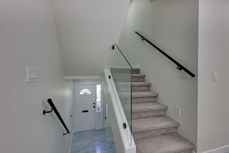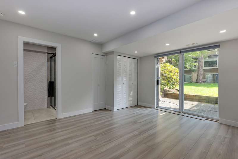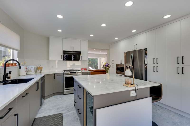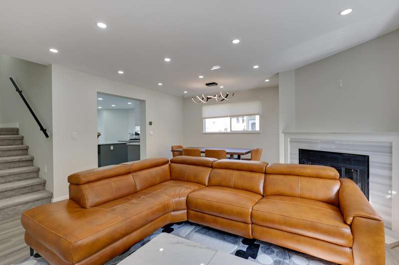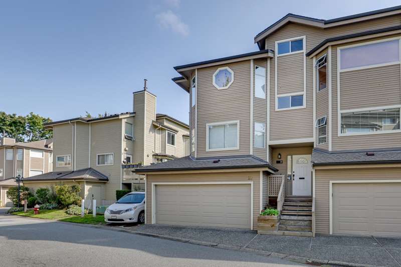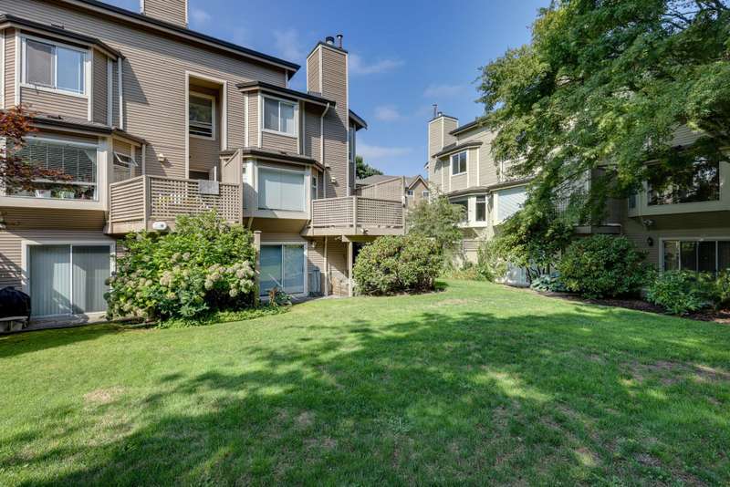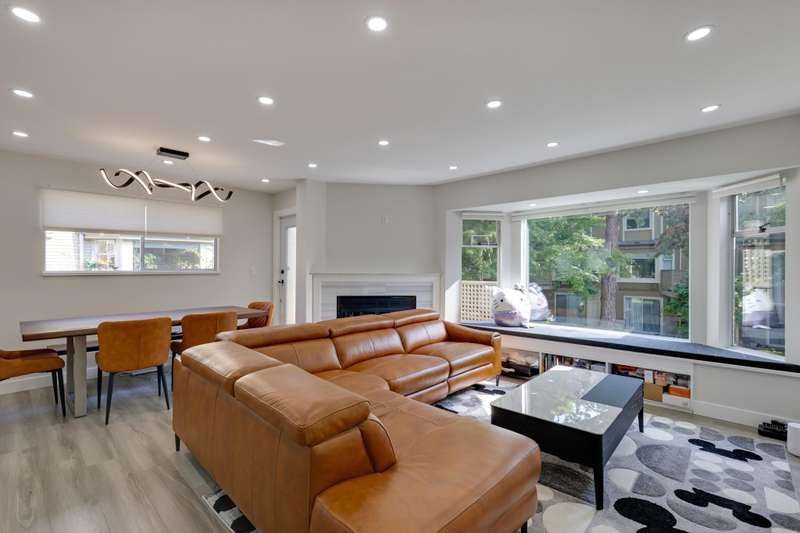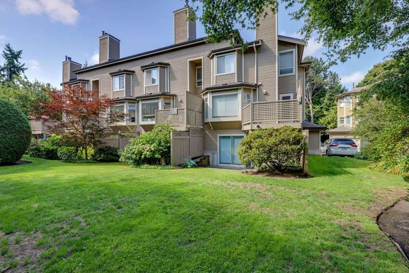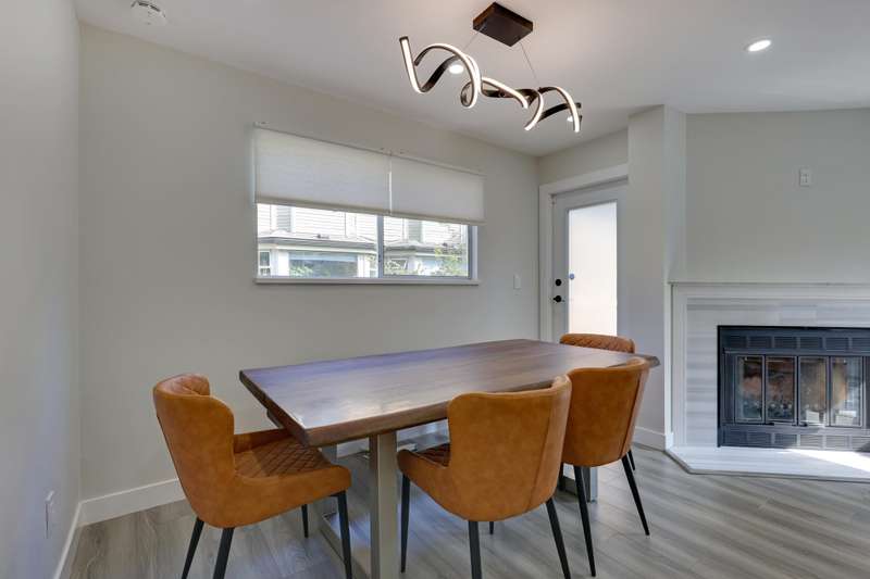 Tastefully updated in 2024, this spacious 4-bedroom, 3 full-bath Corner End unit offers over 1,700 sqft of functional living. Renovated top to bottom with $150K+ in upgrades, including a fully remodelled kitchen with new cabinets, counters, and an oversized island with fold-out extension. All bathrooms updated, plumbing redone, and modern touches throughout—AC, glass railings, recessed lighting, gas fireplace. Enjoy a large deck, lower patio, and double side-by-side garage. Quiet unit inside the complex away from main roads and backing onto the tranquil green space. Steps to transit. Walk to Blair Elementary & Burnett Secondary. Turn Key move-in ready!