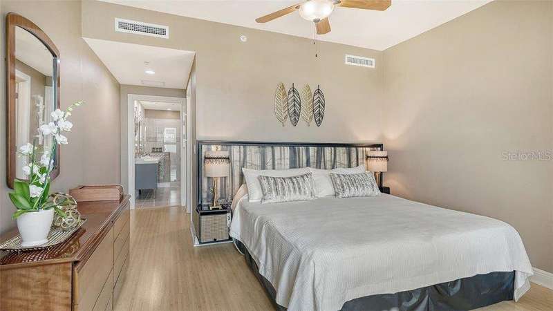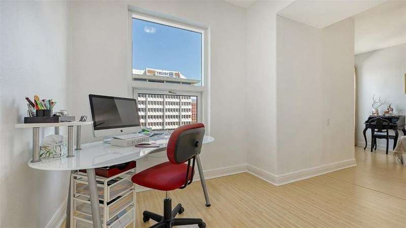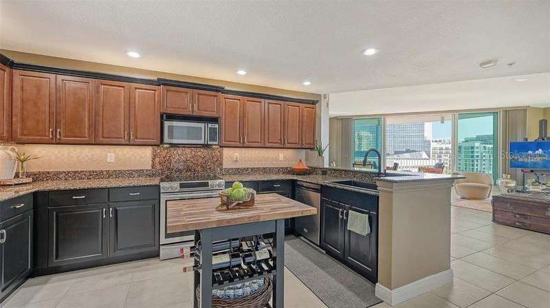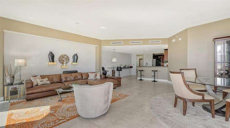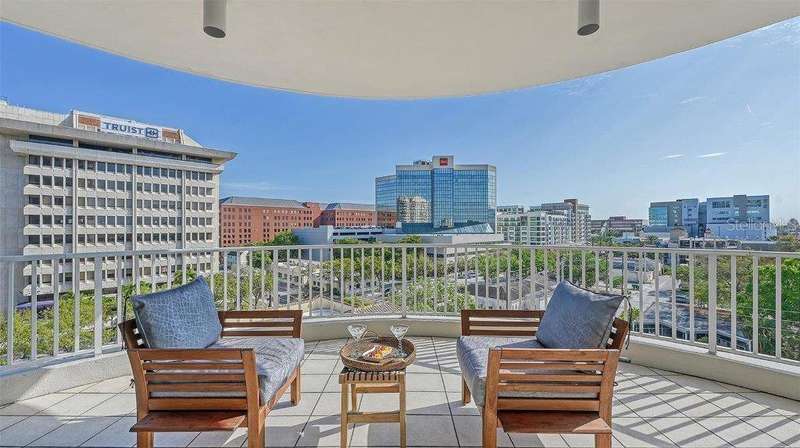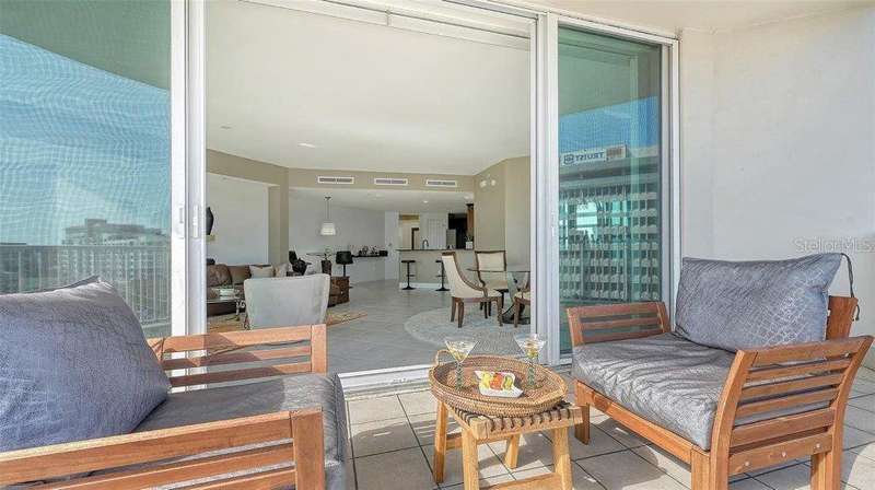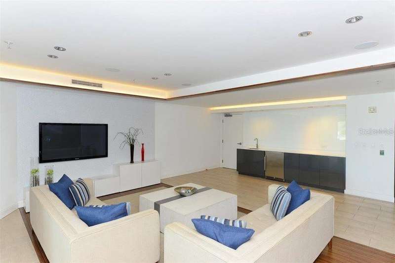Now available for furnished seasonal rental and/or lease to own. Experience stunning sunrises from the spacious terrace of this corner unit located in Rivo at Ringling. This distinctive condominium, renowned for its unique style, interior atrium, and upscale amenities, offers a lifestyle of unparalleled sophistication. This 2-bedroom, 2-bathroom, 1,735 sq. ft. residence features a split floor plan with two primary suites, recently renovated bathrooms and brand-new washer/dryer set. The centerpiece of this unit is its central living area, ideal for entertainment. Flooding with natural light the living and dining spaces flow seamlessly onto a large terrace with non-slip tiles. A chef’s kitchen featuring raised panel wood cabinetry, black granite countertops, stainless-steel appliances and plenty of storage has been recently refreshed with contemporary finishes. Relax in your peaceful primary suite with a walk-in closet and renovated bathroom with dual vanities, walk-in shower, and soaking tub. The cozy second bedroom suite boasts a bright and airy atmosphere, complete with a den/study for added functionality and comfort. As a bonus, the large entryway closet has custom built-ins for added storage. This unit also includes two deeded parking spaces and a large storage unit measuring 13’ x 8’ x 10’. Rivo at Ringling offers many great amenities including concierge, heated pool and spa, sundeck with outdoor grill, spacious fitness center, social and conference room for resident's use and a convenient area for bike and kayak storage. A fantastic location within the heart of downtown Sarasota with effortless access to shopping, entertainment, movies, Saturday Farmers Market, airport, and the wonderful beaches of Sarasota.