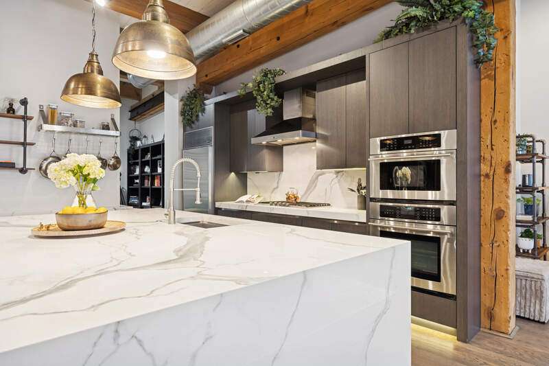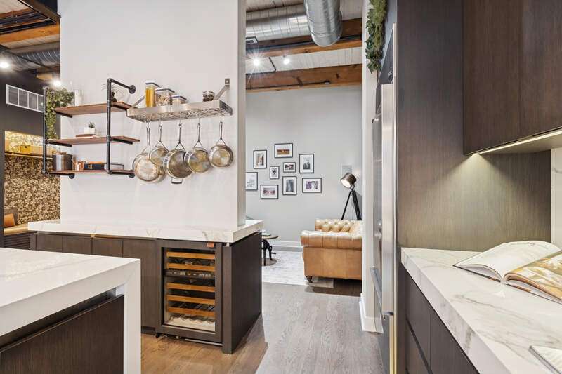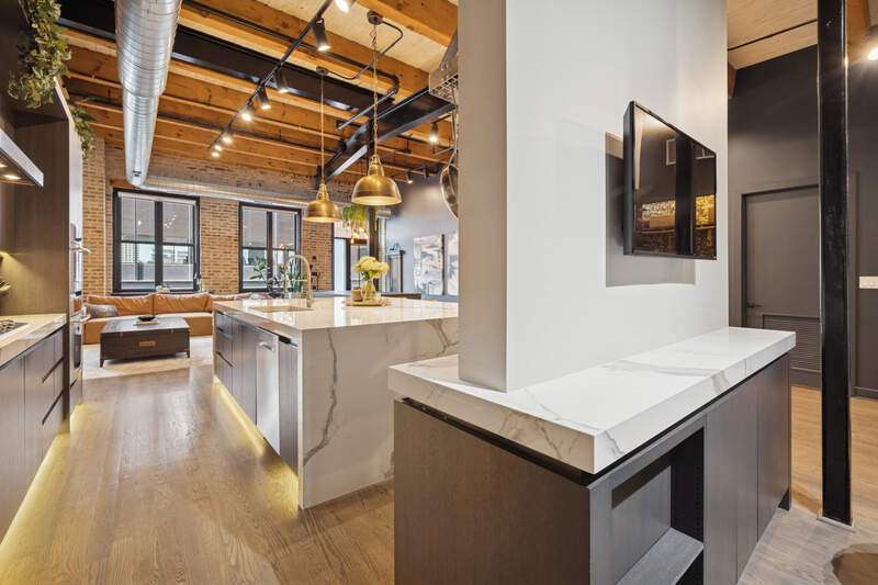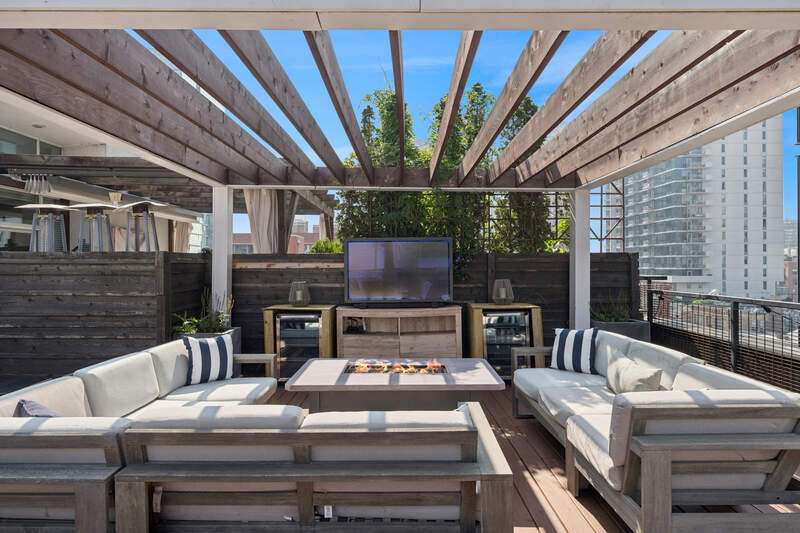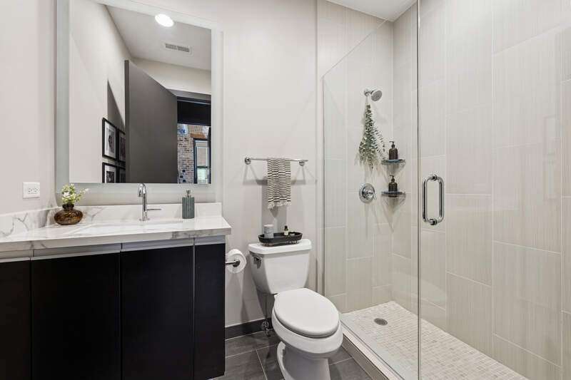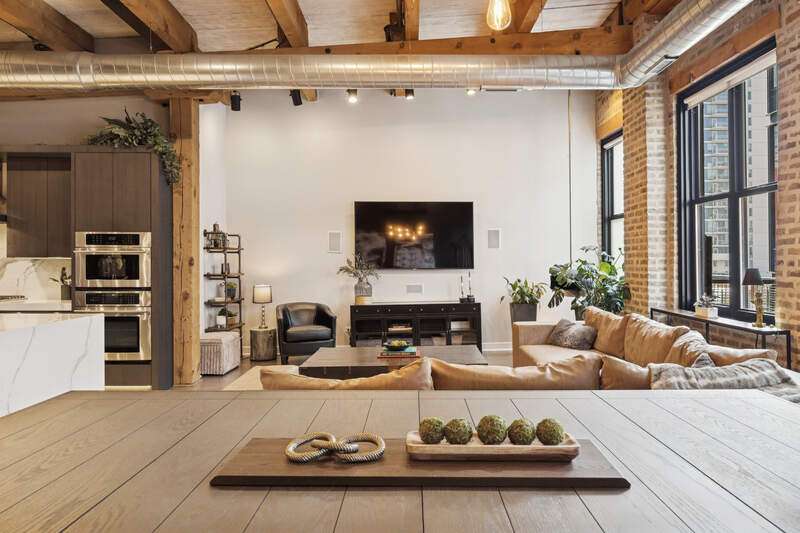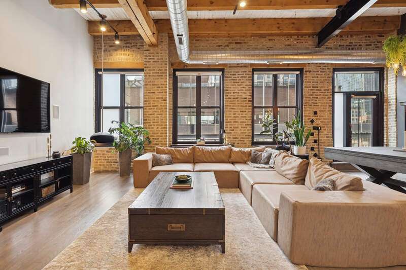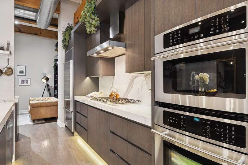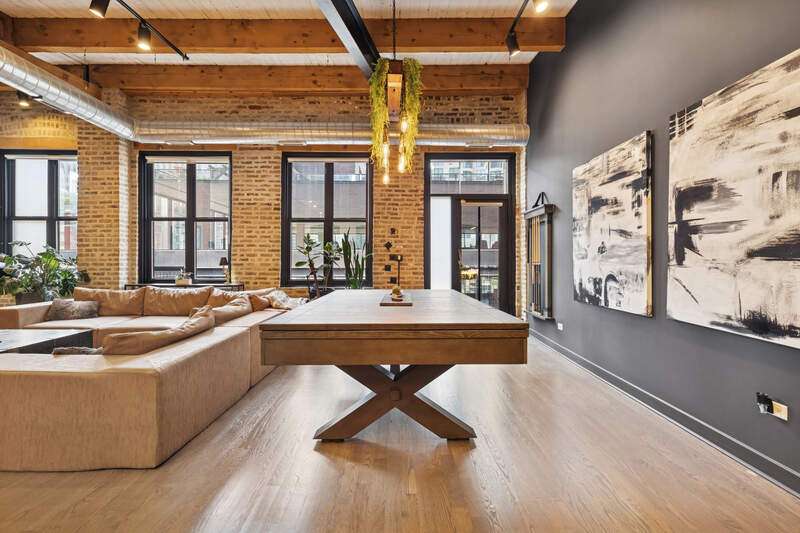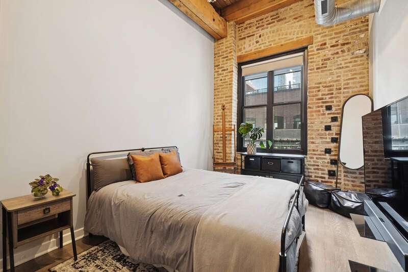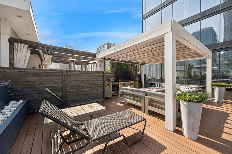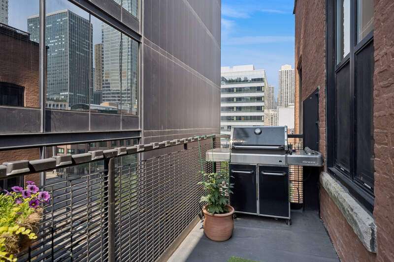 Welcome to 154 W Hubbard - a chic and stylish loft with an impressive 1500 SF private roof deck showcasing stunning 360-degree city views. Flooded with north and east-facing light, this residence wows with its soaring 14 ft ceilings, exposed brick, hardwood flooring throughout, and sleek finishes. The entryway makes an impression with a built-in custom leather-upholstered bench with storage. The expansive floor plan flows seamlessly throughout the living space, creating the perfect space to entertain. A sun-filled living/dining area has ample room for substantial seating areas, a large dining table, a piano, or perhaps a pool table. A balcony off the living room provides the perfect place to grill. The living space opens to an exquisite kitchen, which was fully upgraded with upscale finishes in 2020 and features an oversized island with matching countertops and backsplash, custom cabinet system, and Sub-Zero, Bosch, and Viking appliances including a wine fridge. The third bedroom space is currently configured as an open den just off the kitchen with a dry bar. The primary suite has a graciously sized bedroom with a custom walk-in closet. Completely renovated in 2024, the ensuite primary bath was transformed into a spa-style retreat offering a steam shower, heated floors, new stone flooring and walls, a double sink, and private commode. The second bedroom is located across the hall from an elegantly appointed full bath with shower. A large in-unit laundry room with new LG washer and dryer offers additional storage space. The 1500 SQFT private rooftop deck has a pergola-covered seating area with firepit, an outdoor kitchen with bar seating, and newly stained flooring as of June 2025. This incredible space is perfect for entertaining guests or simply relaxing. Heated, attached garage parking for one car is included in the price. This boutique elevator building has a friendly tight-knit community with proactive homeowners. Located in the heart of Chicago's vibrant River North neighborhood, this home is just steps from eclectic restaurants, bars, shopping, grocery stores, coffee shops, and public transportation.