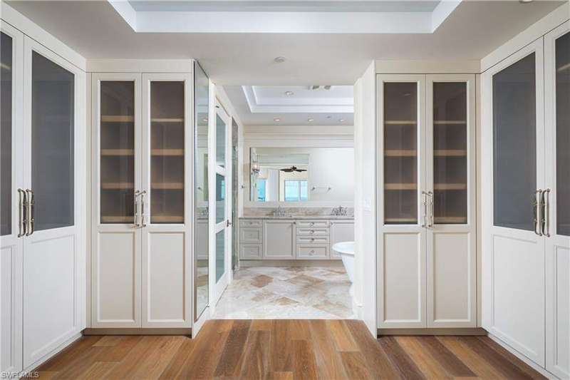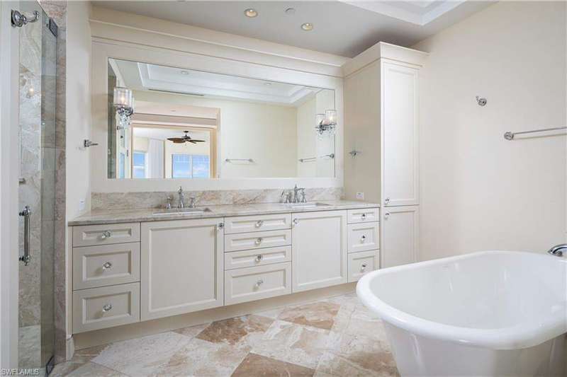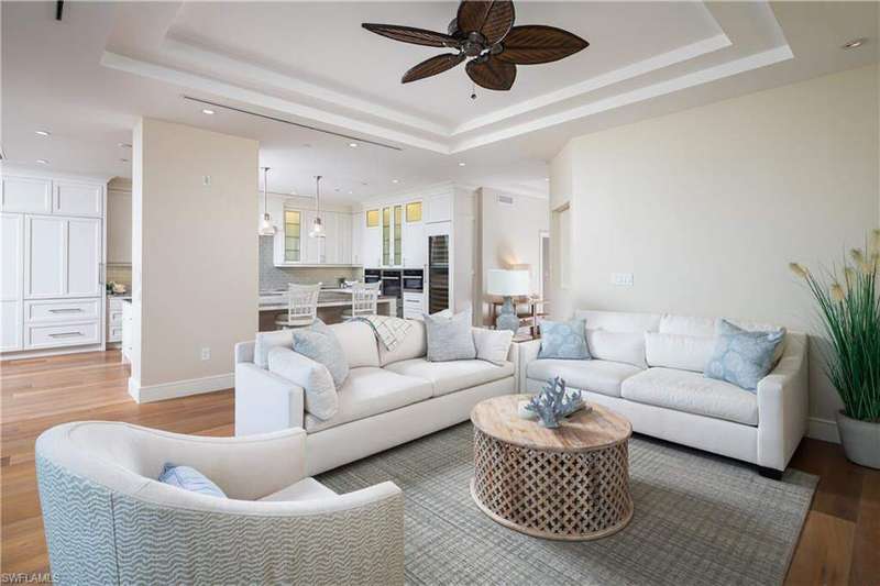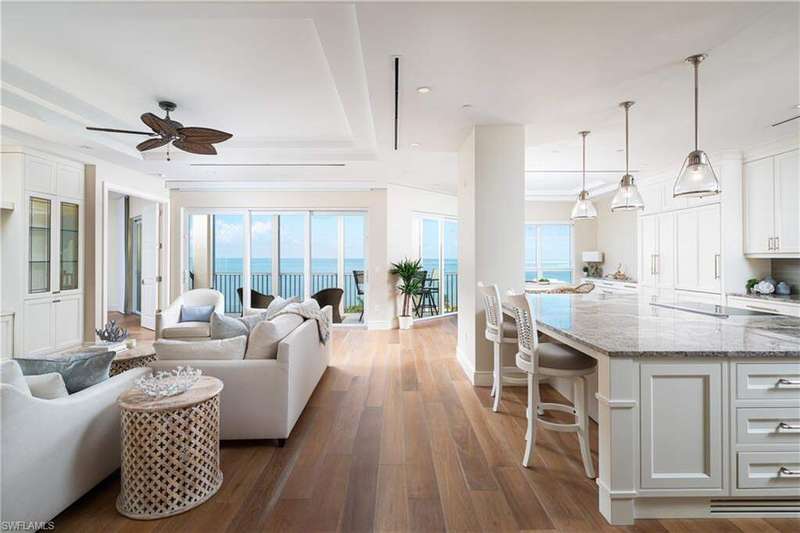 EXQUISITELY REMODELED, STATE-OF-THE-ART D-UNIT PENTHOUSE IN NORTH NAPLES' COVETED BAREFOOT BEACH CLUB! Rarely available, this extraordinary residence offers breathtaking, unobstructed Gulf views and is the only building on the bayside with west-facing balconies, ensuring spectacular sunsets over the Gulf of Mexico year-round. This coastal contemporary masterpiece has been completely redesigned to showcase the finest features and finishes. From extra-high ceilings exclusive to penthouses which have been raised and customized with tray accents to stunning wide plank oak flooring, this penthouse has been meticulously crafted. Fully storm protected, this unit boasts new hurricane impact windows throughout, electric storm shutters, and a brand-new roof on the building! The open floor plan spans 2,266 sq ft and includes 3 spacious bedrooms, 3 luxurious bathrooms, an additional storage unit, and ample storage throughout. The chef's kitchen is a culinary masterpiece, featuring elegant white and glass-enclosed cabinetry, an oversized granite island, dual sinks, and top-of-the-line appliances including a Miele induction cooktop, steamer oven, oven, warming oven, microwave, dishwasher, Sub-Zero refrigerator, freezer drawer unit, and a full-size wine fridge. The well-designed split floor plan offers privacy and convenience, with guest bedrooms with en-suite baths situated at the front, while the serene primary suite is positioned on the waterfront side. The primary suite is a tranquil haven with breathtaking Gulf views and private lanai access. It includes an expansive walk-in closet with custom built-ins and a spa-like bathroom with dual vanities, a standalone tub, and a spacious walk-in shower. Additional features include dual zoned HVAC systems with Nest thermostats and linear vents, new hot water heater (2024), hot water circulator, whole unit water filtration system and separate reverse osmosis system in the kitchen, UV film on all windows (2023), electric solar blinds in the living room, and custom built-in cabinets throughout. The Club at Barefoot Beach includes fine & casual dining, private pool, tennis courts, beachside food & beverage service, planned social activities & more (WITH A MEMBERSHIP). Nearby to the NEW CLUBHOUSE with state-of-the-art fitness center & resort-style pool. Enjoy 3 miles of Gulf-frontage, 2 beachside pools/spas, fitness center, 24-hour manned/gated entry & on-site mgmt. Located minutes to Mercato, Waterside & easy access to RSW Airport.