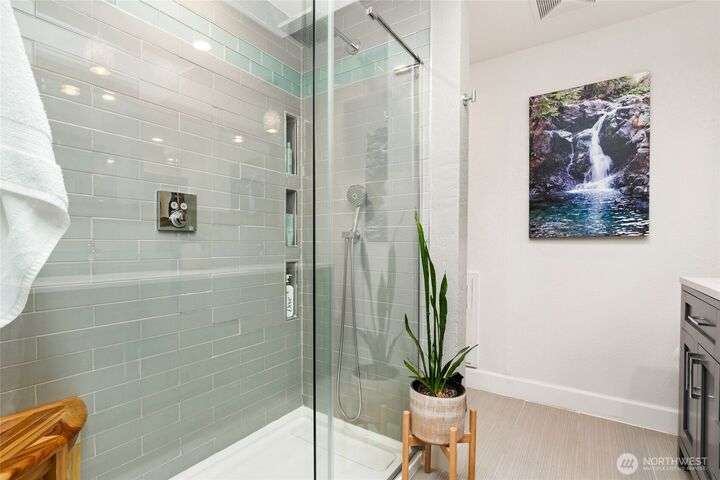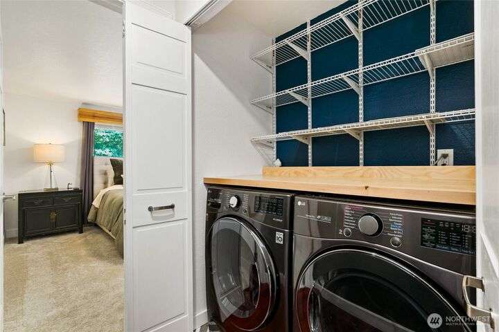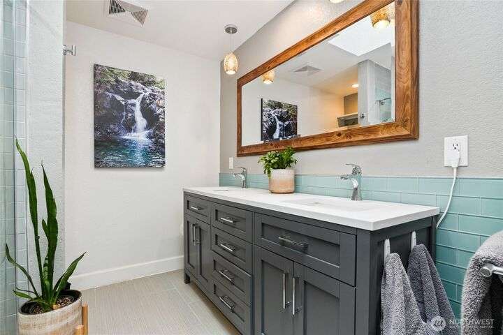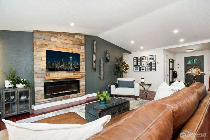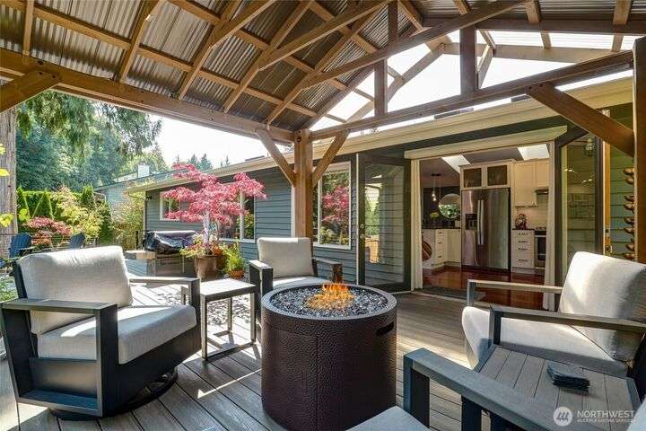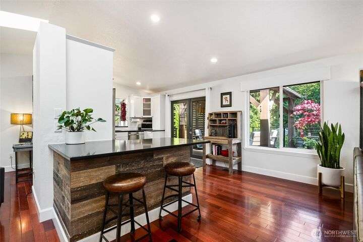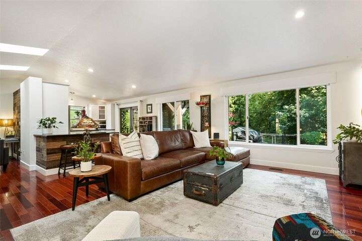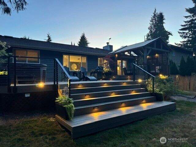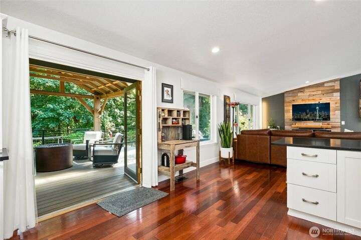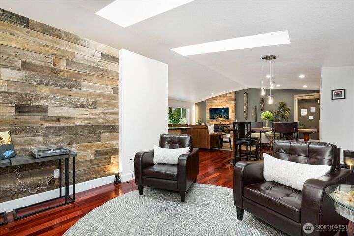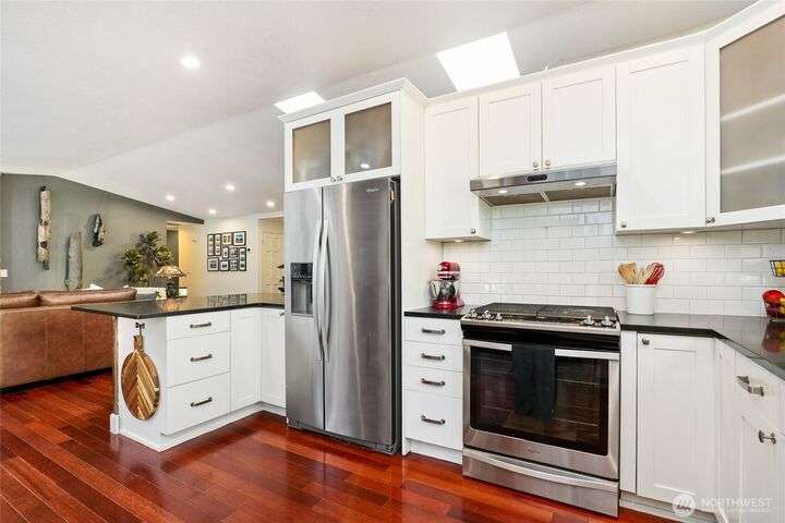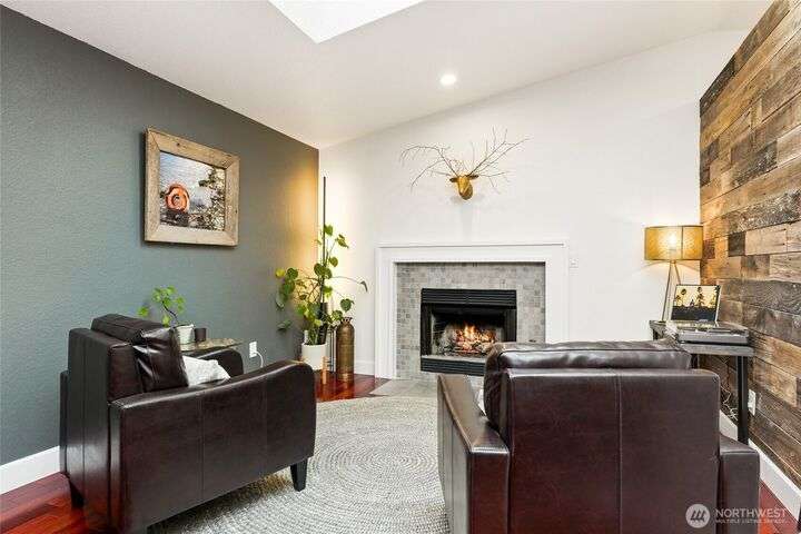 Exceptionally updated rambler combining functionality, tasteful upgrades, and classic comfort! Located on a fully fenced/flat lot, backed against a private + untouchable greenbelt. Fresh interior + exterior paint. Open-concept living featuring vaulted ceilings, skylights + 2 fireplaces. The kitchen shines w/ quartz counters, painted cabinetry, new backsplash, lighting + ss appliances. Primary suite boasts dual closets + a reimagined bath w/ walk-in tile shower + dual-sink vanity. 2 additional bedrooms feature upgraded closet systems, one w/ a Murphy bed + built-ins. Entertain on the expansive TimberTech deck w/ lighting, gazebo + lush landscaping. Newer heat pump, furnace + water heater. Near parks, schools, highways, shopping + dining!