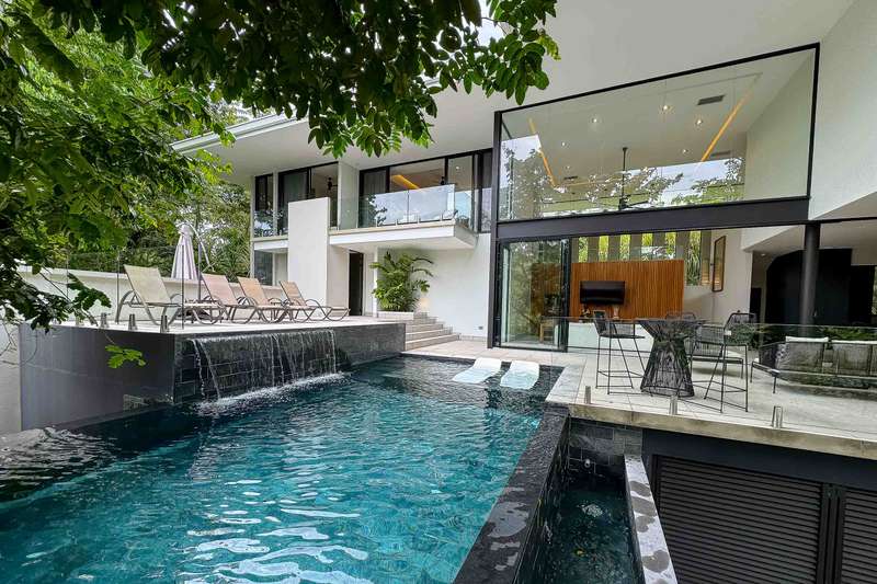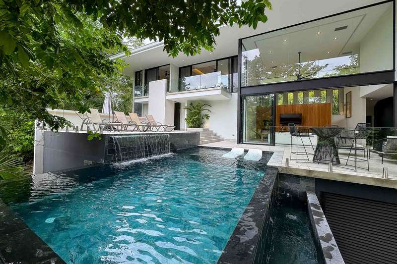 Each of the three bedrooms boasts its own full en-suite bathroom, ensuring ultimate comfort and privacy for all. The heart of the home is a stunning open-concept kitchen, adorned with high-end appliances, inspiring culinary adventures for any chef. Step outside to a deep ocean-blue swimming pool, perfect for a refreshing dip or tranquil relaxation, surrounded by meticulously designed tropical gardens that create a truly private sanctuary. An inviting outdoor BBQ area provides the ideal setting for entertaining family and guests amidst nature's splendor.