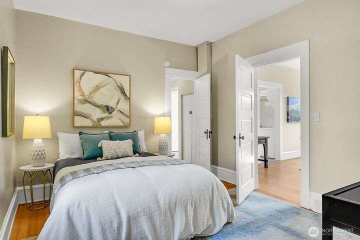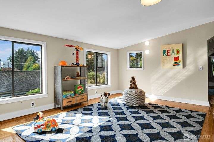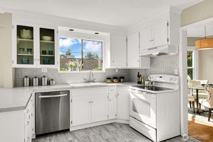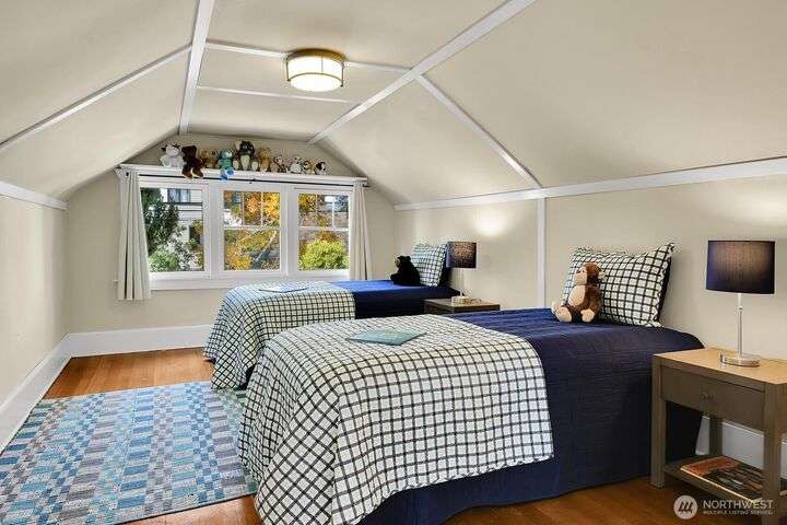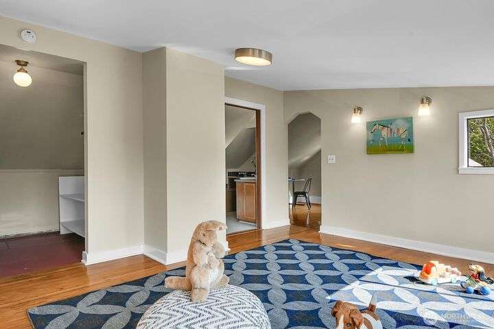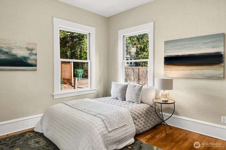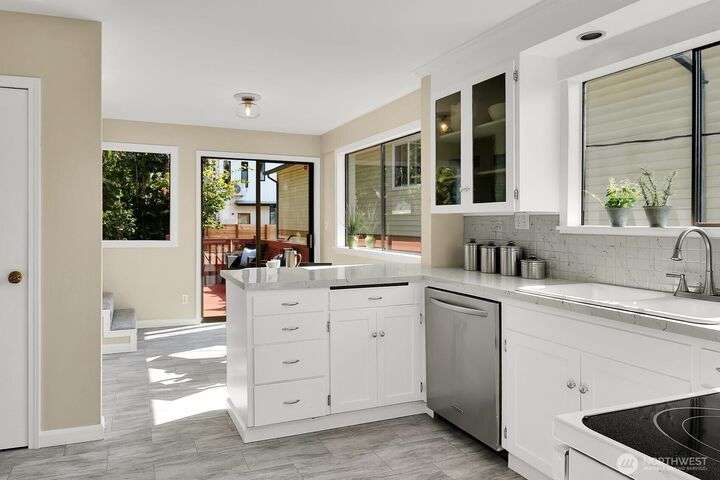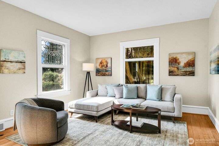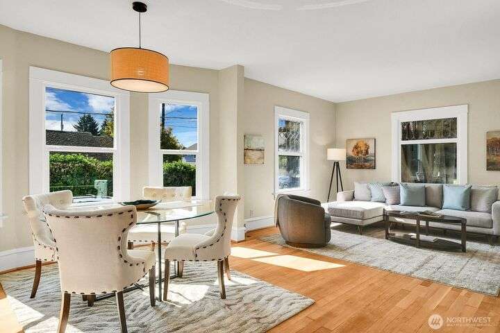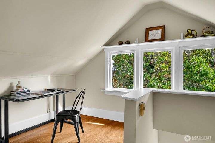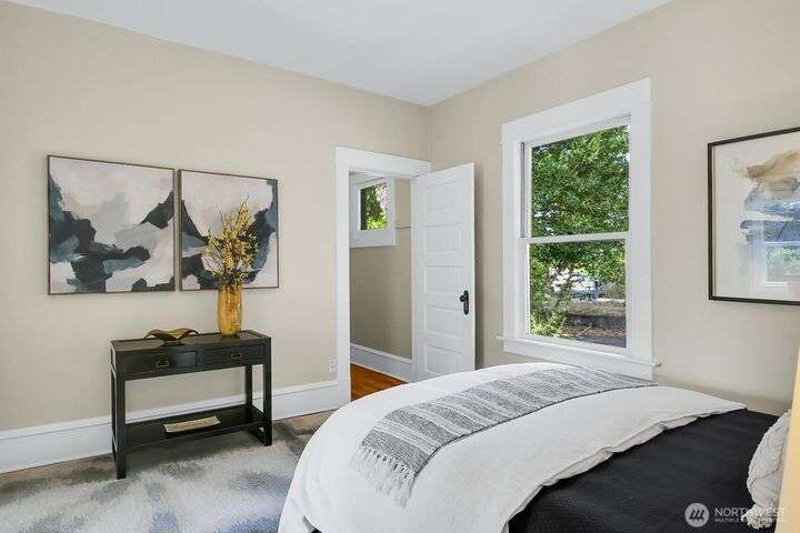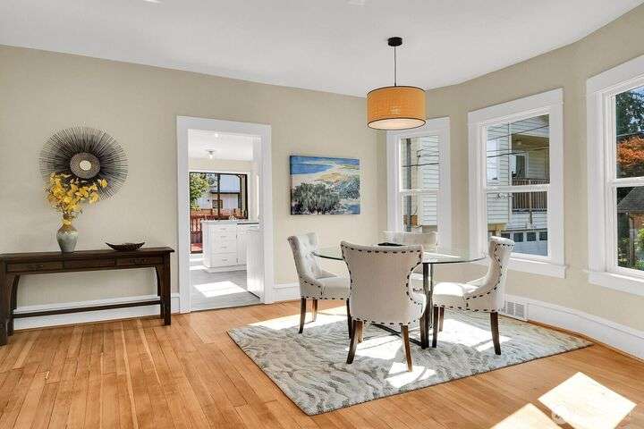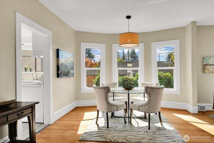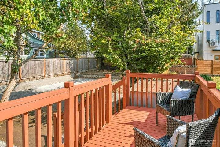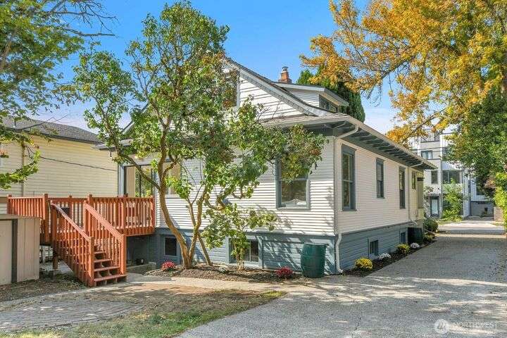 This remarkably inviting, attractive & classic bungalow shows beautifully & possesses exceptional curb appeal. Lovely front porch opens to a true formal entry. Welcoming spacious living rm. Grand bay window in the dining rm. Cook’s kitchen w/ an abutting breakfast nook & sliding glass drs to the deck. Enjoy the grandeur of 9ft ceilings & beautiful fir flrs throughout the main level. Tons of natural light grace this home. Upper level bedrm, office space, family rm & 2nd full bath. The unfinished lower level is ready for your expansion & personal touches. Wonderful 5,500 SF level grounds offer private living space or room for a DADU or perhaps more. Close to shopping, transportation, schools & parks. A truly lovely home & a great opportunity!