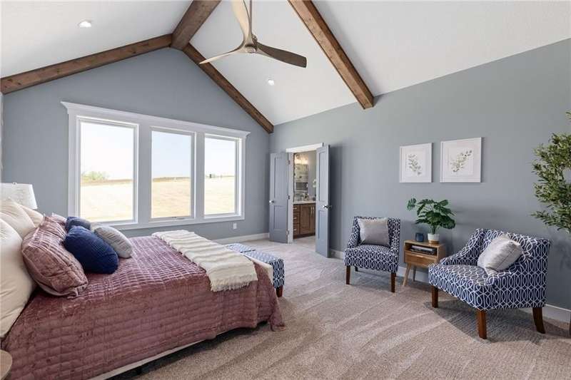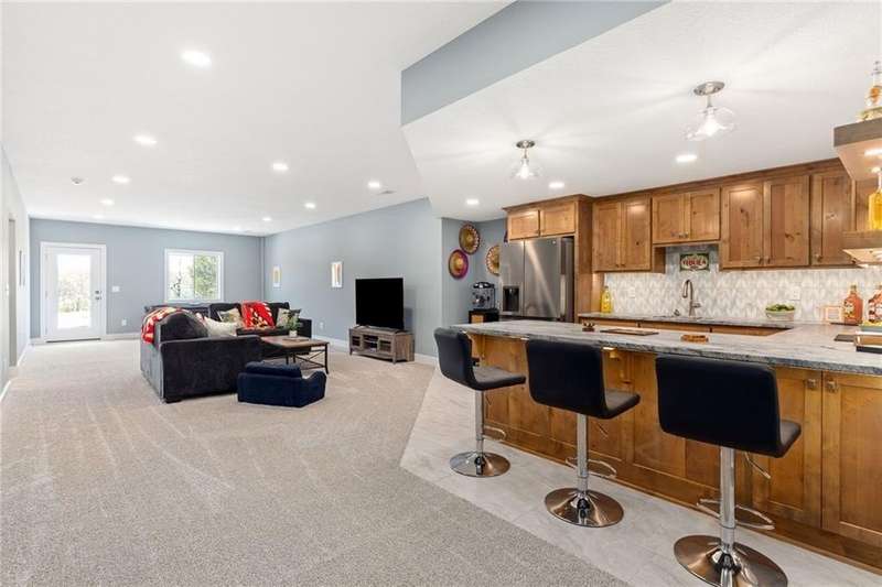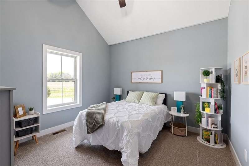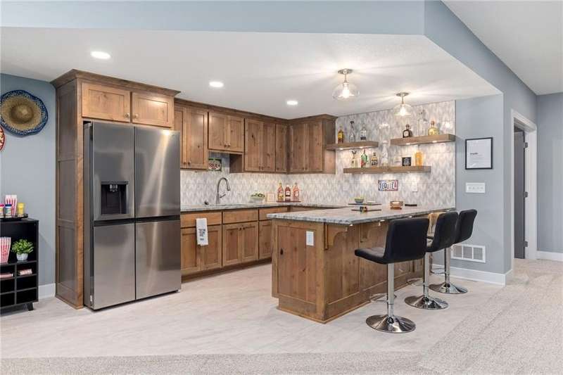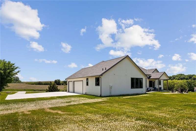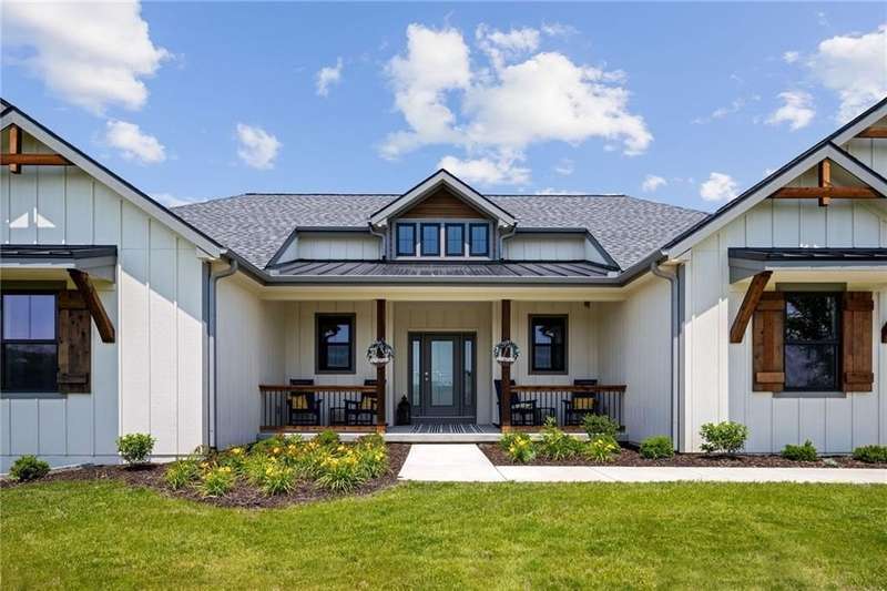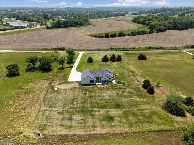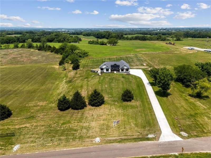 MOVE-IN-READY! *PARADE OF HOMES WINNER!*Meadowlark Ranch / reverse plan by PCDI Custom Homes on 2.5 acres! 5 Bedrooms & 3.5 baths - First floor primary suite, 2 Secondary bedrooms on first floor, 2 additional bedrooms on lower level- Theater Room in lower level with 2-level seating & bar seating. 1st floor living with 12’ ceiling, stone /gas fireplace, and built-ins- Lower-level family room features full wet-bar and access to walkout patio. 1st floor laundry with sink- Kitchen with 8’x4’ island and stainless appliances including refrigerator! Walk-in pantry with countertops. Upgraded trim details & accents throughout! Spacious primary suite with Large triple windows and vaulted ceiling with beams. Primary Bath with heated floor, large dual vanity space, freestanding tub, and large tiled shower with Rainhead + regular showerhead, & bench. Large spacious walk-in closet. Andersen window package, Lennox 96% efficient HVAC system, Delta plumbing fixtures throughout. Paved roads and Basehor-Linwood Schools!