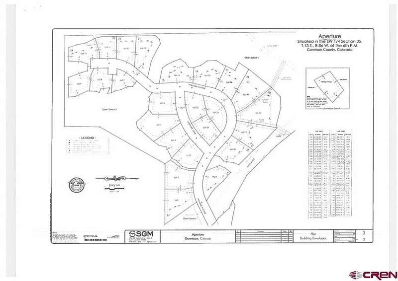 Charlie Farnan, Bluebird Real Estate, LLC, C: 970-209-0609, cfarnan@mountainoffice.com, www.crenmls.com: NEW PRICE OPPORTUNITY! Price is now $1,850,000. Building site #3: Amazing southern exposure and an ideal level site – a builder’s dream• Aperture is made up of 23 single family building sites, ranging from 0.32 to 0.96 acres • Contiguous to the Town of Crested Butte • Entrance is from Gothic Road (CR 317) on to Pyramid Avenue, Bridge will span the Slate River leading into a private neighborhood that is walkable to town• Owners may build up to 5,000 sq. ft. of finished space with an extra 750 sq. ft. of detached/accessory building for garage or additional living space • Amenities include private homeowner river park with grilling, fire pits, covered pavilion, recreation lawn and private river access for kayaking, paddle boarding, fishing and other water activities • A landscaped pedestrian trail along the west side of the Slate River will provide a connection to the Mt. Crested Butte recreation path • A decorative fence and additional landscape buffering will screen the view to the service yard across the river • Interior roads will be 24’ wide, including a concrete apron, with designated snow storage areas within the 60’ right-of-way • Water and Sewer to be provided by the Town of Crested Butte • Aperture will have its own design guidelines and protective covenants, and will not be subject to the Crested Butte building and zoning regulations (BOZAR) • Located 2.5 miles from the Crested Butte Mountain Resort and less than 4.0 miles from the Club at Crested Butte and only 29 miles from the Gunnison/Crested Butte Regional Airport (GUC)