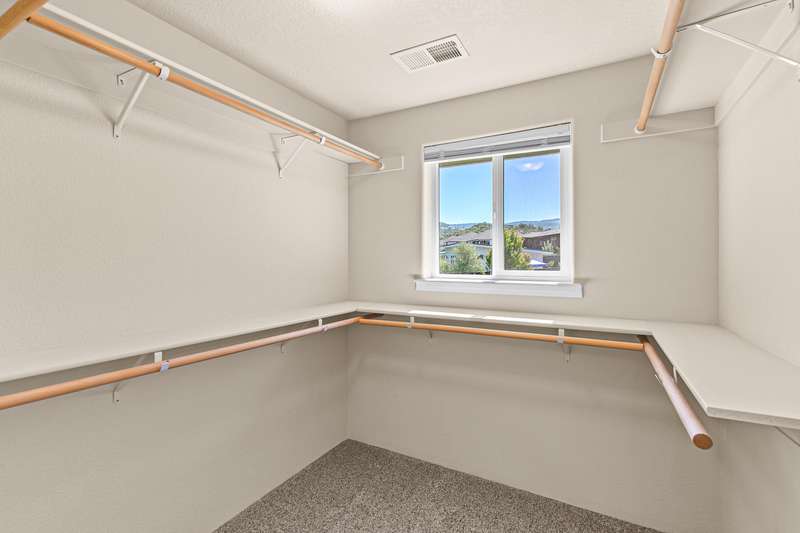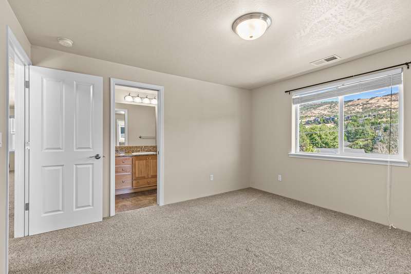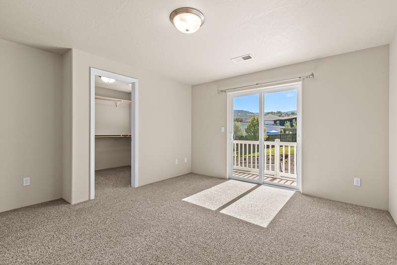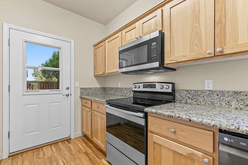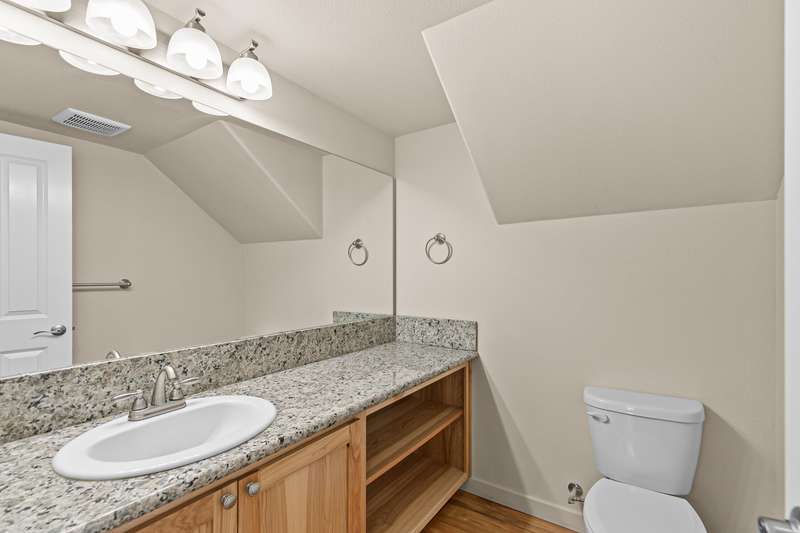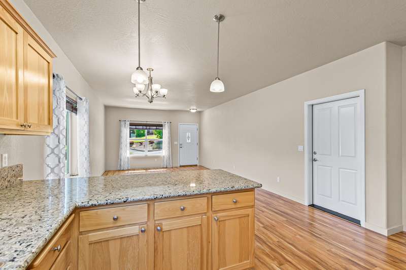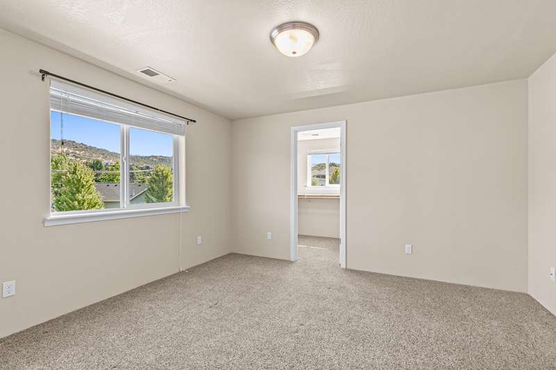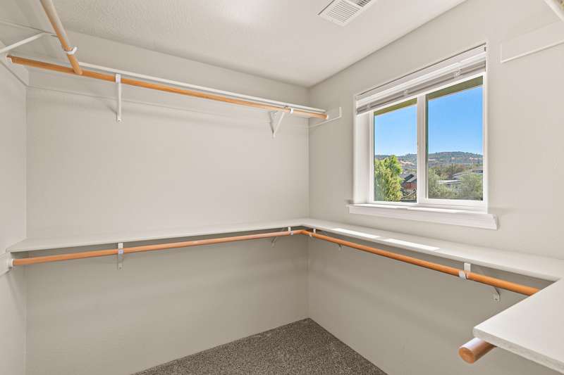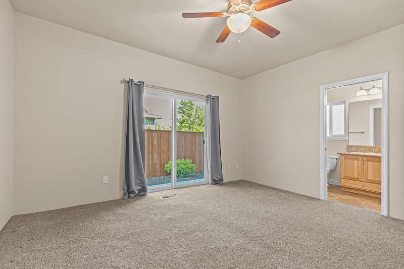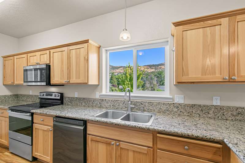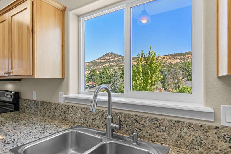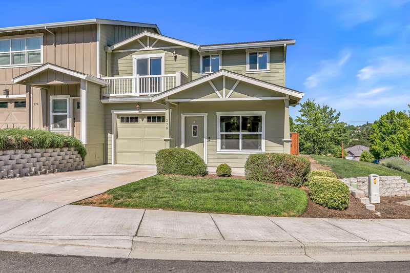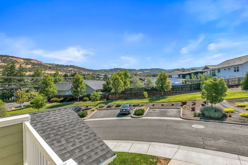 Spacious and move-in-ready end unit townhome located in the East Medford foothills within ten minutes of hiking, biking, equestrian trails, golf courses, and Asante Rogue Reg'l Medical Center. Seller-carried financing available! Main level primary suite with ceiling fan, sliding glass door to patio and fully-fenced private back yard, full ensuite bathroom with granite vanity, shower, huge storage area, and additional walk-in closet. Living, dining, powder room, pantry, and kitchen with vinyl plank floors. Granite dining counter, stainless appliances, and double sink with view of Roxy Ann Peak. Huge vaulted upper-level family room with ceiling fans, two bedrooms with walk-in closets, private view balcony, full bathroom with double granite vanity and tub shower, and laundry room with granite counter, utility sink, washer, and dryer. One car garage with built-in shelving. Association dues cover landscaping maintenance for front yards, side yards, and common areas. Inquire for details!