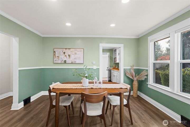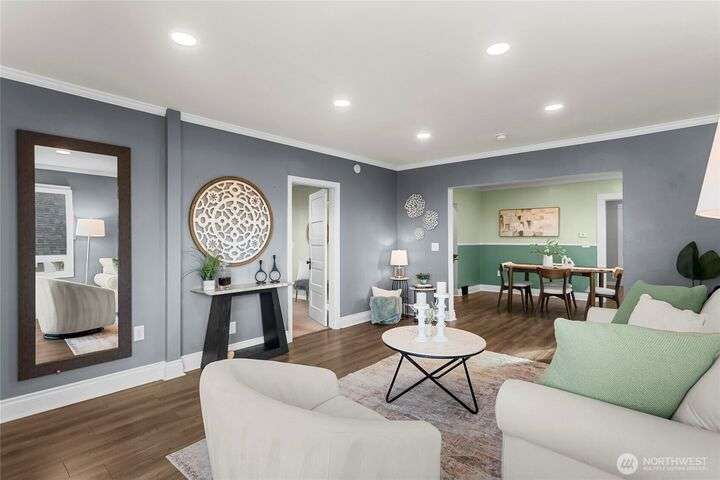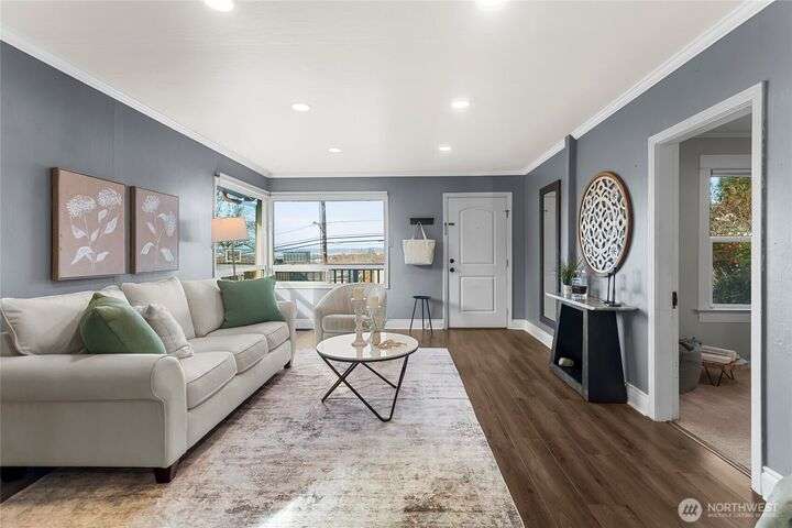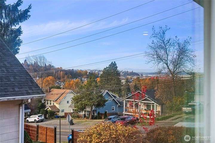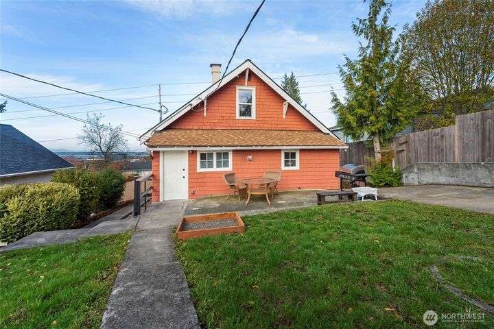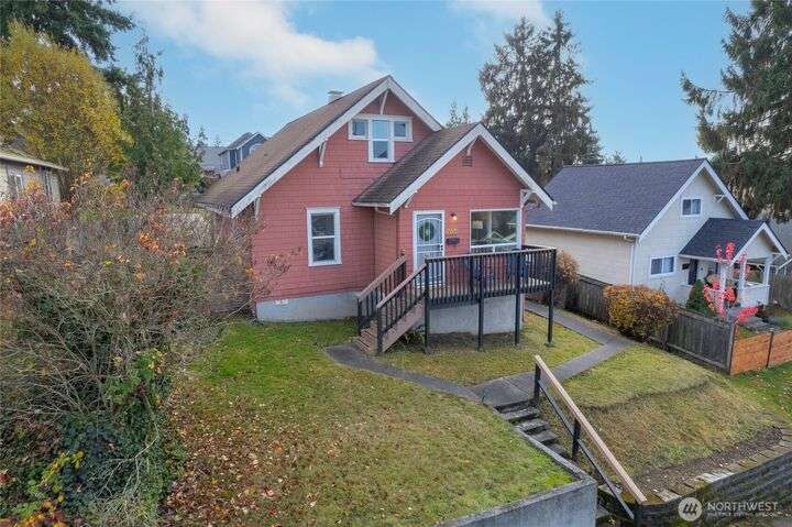 Classic Tacoma craftsman elevated above the street with sweeping views of sunsets, 4th of July fireworks, Downtown Tacoma, Vashon, & the Olympic Mountains. This spacious home offers seclusion in a quiet neighborhood. Enjoy morning coffee with a view on the front porch or the couch through big corner windows—new flooring throughout the living, dining, & kitchen areas. Updated appliances, fully rewired, new plumbing & an updated sewer line, it's got classic charm while being move-in ready. Outback, there's a fully fenced yard, patio space, and room to garden. A detached garage features a 100-amp subpanel. Parking for an RV/boat with a large concrete pad, garage, & space for friends/guests out front. Charming & updated with stellar views!