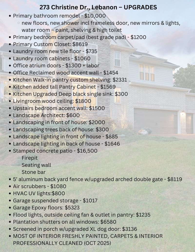 Beautiful 5-Bedroom Home Just Minutes from Historic Lebanon Square! Not only does this home have 5 spacious bedrooms but it also has a dedicated office AND a huge bonus room. The primary bedroom & 1 guest room is located on the main level. This beautifully upgraded home offers the perfect blend of comfort, style & convenience-just 7 minutes from the charming Lebanon Square, 30 min to the airport & 40 minutes to downtown Nashville. Ideal for commuters, it's also just minutes to the Music City Star train station. Step outside to your own private retreat: a large, fenced backyard featuring mature trees w/professional uplighting, a custom stamped concrete patio, built-in stone bar, firepit & a cozy sitting wall-perfect for entertaining year-round. The screened-in porch incl an upgraded XL dog door for your four-legged family members. Inside, the gourmet kitchen boasts a large island (7' 3) & not one, but 2 pantries-incl a custom-designed walk-in pantry. The primary suite features a recently renovated spa-like bathroom w/new flooring, a fully tiled shower w/frameless glass slider door, updated lighting, mirrors & fresh paint. You'll also love the custom-designed walk-in closet tailored for both function and style. Additional features incl: 3-car garage w/epoxy floors & suspended storage racks. Plantation shutters throughout. Indoor dog kennel (can be easily converted back to storage room). Professional landscaping designed by a landscape architect. Most of home interior has recently been repainted, carpets professionally cleaned & home has been professionally cleaned. It's MOVE IN READY! This well-maintained home has been thoughtfully updated with too many upgrades to list-come see it in person to truly appreciate everything it has to offer! (Stovetop can easily convert to a gas stovetop) LISTED BELOW RECENT APPRAISAL! (Sq ftg professionally measured). Currently under contract w/a Home to Sell contingency. Seller has a 48hr kickout clause implemented in that contract.
