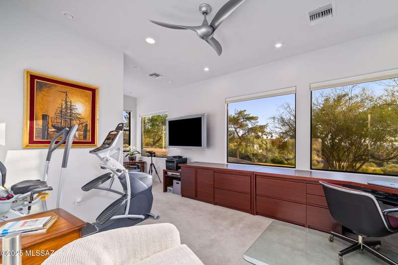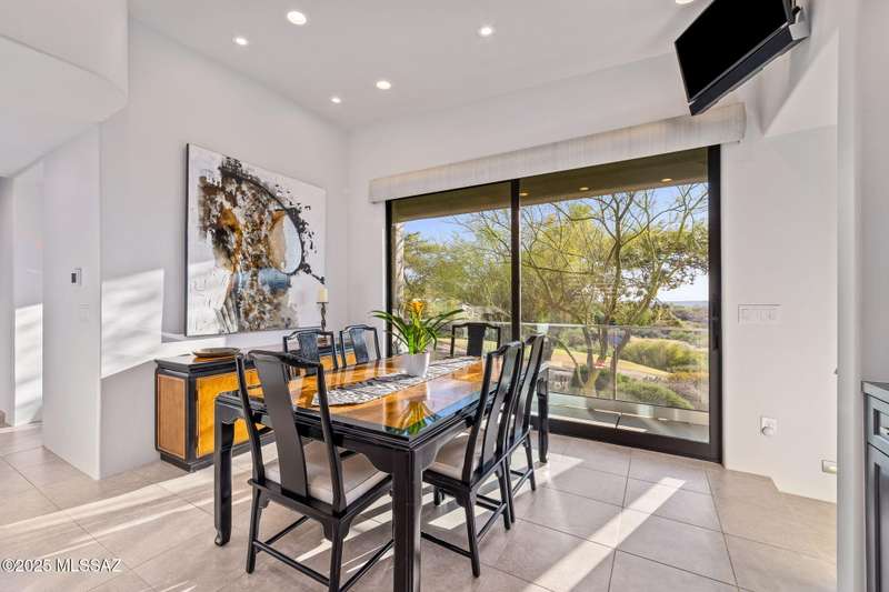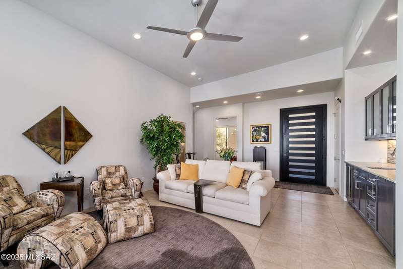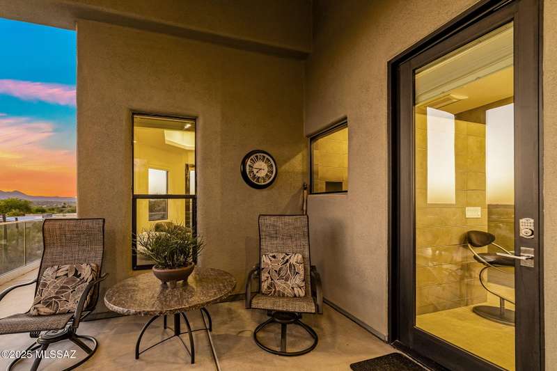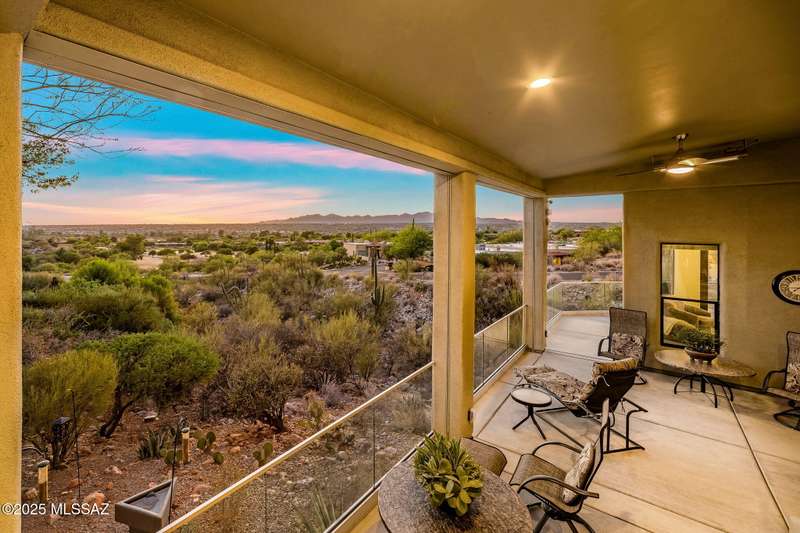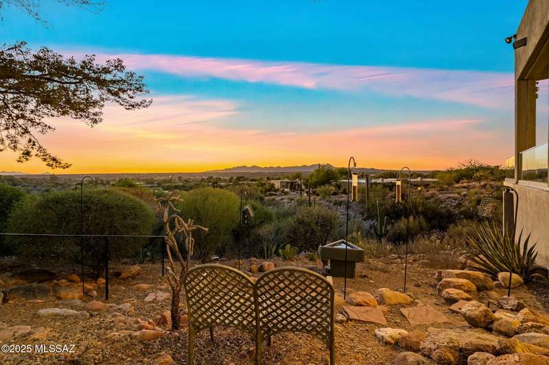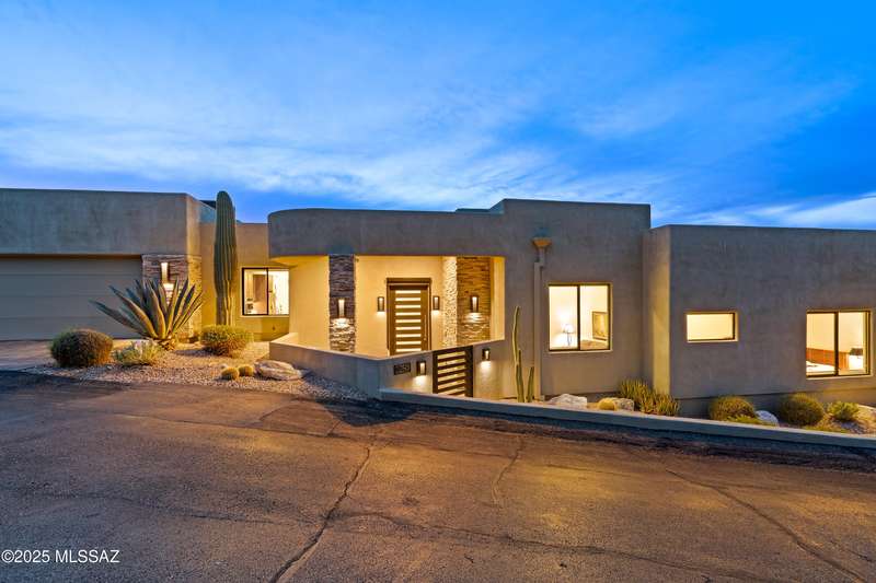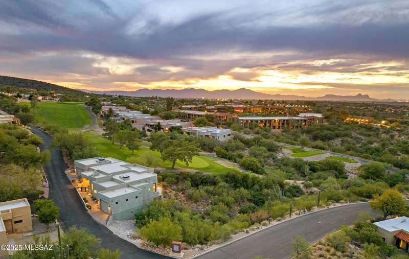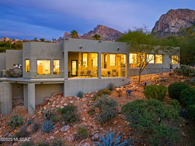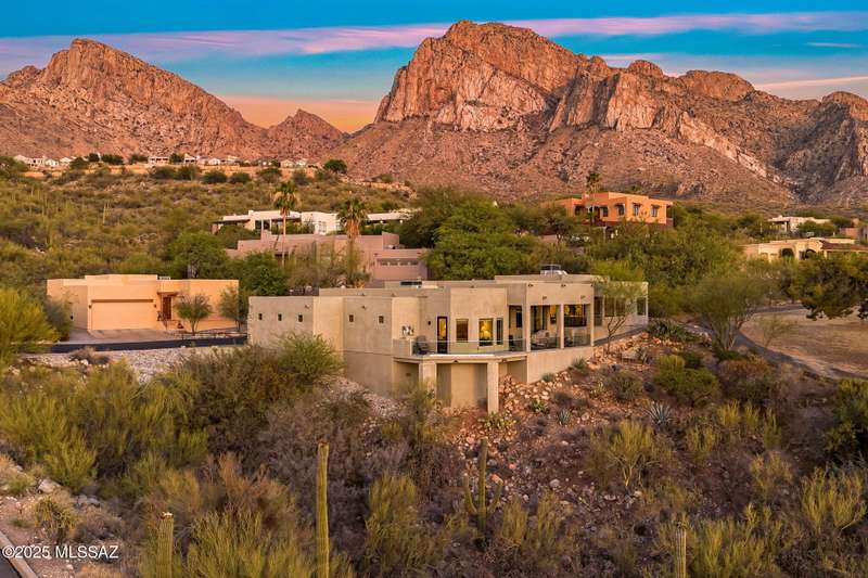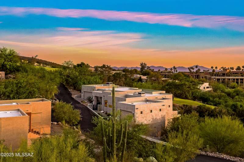 Gaze west from this 2018 rebuilt home perched along 7th & 8th fairways of Pusch Ridge Golf Course where sunsets unfold daily across a protected five-acre multi-saguaro wash. Enjoy a variety of birds & postcard view from private deck w/no extra yard to maintain. With no HOA & no homes pressed up on either side, this home has an uncommon sense of breathing room. Sleek, modern, thoughtful upgrades & broad patio spaces that feel like estate living w/o the upkeep. Relax in effortless resort-style living w/direct 5 minute golf-cart path access to the El Conquistador Resort pool, cafe, restaurants & bar. Grab morning coffee or wander back for dinner or cocktail in the evening. Step inside to light-filled open spaces w/soaring ceilings, sophisticated finishes & versatile plan that shifts easily..