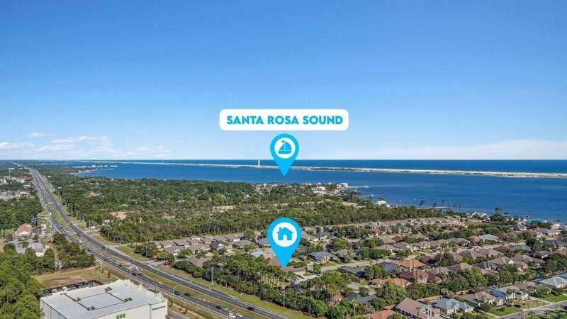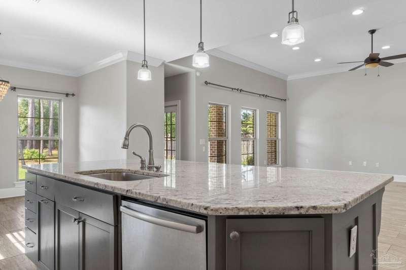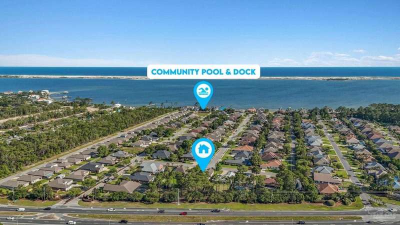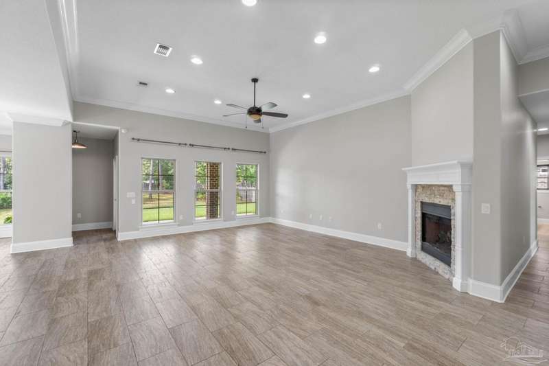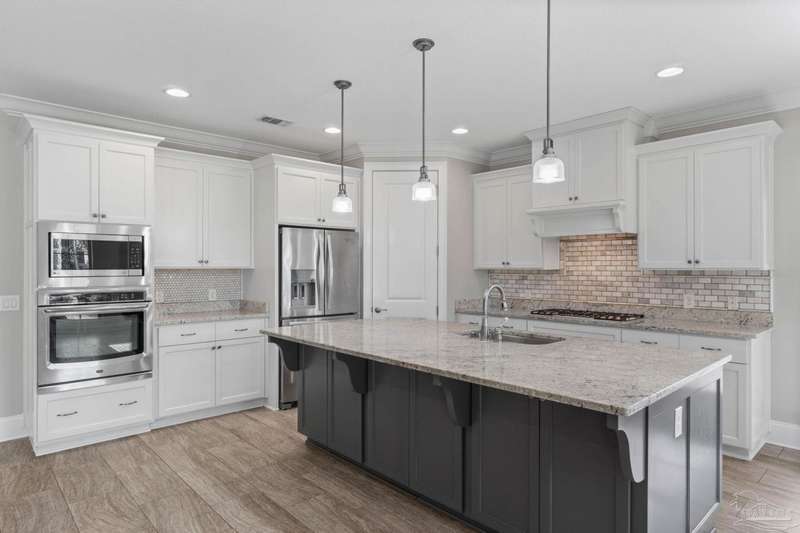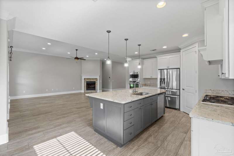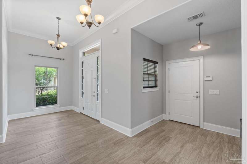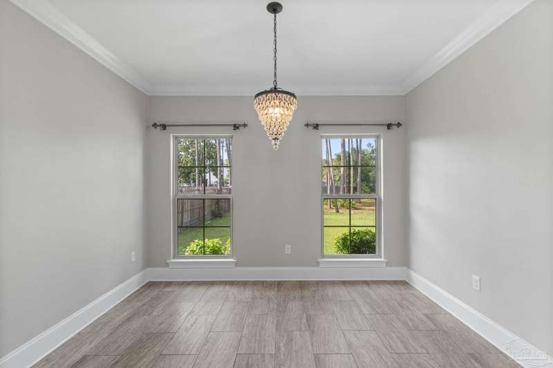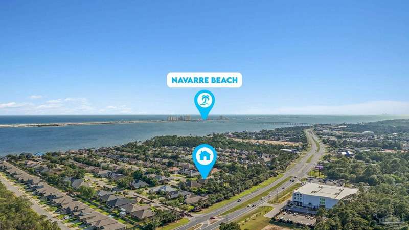 Welcome home to Florida living at its finest! This stunning 5-bedroom, 3-bathroom custom home is nestled in the sought-after gated waterfront community of Heritage Park along the Santa Rosa Sound. Residents enjoy cobblestone streets, ornate mailboxes, underground utilities, and a waterfront clubhouse with panoramic views of Santa Rosa Island. Amenities include a saltwater pool, fitness center, conference room, lounge, kitchen, large green space, deeded beach access, and a scenic pier-perfect for sunsets and Gulf breezes. This 2,870 sq ft home sits minutes from the clubhouse and water. The landscaped front yard and fenced backyard with covered porch create an inviting outdoor retreat. A courtyard entry and spacious porch lead inside, where the foyer flows to a mudroom and versatile 5th bedroom/office. The great room impresses with soaring ceilings, crown molding, a focal point fireplace, while the French door opens to the backyard. A built-in nook adds charm and function. The gourmet kitchen features tall cabinetry, granite counters, stainless steel appliances, wall oven, gas cooktop, and center island with breakfast bar. The adjoining dining nook overlooks the garden. The master suite is a true retreat with trey ceilings, large windows, and a spa-like ensuite with soaking tub, seamless glass shower, extended double vanity, and large walk-in closet. Three additional guest rooms offer ample space and storage. Two share a full bath with double vanity, while the third enjoys a private bath with step-in shower. A utility room with sink and storage completes the interior. High ceilings, recessed lighting, and elegant finishes highlight the craftsmanship throughout. Located on Navarre's east side, Heritage Park offers easy access to shopping, dining, the beach bridge, and Hurlburt Field AFB. Experience the perfect blend of luxury, comfort, and coastal living-schedule your private tour today!
