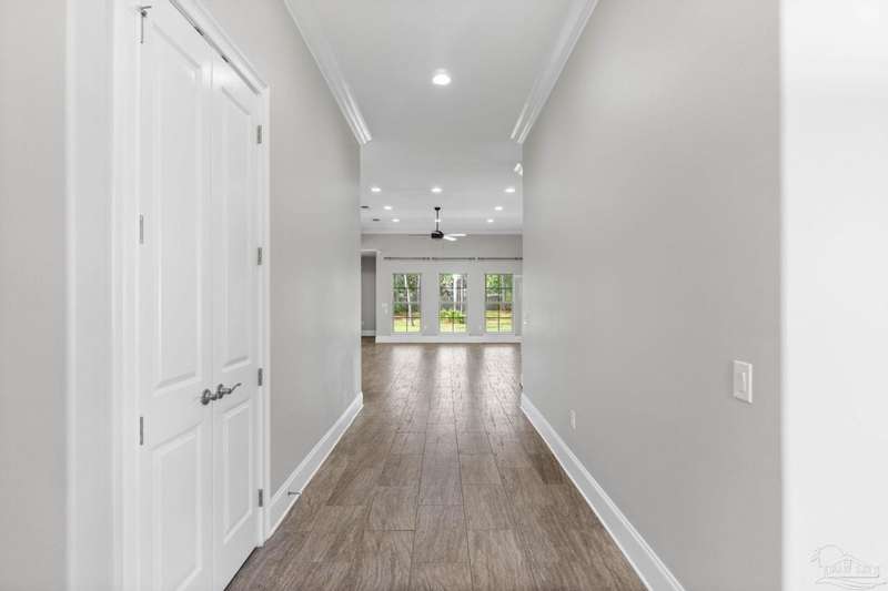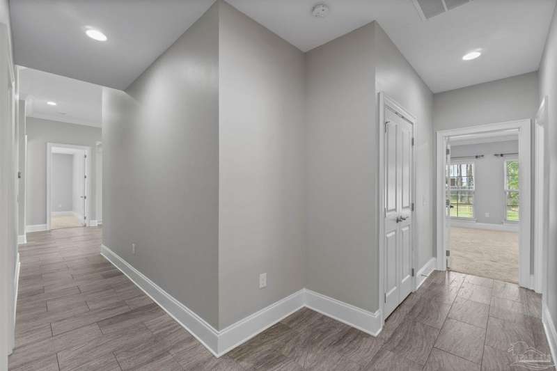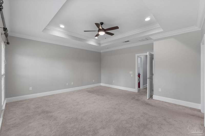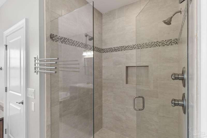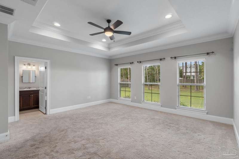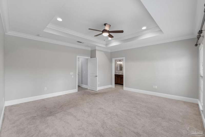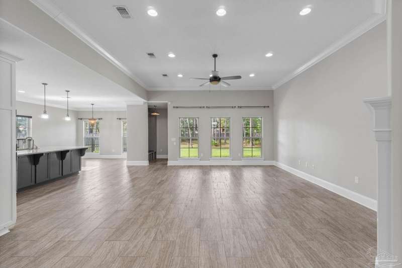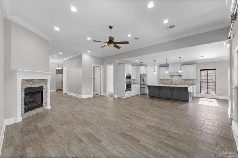 Welcome home to Florida living at its finest! This stunning 5-bedroom, 3-bathroom custom home is nestled in the sought-after gated waterfront community of Heritage Park along the Santa Rosa Sound. Residents enjoy cobblestone streets, ornate mailboxes, underground utilities, and a waterfront clubhouse with panoramic views of Santa Rosa Island. Amenities include a saltwater pool, fitness center, conference room, lounge, kitchen, large green space, deeded beach access, and a scenic pier-perfect for sunsets and Gulf breezes. This 2,870 sq ft home sits minutes from the clubhouse and water. The landscaped front yard and fenced backyard with covered porch create an inviting outdoor retreat. A courtyard entry and spacious porch lead inside, where the foyer flows to a mudroom and versatile 5th bedroom/office. The great room impresses with soaring ceilings, crown molding, a focal point fireplace, while the French door opens to the backyard. A built-in nook adds charm and function. The gourmet kitchen features tall cabinetry, granite counters, stainless steel appliances, wall oven, gas cooktop, and center island with breakfast bar. The adjoining dining nook overlooks the garden. The master suite is a true retreat with trey ceilings, large windows, and a spa-like ensuite with soaking tub, seamless glass shower, extended double vanity, and large walk-in closet. Three additional guest rooms offer ample space and storage. Two share a full bath with double vanity, while the third enjoys a private bath with step-in shower. A utility room with sink and storage completes the interior. High ceilings, recessed lighting, and elegant finishes highlight the craftsmanship throughout. Located on Navarre's east side, Heritage Park offers easy access to shopping, dining, the beach bridge, and Hurlburt Field AFB. Experience the perfect blend of luxury, comfort, and coastal living-schedule your private tour today!
