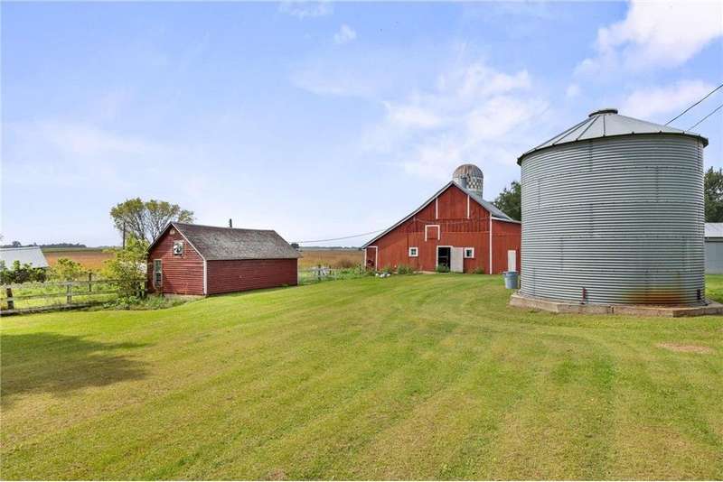 Farm style home with lakeshore on Round Lake. This one of a kind property offers 530 feet of lakeshore on Round Lake, located just across the county road. The home features 3 bedrooms, 2 bathrooms, an updated kitchen and living room, and fresh paint throughout the upper level. Main floor laundry adds everyday convenience. Outside, you'll find a large garage, additional outbuildings and grove on two sides of the property. Whether you're looking for a country lifestyle or a peaceful retreat, this property delivers. Enjoy evenings on the lake: put in a dock, take a sunset boat ride or cast a line for panfish right from your own shore. A truly rare opportunity to combine country living with lakefront enjoyment!