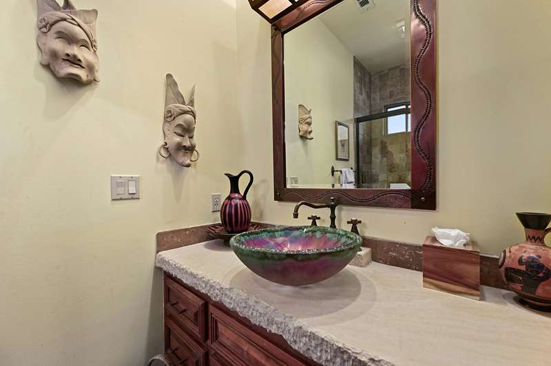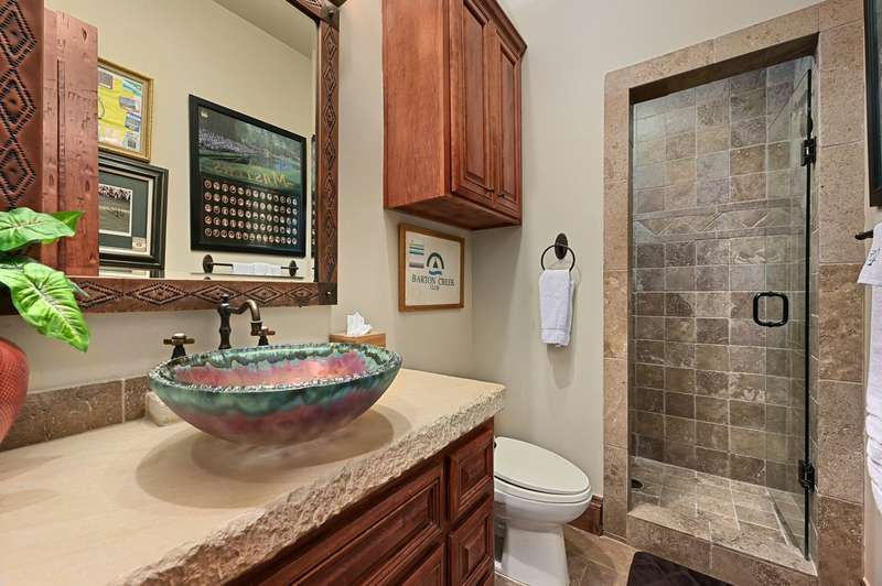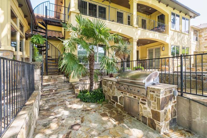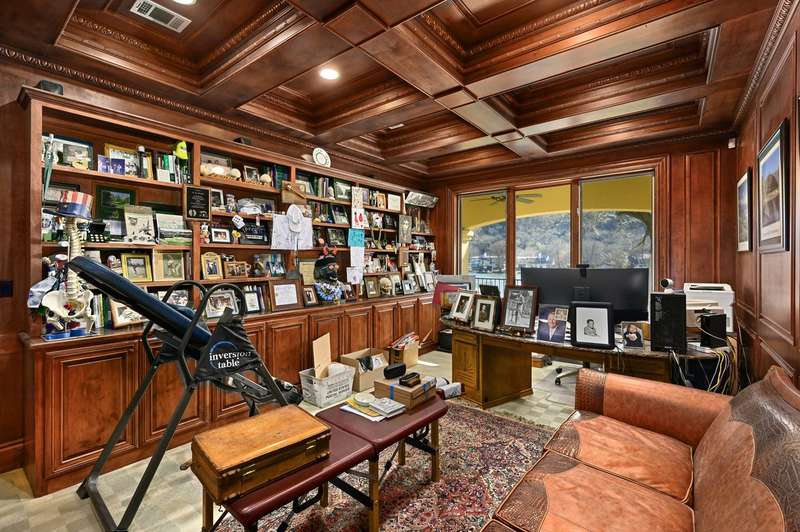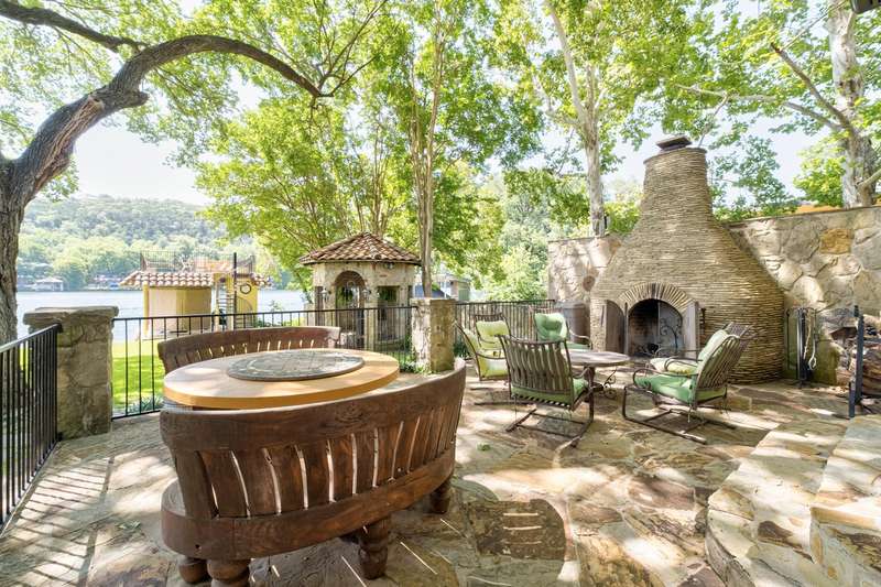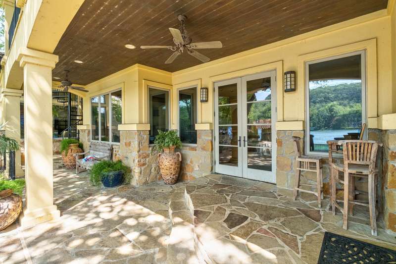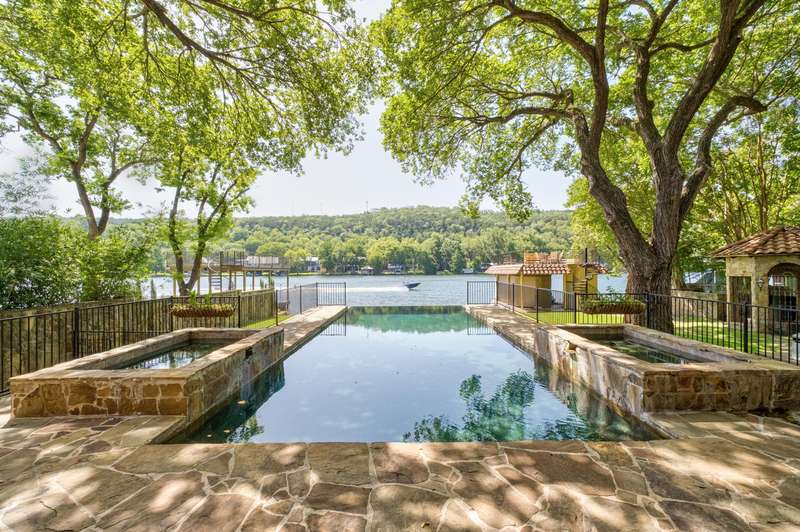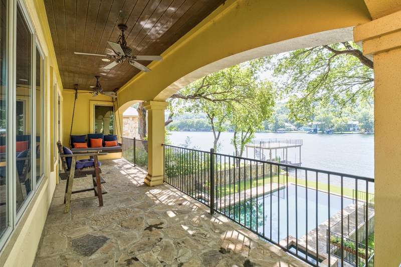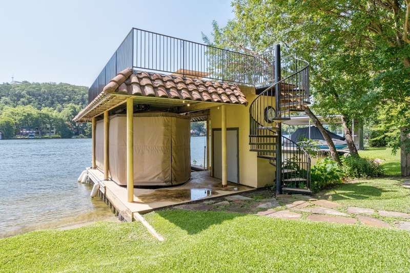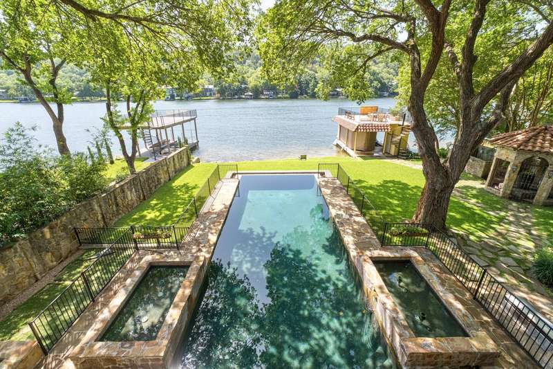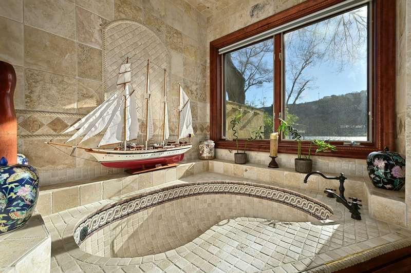 The outdoor living spaces are nothing short of spectacular. A large zero-edge pool, hot tub, and multiple decks provide serene spots to unwind, all with breathtaking views of Lake Austin. A private boat dock with an upper party deck ensures effortless lake access for boating and entertaining, while a large outdoor fireplace, grill, and fenced-in backyard are perfect for hosting gatherings. The home features a custom aviary, water feature, and an impressive outdoor setting designed for year-round enjoyment. With a unique copper-walled bathroom, a saltwater reef tank, and custom tilework throughout, every detail has been thoughtfully curated for luxury and comfort.