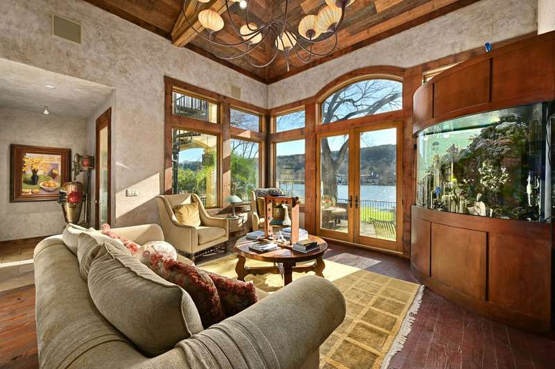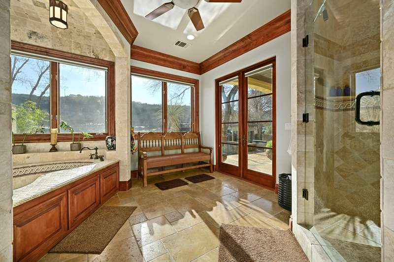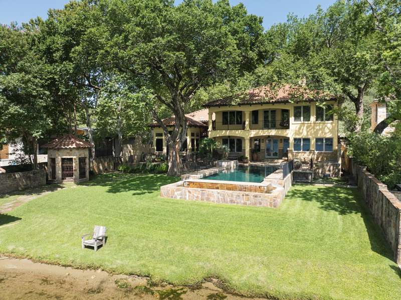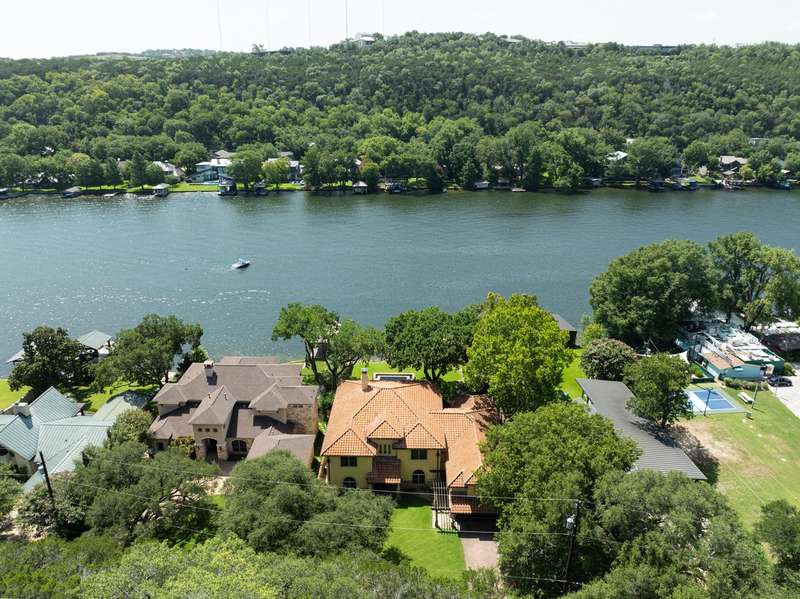 3111 Ski Shores Terrace offers a rare opportunity to own a Mediterranean-style retreat on one of Lake Austin’s most coveted stretches. Privately gated with a security wall, this .4-acre property ensures unparalleled privacy and serenity. With five bedrooms, four full bathrooms, and two powder rooms, the home boasts top-quality materials including travertine floors, granite countertops, and antique plaster walls—creating a timeless blend of luxury and warmth. Unique design features include a thoughtfully curated buildout with custom doors and wood trim imported from Central America, copper fixtures throughout, and a stunning sunroom with antique barn wood beams and a custom lamp from the Middle East. The property’s four-car garage, cedar closet, and full gym add to its functional elegance, while a large recreation or studio room offers versatility.