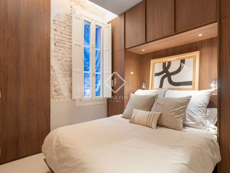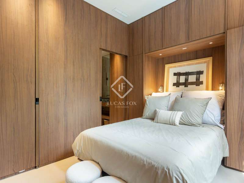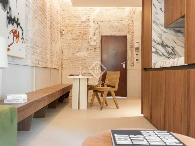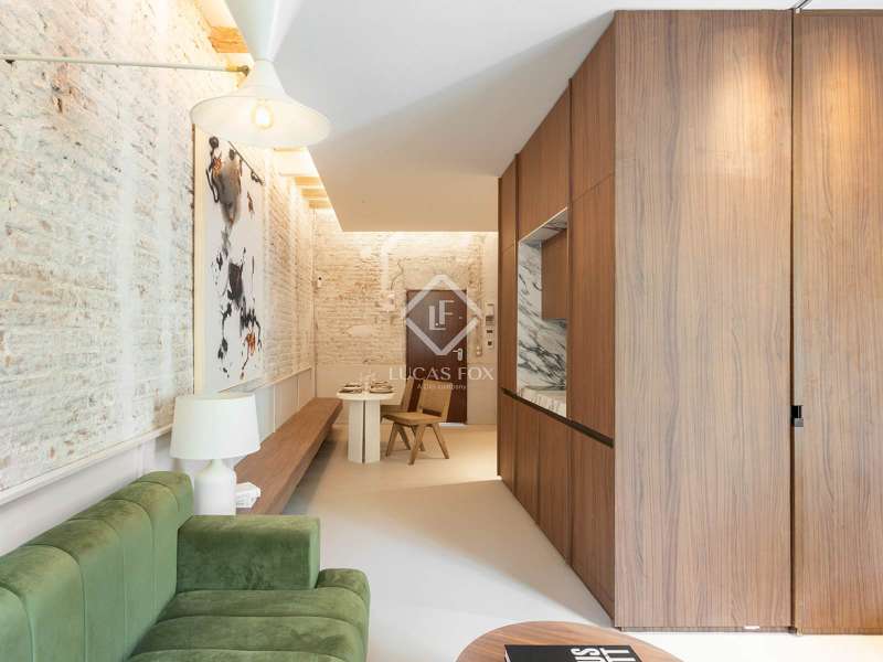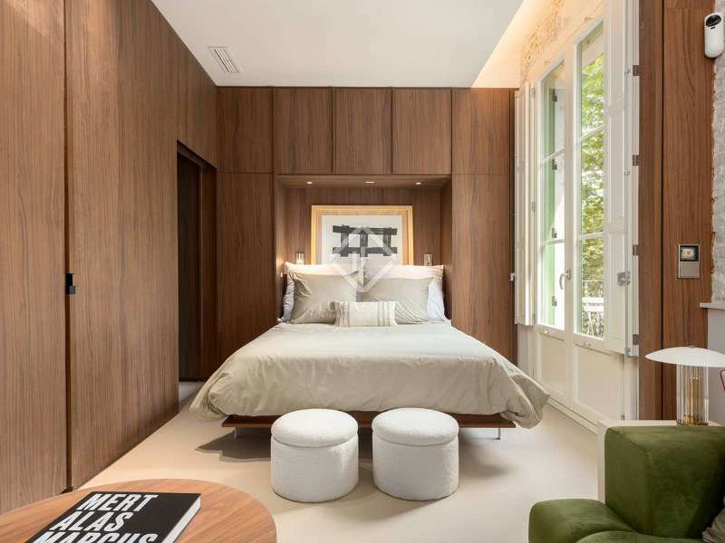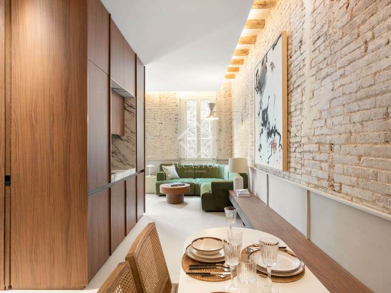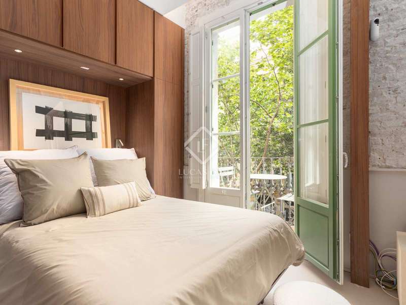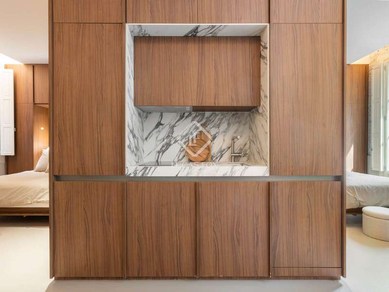 This development is located in the charming Sant Antoni neighbourhood of Barcelona's Eixample district. The classic style building dates back to 1900 and has been completely renovated, offering a lift and attractive communal areas. The communal areas of the building include a gym, parking spaces for bicycles, a wine cellar, a laundry room and a communal terrace with outdoor showers, a lounge and a social bar. The building consists of a basement level, a mezzanine and main floor level, 5 upper floors and a rooftop. Offering twelve apartments and two duplex loft properties, this development provides homes that are fully furnished, equipped and ready to move into. The kitchens come with fitted electrical appliances (dishwasher, oven, microwave oven, coffee maker and refrigerator), Zucchetti taps and porcelain countertop. This 2-bedroom property is on the first floor (real height - third floor) and is the result of a clever design concept by which a single space may be transformed with a system of sliding panels. The beds can be concealed in closets during the day, and the kitchen and bathroom are at the centre of the home. Feel free to contact us for further information.