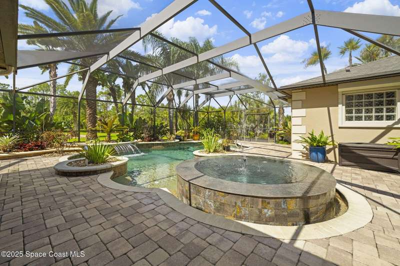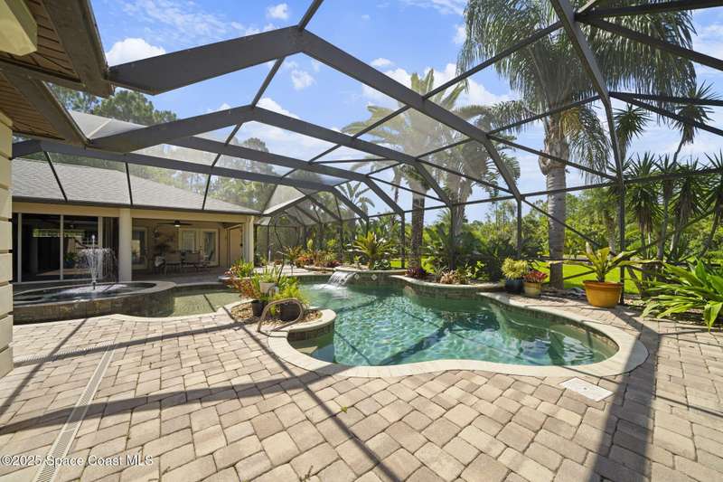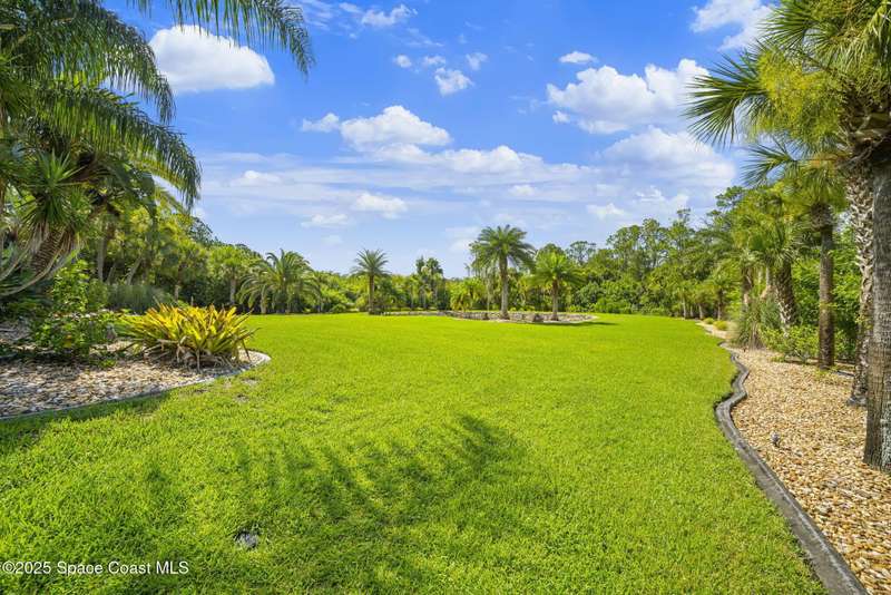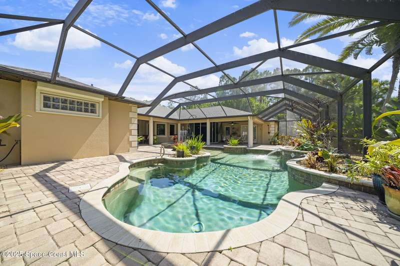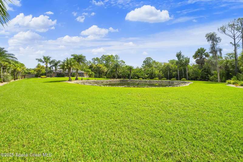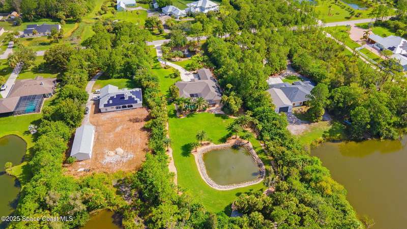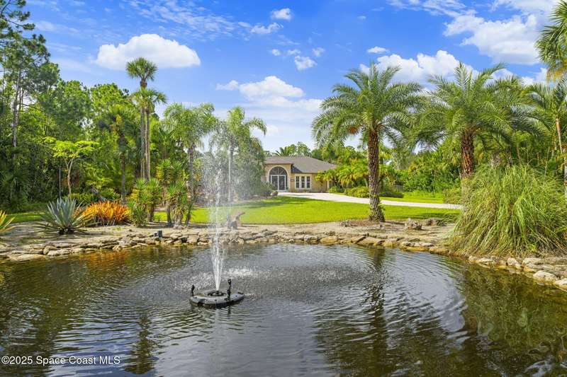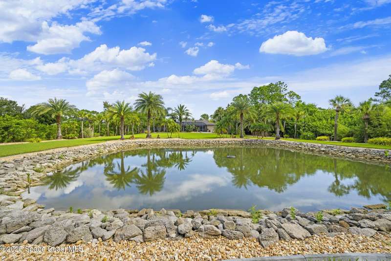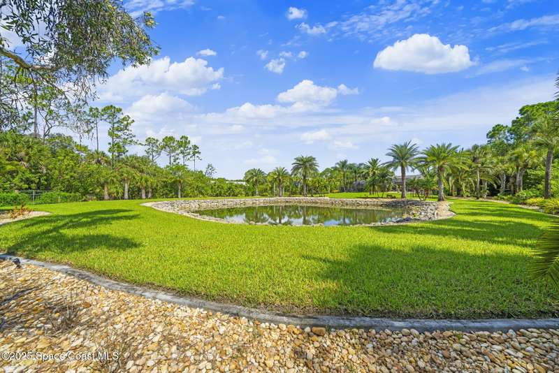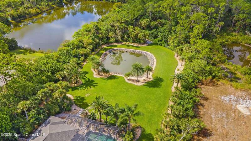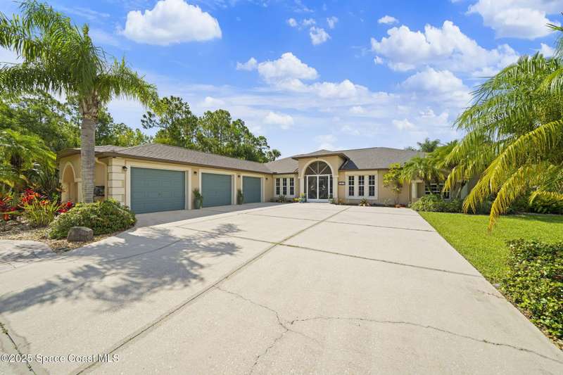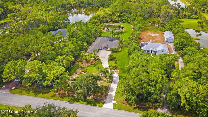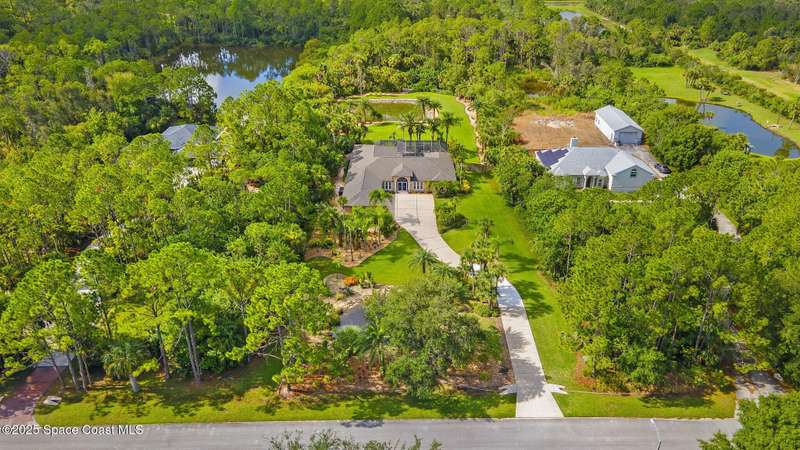 Welcome to this one-of-a-kind 4.17-acre private estate in the prestigious Timbers West community of Rockledge. This meticulously maintained property perfectly blends luxury, land, and location. From the moment you pull into the scenic drive, vibrant tropical landscaping and a grand first impression set the tone for charm and exclusivity. Inside, you'll find 5 bedrooms and 4 full baths, allowing 4 of the bedrooms their own bathrooms and the 5th room ideal for an office, play room or nursery. This 2005 custom-built home boasts a 3-car garage, a new roof, whole-house generator, electric hurricane shutters, and a walk-in closet built as a concrete safe room for ultimate peace of mind. The spacious kitchen with a large island overlooks the screened pool and spa through wide sliders, creating an ideal indoor-outdoor living flow. The screened pool and spa, complete with a gas heater, in-ground cleaning system, and both saltwater and chlorine options is designed for year-round enjoyment. The grounds are equally impressive, with two serene ponds, an artisan well, and lush manicured landscaping. There's ample space for gardening, RV/boat storage, and all your outdoor toys. The back half of the property remains in its natural state, offering unmatched privacy and featuring a 12x16 shed with electric. This rare property combines seclusion, convenience, and timeless charm, all just minutes from Viera, I-95, shopping, restaurants and the beaches.