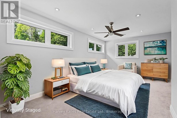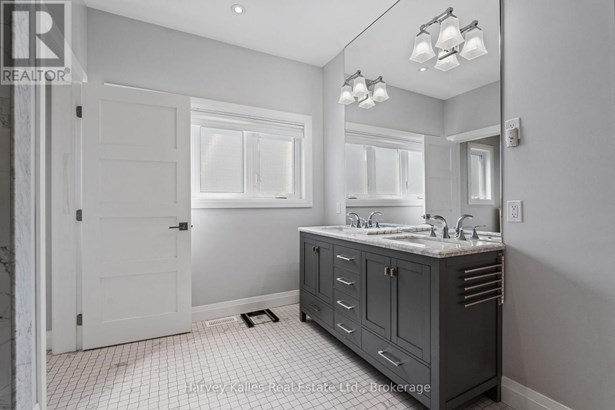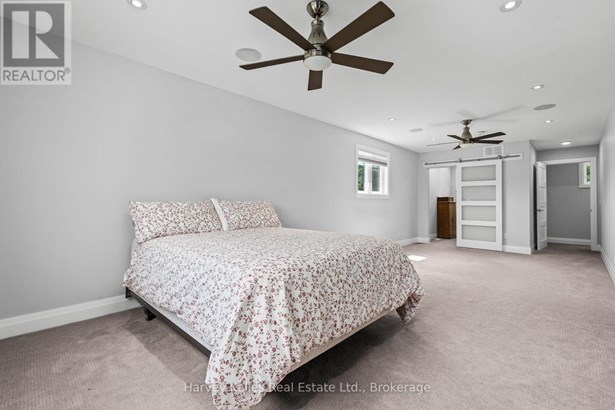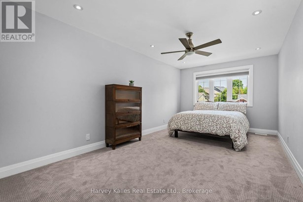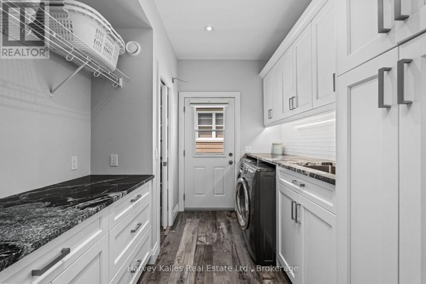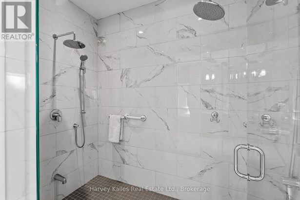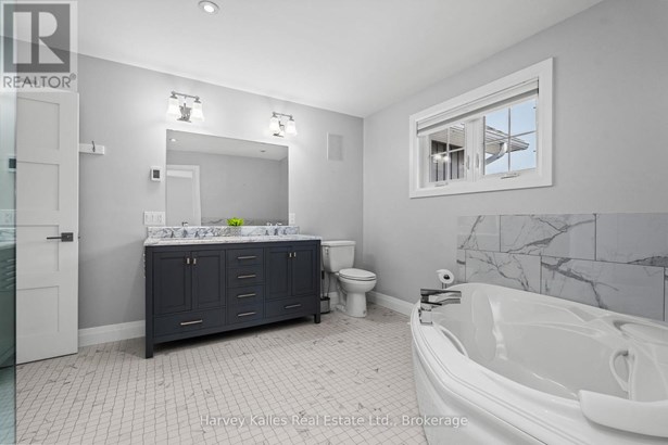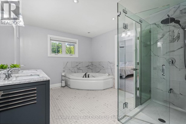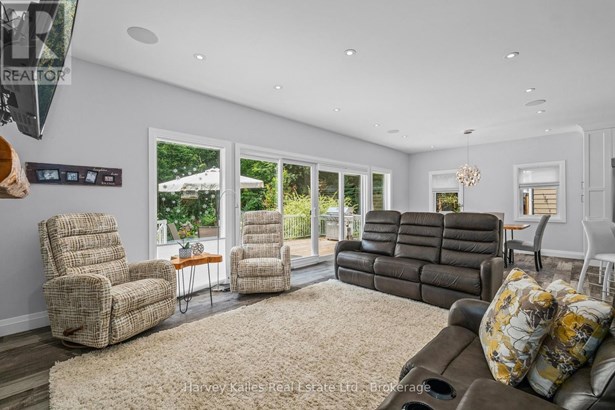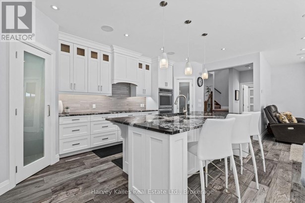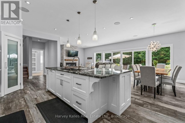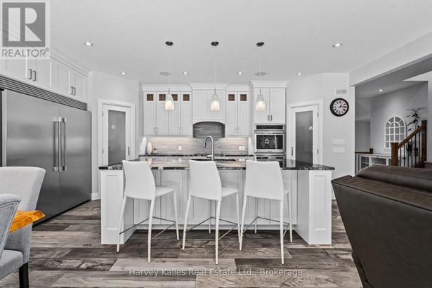 This impressive 5+ bed, 4-bath custom residence is ideally suited for large, growing or multigenerational families seeking space, comfort, and a vibrant community. Located in a newer yet well-established neighbourhood, this 5000+sf home offers bright, open-concept main floor living with a walk out to an expansive deck (approx 48'x12') and landscaped yard backing onto green space. Designed for family gatherings and meal preparation, the chef inspired kitchen features a large, 9' island, granite countertops, built-in appliances and 2 generous pantries; an appliance pantry with outlets for all of your kitchen items plus storage pantry. The living and dining areas offer inviting spaces to relax, with a cozy gas fireplace in the living room. On the main level, the primary bedroom includes a spacious walk-in closet, a luxurious ensuite with a water closet and double shower, plus direct access to a large rear deck complete with a hot tub. Also on the main floor is an additional bedroom/office, laundry room, and access to the attached double garage. Upstairs, enjoy a sitting room, 3+ generously sized bedrooms each with large closets, and one offering ensuite access. The lower level is an entertainers dream, featuring 9' ceilings, theatre room, a large recreation area with a pool table and shuffleboard, an office or music room, and a dedicated gym with durable rubber flooring. A 3-piece bathroom and abundant storage complete this versatile space. Outside, the well-maintained grounds complement the family-friendly neighbourhood, which offers sidewalks, streetlights, a park, and the added advantage of being on a quiet, no-through street with reduced traffic. The home is just minutes from a school, the hospital, and a short drive to downtown Huntsville. Enjoy the convenience of natural gas and municipal water and sewer services. This custom built home was designed to meet the demands of an active family lifestyle, providing a perfect space for everyone to grow and thrive. (id:16999)