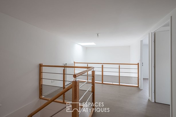 The wooden staircase leads to the upper floor, where a mezzanine that can be arranged as needed overlooks the living room.