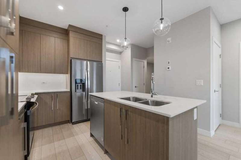 Welcome to Cavallo — a remarkable new development by Truman Homes, nestled in one of Calgary’s newest and most vibrant communities: Cityscape. This brand-new 2-bedroom, 2-bathroom condo showcases a modern open-concept layout, thoughtfully designed with high-end finishes throughout. Step inside to find luxury vinyl plank flooring, oversized windows, and a sliding glass door. The contemporary kitchen boasts soft-close cabinetry, generous storage space, and a full suite of brand-new stainless steel appliances. The spacious primary bedroom is filled with natural light from large windows and includes a walkthrough closet that leads directly into a well-appointed 3-piece bathroom. The versatile second bedroom makes a perfect guest room or a home office plus another 4 piece full bathroom. Cavallo is a pet-friendly building with a range of modern amenities, including a pet spa, fitness Centre, entertainment lounge, visitor parking, and EV charging stations. With retail shops, parks, and daily conveniences just minutes away, this home offers the perfect balance of style, comfort, functionality and the benefit of your own titled underground parking stall. Don’t miss your chance to be the first to call this exceptional unit home!