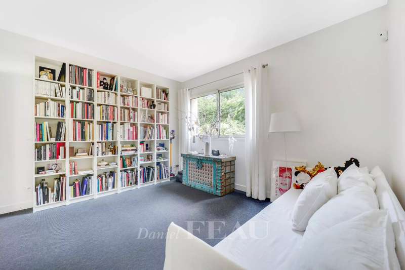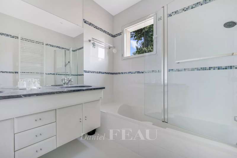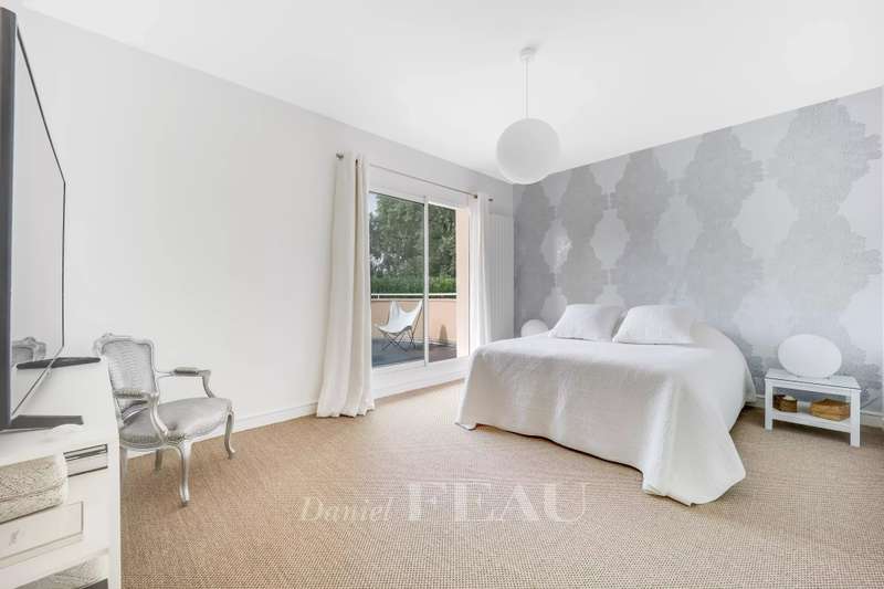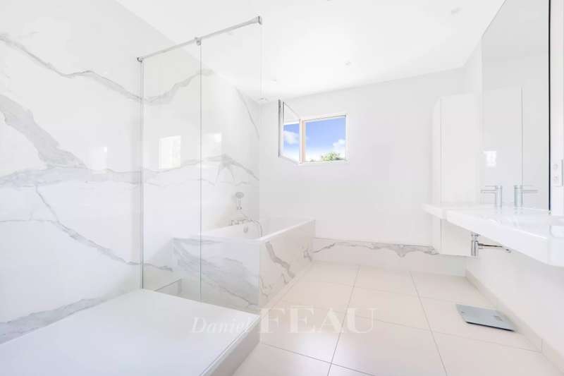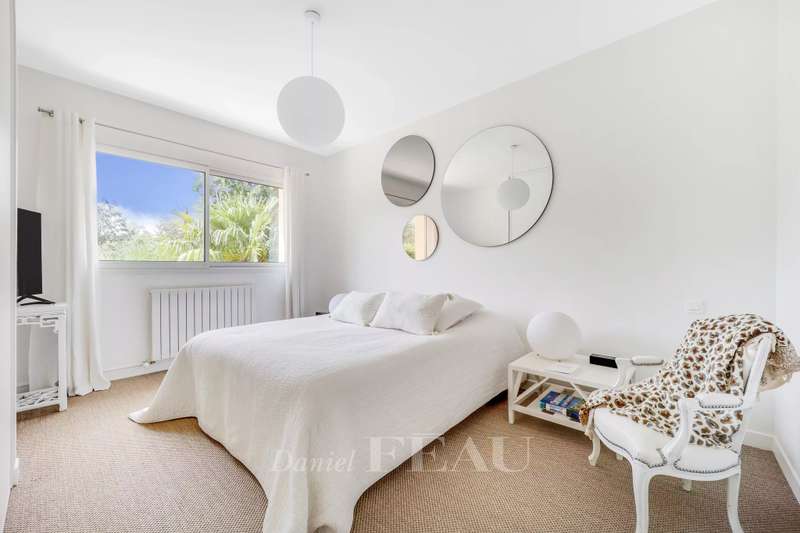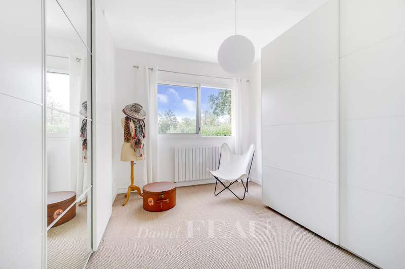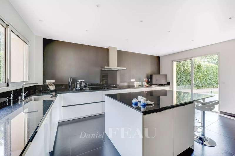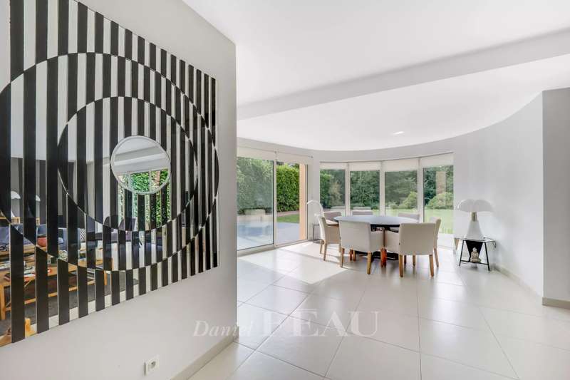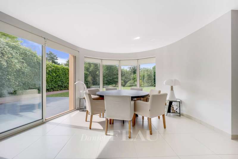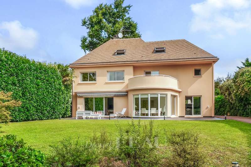 La Feuillaume neighbourhood. This bright property offering 465 sqm of floor space and 265 sqm of living space is hidden from view in a 1000 sqm plot on the edge of the forest. It includes a 60 sqm living/reception room, a spacious kitchen opening onto a terrace and the south-facing garden, and a bedroom with a shower room and a wc. Upstairs a landing leads to a master suite comprising a bedroom opening onto a terrace, a bathroom, a wc and ample fitted storage space, two further bedrooms, a dressing room or possible space bedroom, a bathroom and a wc. A 49 sqm attic fitted as a study could create one or two further bedrooms with a bathroom and wc. On a fitted heated basement with a utility room, a study, a wine cellar, and a 60 sqm room which could create a home cinema or fitness room. The property was renovated after its last sale, and is regularly maintained. It was refaced in June 2024. In a peaceful residential neighbourhood a five-minute walk from the station, the shops and the schools, and near golf courses, equestrian facilities, swimming pools and tennis courts.