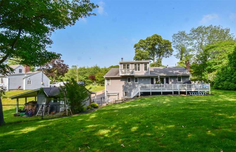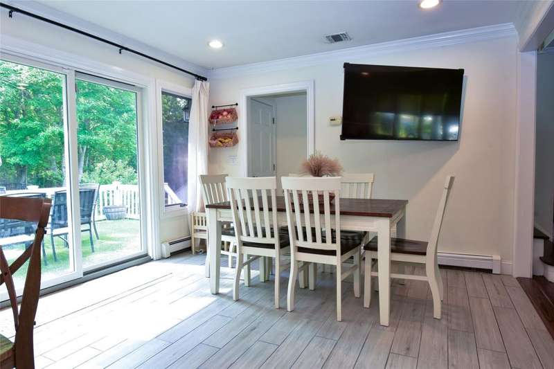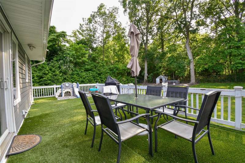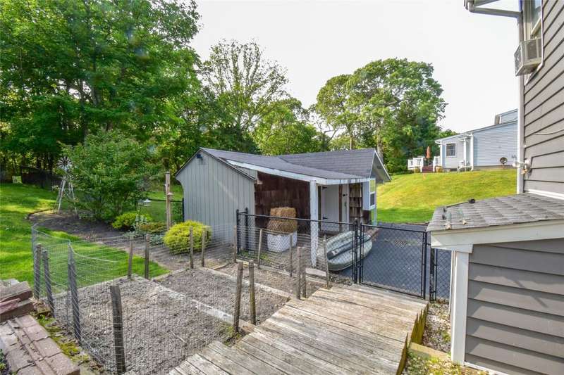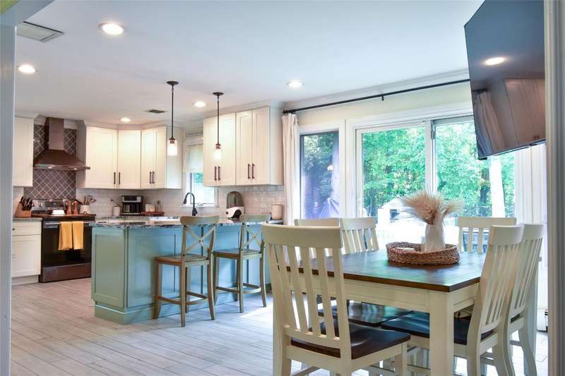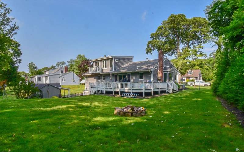 Welcome to this beautifully maintained and thoughtfully updated Cape-style home located in the sought-after Shore Ridge Hills community of Shoreham. Just a short stroll from a private residents-only beach, this property offers the perfect blend of classic charm and modern comfort. Step inside to find gleaming hardwood floors throughout and a stunning, all-new eat-in kitchen featuring granite countertops, custom cabinetry, and recessed lighting-ideal for everyday living and entertaining. The inviting living room is warmed by a cozy wood-burning stove, while a separate den with a wood-burning fireplace provides an additional space for relaxation or gatherings. This spacious home boasts 3 bedrooms, including a generous primary suite complete with a walk-in closet and an updated en-suite full bath. Additional updated full baths ensure comfort and convenience for all. A former garage has been smartly converted into a gym area, offering flexibility for fitness or hobby space. Outside, enjoy the expansive decking that overlooks a fully fenced, beautifully landscaped yard-perfect for outdoor entertaining and peaceful evenings.Additional updates include:Central air conditioning 4years, 4-year-old roof, Detached oversized shed for extra storage, Legal accessory efficiency apartment-ideal for guests, extended family, or rental income. Private Beach dues of just $350/year