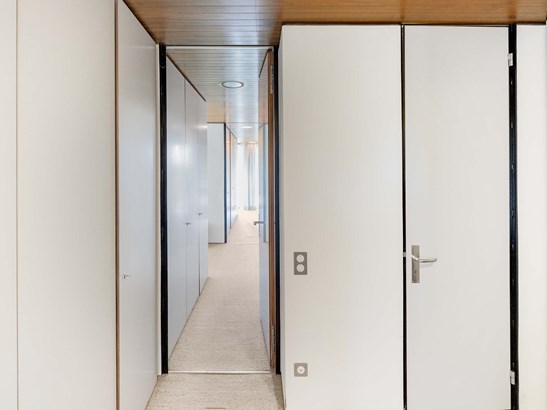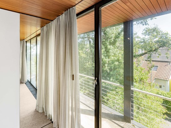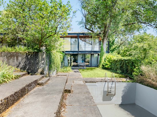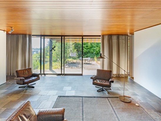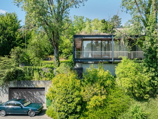 Living in the Villa "FRAME" means experiencing stylish architecture. The villa features a solid concrete base supporting a pavilion like upper floor constructed in steel and glass, creating a modern icon that blends seamlessly into the sunny hillside at the edge of Riehen. Surrounded by nature and parks, this 10-room residence is a protected historic property and a true modern classic. The villa connects indoor and outdoor spaces through generous glazing, is stylistically inspired by the International Style and Mies van der Rohe, and has been largely preserved in its original condition. It is situated in an idyllic garden with a pool, on the edge of the Southern Black Forest, near the Fondation Beyeler and Basel.