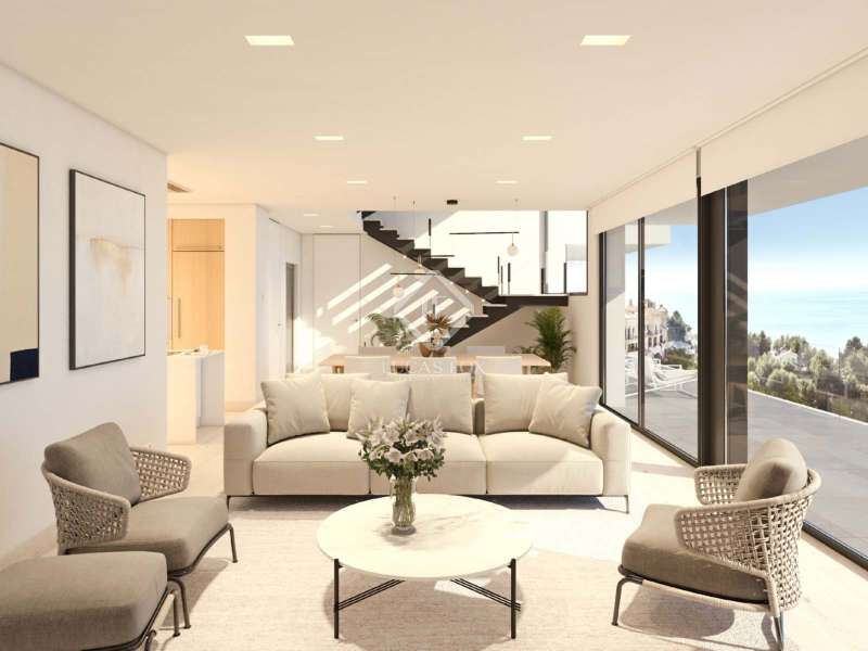 Villa Aura is located in one of the most desirable areas of Altea, combining cutting-edge technology, comfortable interiors, energy efficiency and materials that enhance light and space. The property, with 360° views of the sea and the Benidorm skyline, is located in a privileged area of Altea la Vella in Azure Altea Homes, one of the most emblematic enclaves of the Costa Blanca North. The architecture, with its modern and functional lines, is designed to allow the spaces to breathe and open up to the large terrace and swimming pool. Light, air, sea and vegetation make it clear that the style adapts to the landscape and integrates with it. It is built on three levels, access is via the highest level, which houses the garage and the hall of the house, equipped with a lift, so that movement between levels is comfortable. The middle floor houses three bedrooms, all with en-suite bathrooms and access to a terrace to enjoy the sea from every room of the house. On the main floor is the fourth bedroom of this villa, also with direct access to the terrace and the entire day area, a large open plan living room connected to the kitchen, the terrace and the swimming pool. Villa Aura is much more than a magnificent property next to the Mediterranean, it is an efficient villa equipped with heating, air conditioning and hot water system by Aerotermia, installation of photovoltaic panels, electric car charging point and home automation system to be always connected to your home. The outdoor spaces, built on different levels, allow stone and native plants to play their decorative role, while integrating perfectly with the surroundings. Pure architecture in a unique setting awaits you at Azure Altea Homes