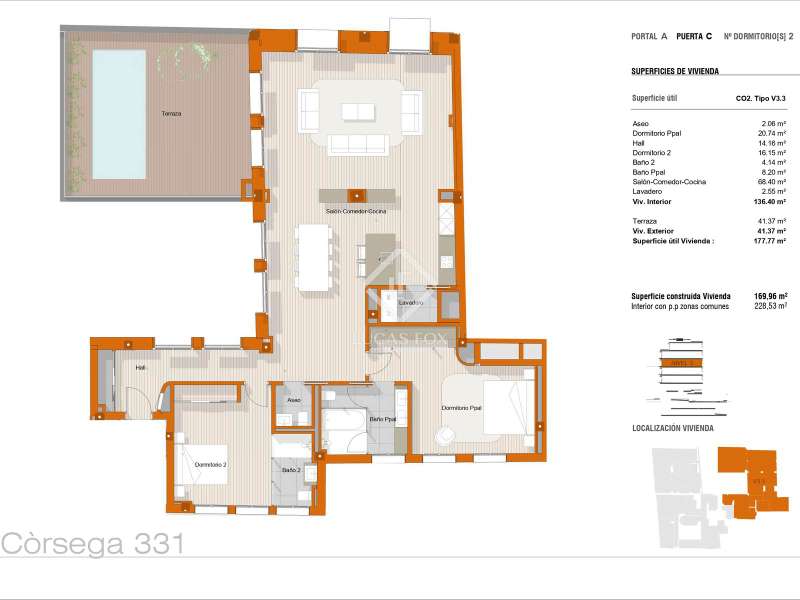 Corcega 331 is a very special new development located next to the prestigious Passeig de Gracia and Avinguda Diagonal, two of Barcelona's most popular and important boulevards, home to many architectural marvels and an abundance of services, restaurants and high-end shops. This building, with an attractive façade, has undergone an ambitious refurbishment project which has resulted in contemporary, avant-garde interiors with state-of-the-art materials by brands such as Gunni&Trentino, green areas and all modern urban comforts, making it a true oasis at the heart of the city. Parking spaces are provided in the same building and the ground floor provides exceptional communal facilities, including a gym, spa, pool, a lounge and a coworking area. The development offers this exquisitely finished brand-new home with an open-plan living room, dining room and kitchen with access to the terrace, 2 bedrooms, 3 bathrooms and a laundry room. These spacious, light-filled homes feature open-plan living spaces with modern, functional kitchens. The bedrooms have been designed to maximise comfort and peace, for a good night's sleep and the bathrooms are finished with elegant, high-end materials, fixtures and fittings. Please contact us for further information regarding this outstanding new residences with excellent communal facilities, in an enviable location in the city.
